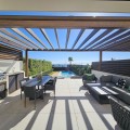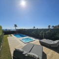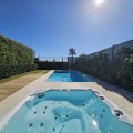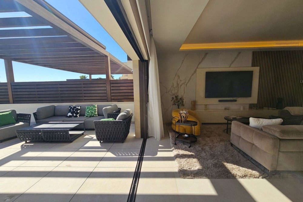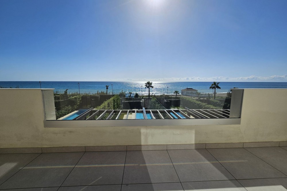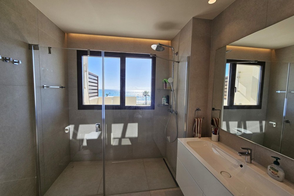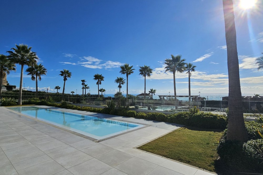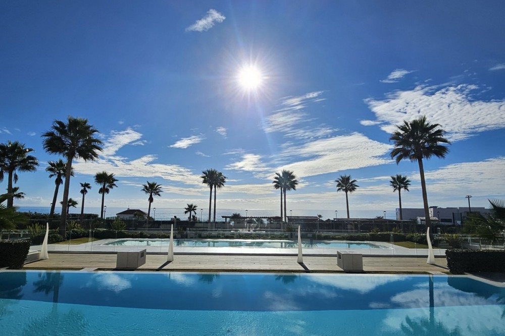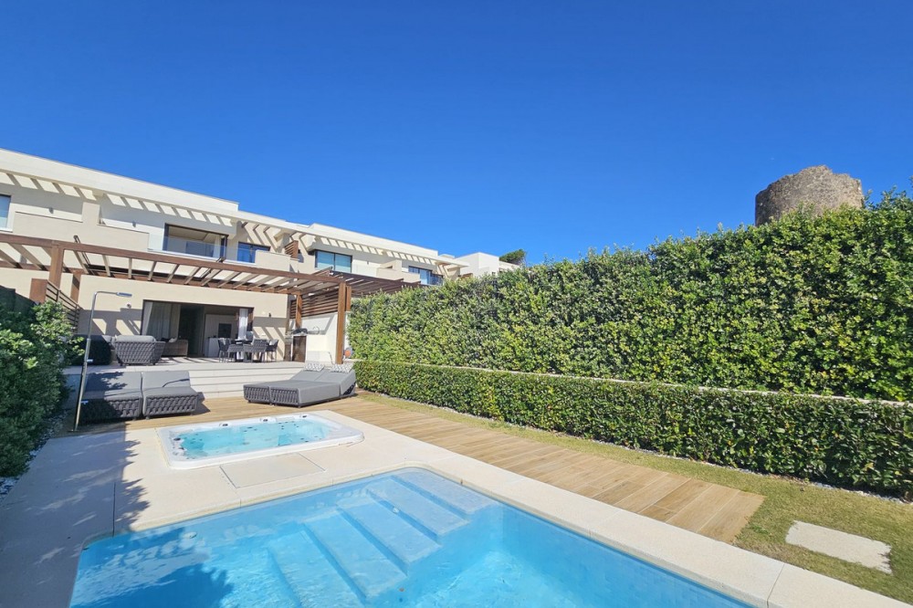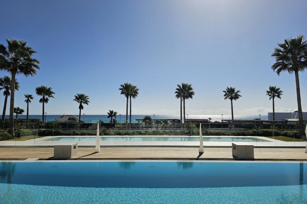 - This beautiful house is located in an enviable beachfront position within the prestigious Velaya development on the New Golden Mile, offering breathtaking sea views and direct access to the beach. The property is spread over 3 floors taking full advantage of its south orientation, with fabulous views and all day sun. On entering, you are immediately greeted with the most stunning views across the garden to the sea. The ground floor offers a contemporary open plan living area with a sleek minimalist style kitchen and central island. The terrace doors fold back into the wall providing a seamless inside outside flow onto the spacious downstairs terrace and 120m² private garden with summer kitchen, private pool and Jacuzzi. On the ground floor there is also a double bedroom and full bathroom with shower. This bedroom would be very useful for those with family facing mobility difficulties, or, for those simply preferring a single floor style of living. There is also a further office/snug room that, if needed, could be closed up to create a 4th bedroom. On the first floor, you are greeted by an amazing master bedroom suite with private terrace overlooking the Mediterranean, an ensuite bathroom with stunning views and a dressing area. Again the pocket terrace doors fold away into the walls, giving that indoor outdoor feeling, and allowing you to lie in bed and immerse yourself in the view. There is a second guest bedroom on this level with ensuite bathroom, dressing area and private terrace. Downstairs in the basement is the fourth full bathroom and laundry room. The basement covers an area of 106m² and could be turned into more bedrooms, a cinema room, private gym, storage, kids area; whatever the new owner requires. Potentially this property could have 6 bedrooms with very little effort allowing larger families or those with staff to use this property to its full potential. The current owners have spared no expense in furnishing this home, with high end furniture from a well known interior designer, beautiful textured walls and carpeted staircases. Being sold fully furnished allows the new owners to acquire a key-ready beach front house which can be used in comfort from day 1. Included in the price are 2 underground parking spaces. Some feature of this exclusive property include: Under floor heating throughout, hot and cold A/C throughout, pocket terrace doors, electric blinds and shutters, domotics and smart control, private pool, private Jacuzzi, summer kitchen, a 120m ² private garden, 4 full bathrooms with walk in showers, fully fitted kitchen with island, direct access to the beach and scope to create more rooms if needed. The gated community is just as impressive as the house. It is recognised as one of the most exclusive coastal developments on the Costa del Sol. Spanning approximately 15,000m² this seafront development offers its residents a luxurious beach lifestyle. It boasts a heated outdoor infinity swimming pool, day beds, a children's swimming pool and playground, concierge services, tennis court, padel court, gym, Jacuzzi, outdoor kitchen and BBQ pavilion, and, of course, direct access to the beach and the beautiful promenade. The urbanisation is known for its quality and beautiful style of architecture using natural stone to enhance the serene beach feel and was constructed with a commitment to the environment, promoting a more sustainable construction. Location wise the urbanisation is ideal for families or those who want to disconnect but still want to be close to amenities. Located close to International Schools, golf courses, supermarkets, beach clubs, restaurants, and two towns (Estepona and San Pedro) you will have everything at your fingertips should you get tired of the sound of the waves. Marbella and Puerto Banus area 15 minutes away. Malaga airport is only 40 mins away as is Gibraltar airport. This property is a truly exceptional home offering a modern lifestyle with sensational views all wrapped up in a luxurious finish.