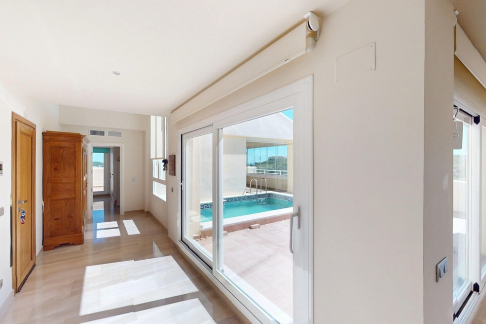 - This contemporary penthouse in Mijas, Málaga, offers a harmonious blend of comfort and style. It is located directly on a golf course and offers an impressive view of the sea, so you can enjoy both the tranquillity of the green and the panorama of the coast. The open-plan living area features floor-to-ceiling windows that flood the space with natural light and provide stunning panoramic views of the surrounding landscape. The living room is tastefully furnished with a plush white sectional sofa, accented by vibrant area rugs that add warmth to the polished floors. The sleek kitchen boasts modern navy cabinetry contrasted with white countertops and high-end stainless steel appliances, creating a sophisticated culinary space. The penthouse's three bathrooms are elegantly appointed, with one showcasing a floating double vanity in rich wood tones and a glass-enclosed shower. The primary bedroom is a serene retreat with direct access to a private terrace. It features a canopied bed, a spacious walk-in closet, and a luxurious en-suite bathroom with both a bathtub and a shower. The second bedroom offers equally impressive views and is furnished with a comfortable double bed. A dedicated office space provides a functional work area with a modern desk setup and ample natural light. The crowning feature of this property is the private terrace, complete with a swimming pool and expansive views of the surrounding hills and greenery. Additionally, the penthouse includes two parking spaces and two storage rooms. Residents also have access to excellent communal amenities, including a large swimming pool, a heated pool, and an outdoor kitchen that can be used by everyone. With its thoughtful layout, luxurious amenities, and prime location in Urbanización Cerrado del Águila, this penthouse offers a perfect balance of indoor comfort and outdoor living in the heart of Costa del Sol. We are pleased to be able to present this dream property to you soon, either personally or via virtual viewing. Because this world is unique - just like our Axarquía. In Andalusia. On the Costa del Sol. Here, on the sunny side of life...