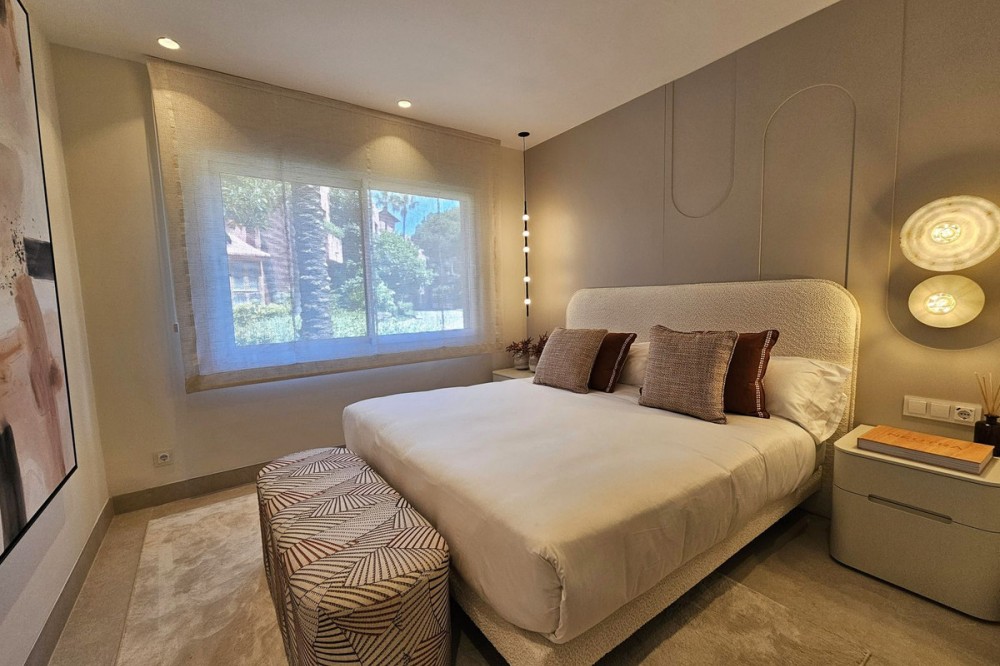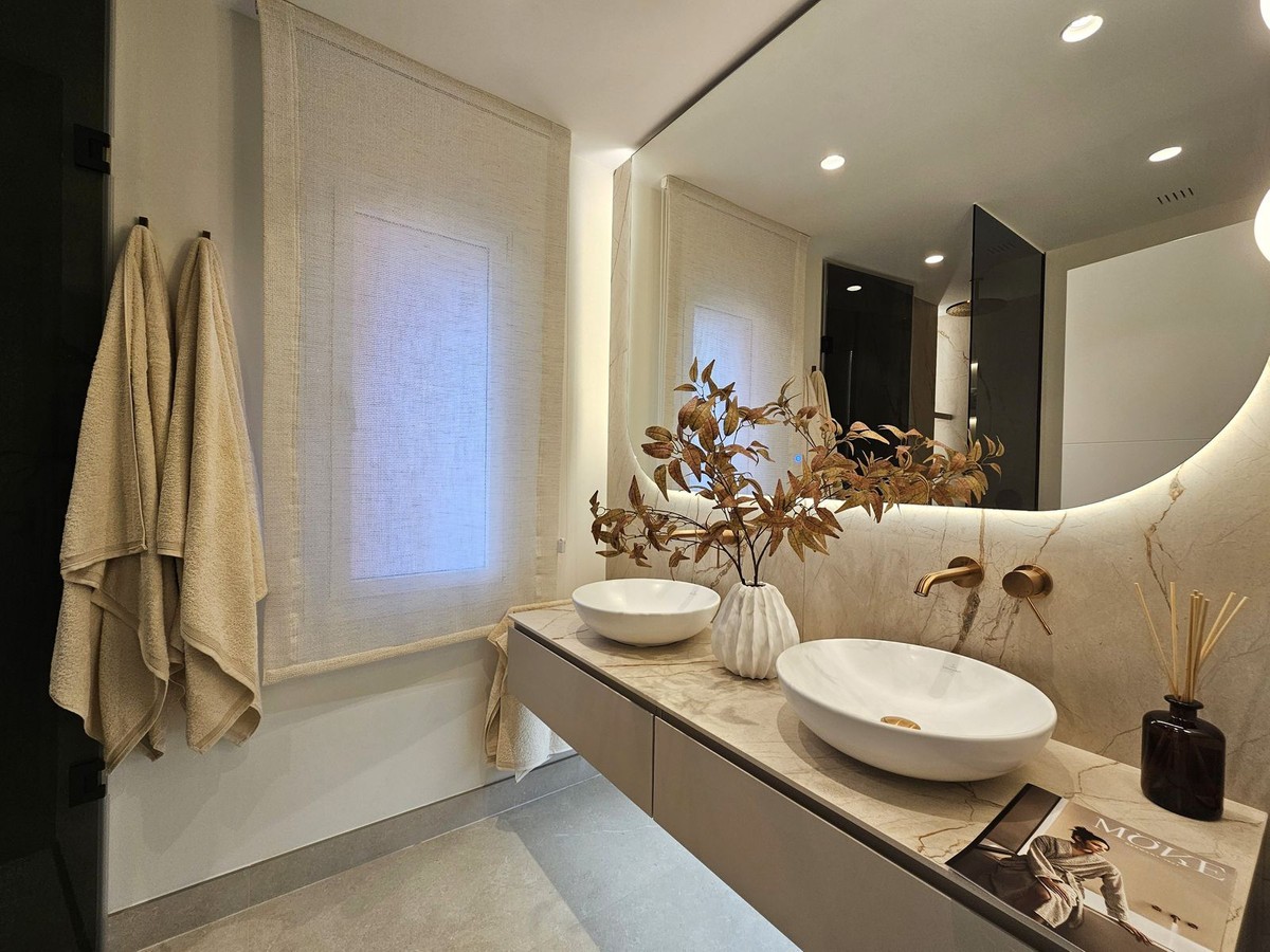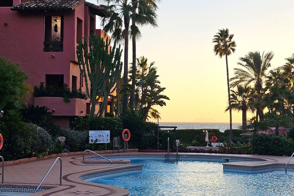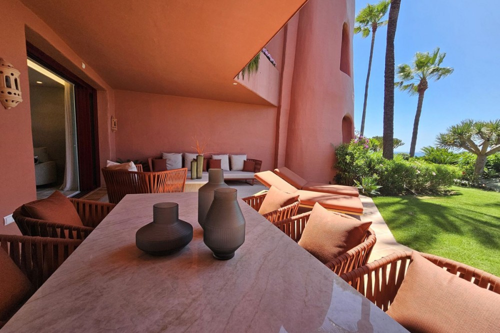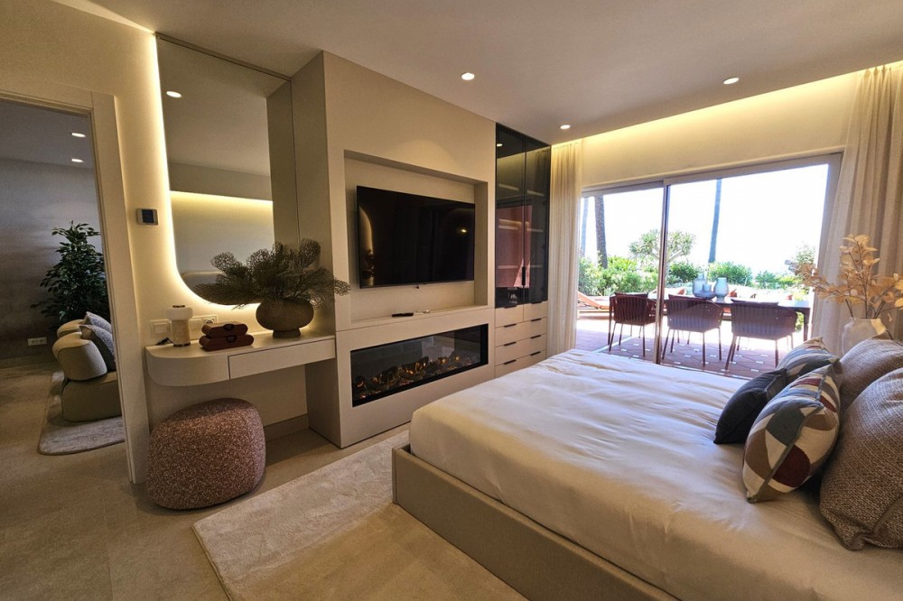 - Stylish Beachfront Living on the New Golden Mile If you are after a relaxed, high-end lifestyle by the sea, this fully renovated beachfront apartment may be just the thing. Tucked away in one of Estepona’s most desirable spots—the New Golden Mile—this place blends modern comfort with a touch of elegance, all right on the Mediterranean. Walking in, you are met with stunning sea views stretching out to the horizon. The living space opens straight onto a large private terrace, making it easy to enjoy that indoor-outdoor lifestyle, whether you're winding down or hosting friends. The sound of the waves in the background just adds to the calm. The apartment has been updated throughout with smart, top-quality features. A premium B&O sound system is built in, giving you rich sound in every corner. The kitchen is sleek and modern, with an invisible hob, wine fridge, and stylish finishes that are both practical and good-looking. There’s a cosy electric fireplace in the lounge, perfect for cooler evenings. The main bedroom includes a spacious walk-in wardrobe—ideal for keeping your clothes and accessories well organised. A hidden laundry area means everything stays tidy and clutter-free, keeping the clean lines and modern feel intact. Menara Beach is a secure, gated community with beautifully kept gardens and direct access to the beach. You’ll have use of two outdoor swimming pools surrounded by palms, plus an indoor heated pool, a gym, and a sauna. The vibe is peaceful and friendly, with a real sense of community among the residents. Whether you're looking for a full-time home by the sea, a stylish getaway, or a smart investment on the Costa del Sol, this apartment offers a standout mix of location, lifestyle, and modern design.