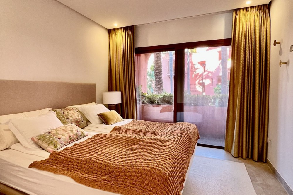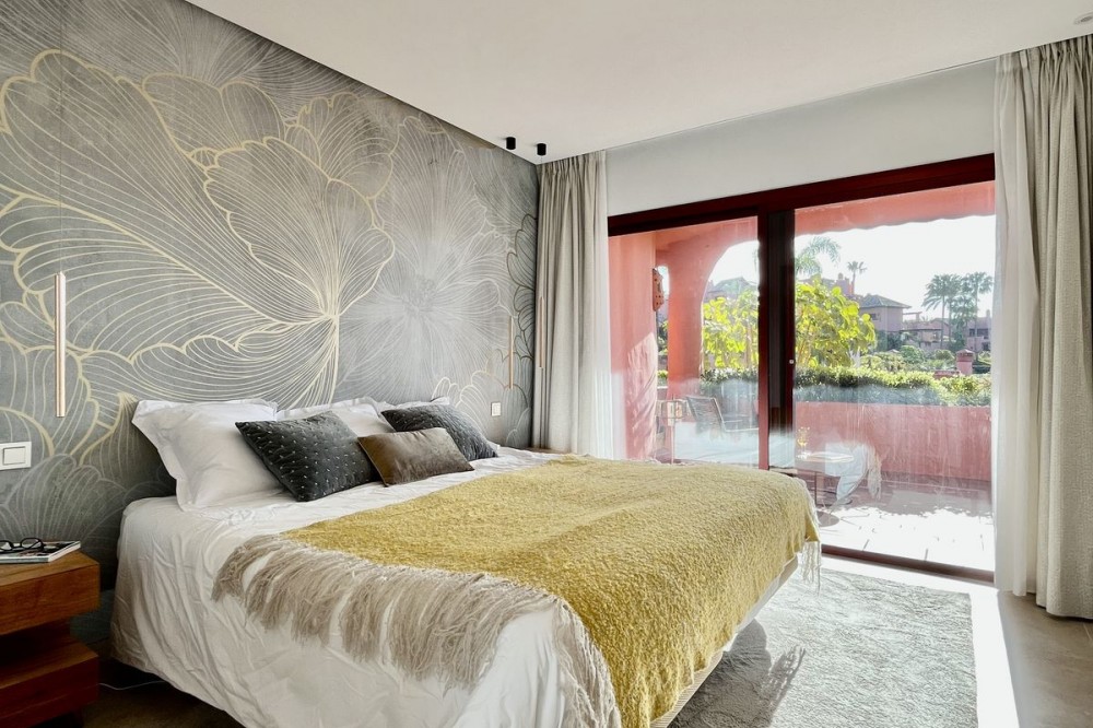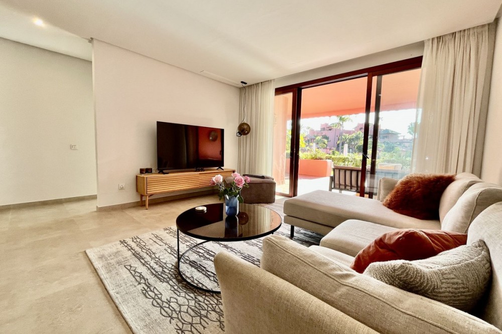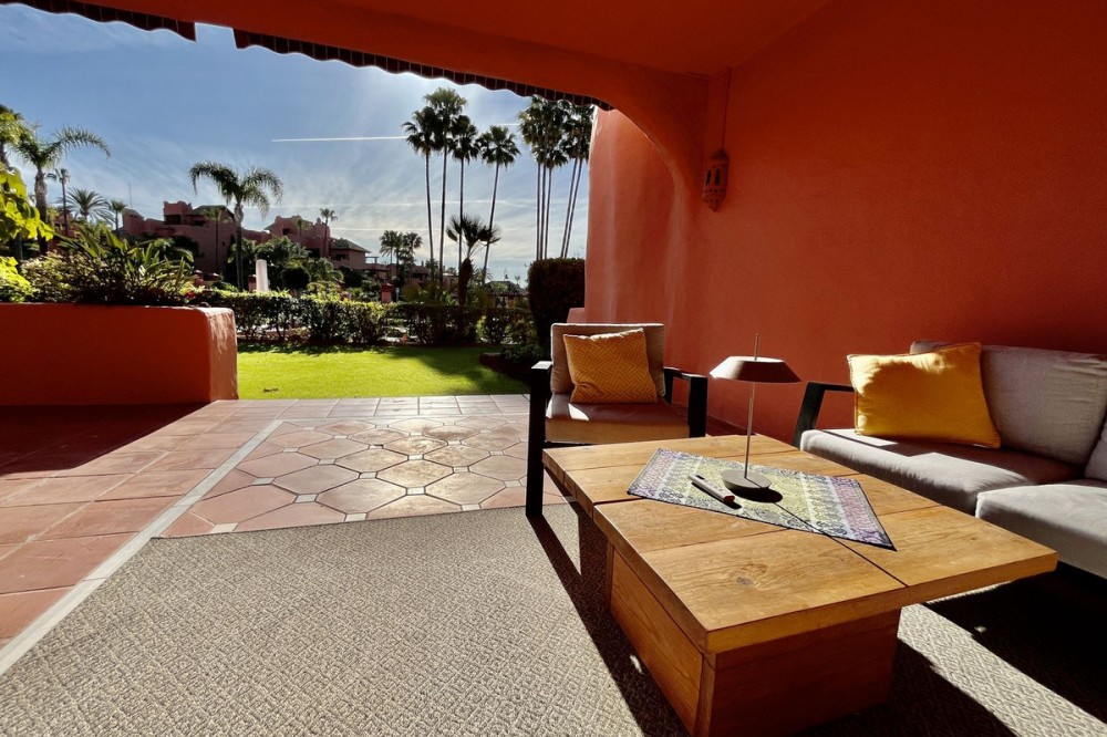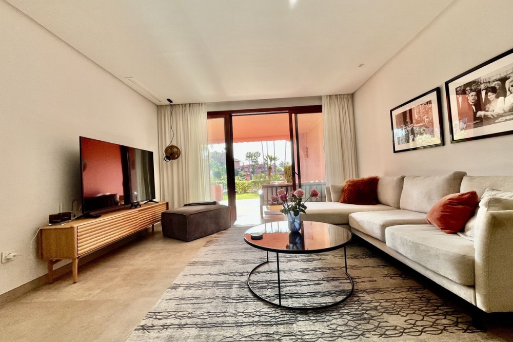 - Exclusive Ground Floor Apartment in Estepona, Costa del Sol, with 3 Bedrooms, 2 Bathrooms, Built 129 m², Terrace 42 m². Gated Community, beach front. Setting : Beachfront, Close To Sea, Close To Town, Close To Schools, Urbanisation, Front Line Beach Complex. Orientation : East, South East. Condition : Excellent. Pool : Communal, Heated, Children`s Pool. Climate Control : Air Conditioning, Hot A/C, U/F Heating, U/F/H Bathrooms. Views : Sea, Garden, Pool. Features : Covered Terrace, Lift, Fitted Wardrobes, Near Transport, Private Terrace, Satellite TV, WiFi, Storage Room, Ensuite Bathroom, Access for people with reduced mobility, Double Glazing, 24 Hour Reception, Near Church, Fiber Optic. Furniture : Part Furnished. Kitchen : Fully Fitted. Garden : Communal. Security : Gated Complex, Electric Blinds, Entry Phone, Alarm System, 24 Hour Security. Parking : Underground, Garage, Covered, Private. Utilities : Electricity, Drinkable Water, Telephone, Photovoltaic solar panels. Category : Beachfront, Luxury.