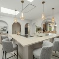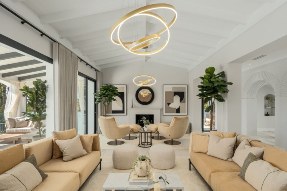 - This villa is a charming Mediterranean retreat that seamlessly blends traditional style with refined contemporary touches. Located on a spacious plot of over 1,000 m² within the prestigious gated community of Altos Reales, on Marbella's coveted Golden Mile, this exceptional property offers an atmosphere of tranquility and luxury. Its manicured gardens create a lush setting ideal for relaxation, complemented by a private pool and inviting outdoor jacuzzi. The spacious terraces have been designed with al fresco entertaining in mind, providing a perfect setting for gatherings surrounded by the area's natural charm. Inside, the villa displays an impeccable design with a neutral color palette that enhances a sense of calm from the first moment. Mediterranean architectural elements, such as elegant arches, harmoniously connect the spaces, maintaining an open and flowing layout. The living area stands out for its high ceilings with white-painted wooden beams, paying homage to the property's Andalusian character. The modern and functional kitchen is equipped with high-end appliances and features a central island that combines functionality and style as a culinary space and informal dining area. The villa features five carefully decorated bedrooms, ensuring privacy and comfort. The master suite offers direct access to a private conservatory and a luxurious en suite bathroom. Every corner has been designed to offer an elegant, warm, and sophisticated living experience in one of Marbella's most exclusive settings.