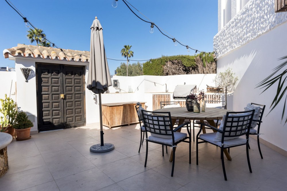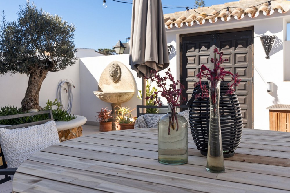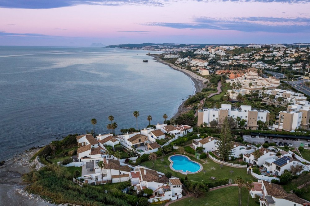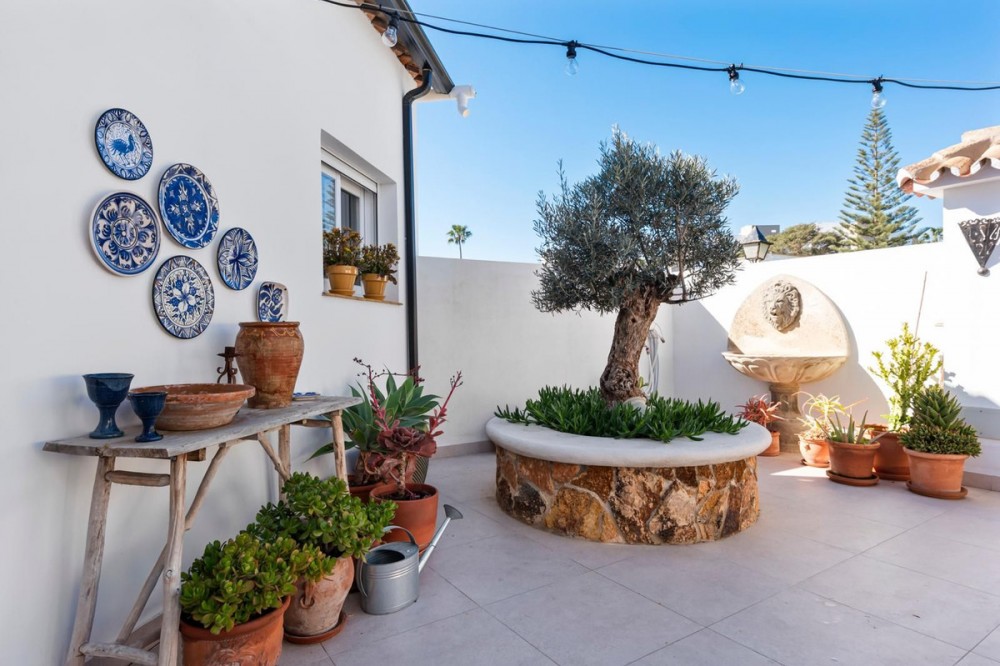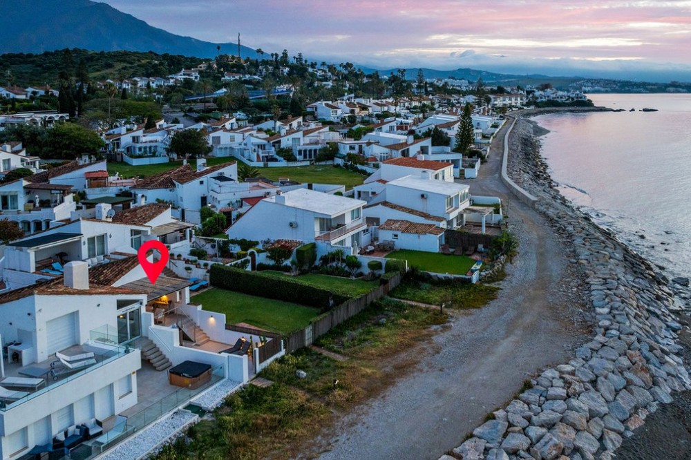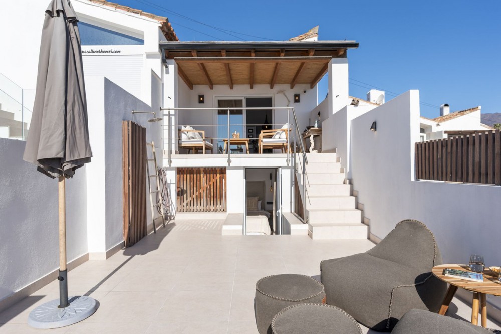 - Exceptional Frontline Luxury Beach Townhouse in Bahia Dorada Discover the epitome of luxury coastal living with this newly reformed duplex townhouse, nestled right on the beachfront in the prestigious Bahia Dorada. Offering breathtaking sea views, direct access to the promenade and beach, and a tranquil Andalusian ambiance, this exquisite 2-bedroom, 2-bathroom home is a true dream come true. Upon arrival, you are welcomed through a stunningly staged courtyard, centered around a majestic olive tree, creating a serene and inviting atmosphere. This gorgeous outdoor space is designed for alfresco living, featuring a BBQ and outdoor dining area, a dedicated prep station, a charming fountain, and exquisite décor including lush pot plants, authentic Andalusian wall-mounted plates, and unique handcrafted pieces. The front open terrace directly faces the golden sands and turquoise waters, offering an elegant outdoor lounge and chill area, where you can soak in the panoramic sea views. Adorned with soft dim lighting, vibrant greenery, and a refreshing outdoor shower, this is the perfect place to unwind. Above, the elevated covered terrace provides a sophisticated sitting area, complete with comfortable sofas and a stylish coffee table, where you can enjoy unparalleled sea and beach views from the privacy of your own retreat. Inside, the home is finished to the highest standards, featuring state of the art sound, smart home automation, air-conditioning, and bespoke interior design. Every detail has been carefully curated to blend modern luxury with timeless Andalusian charm. Perfect as a romantic getaway, a high-end holiday home, or an idyllic beachfront retreat, this turnkey-ready property is just 5 minutes from Estepona Port and close to all amenities. A rare opportunity to own a piece of paradise on the Costa del Sol!