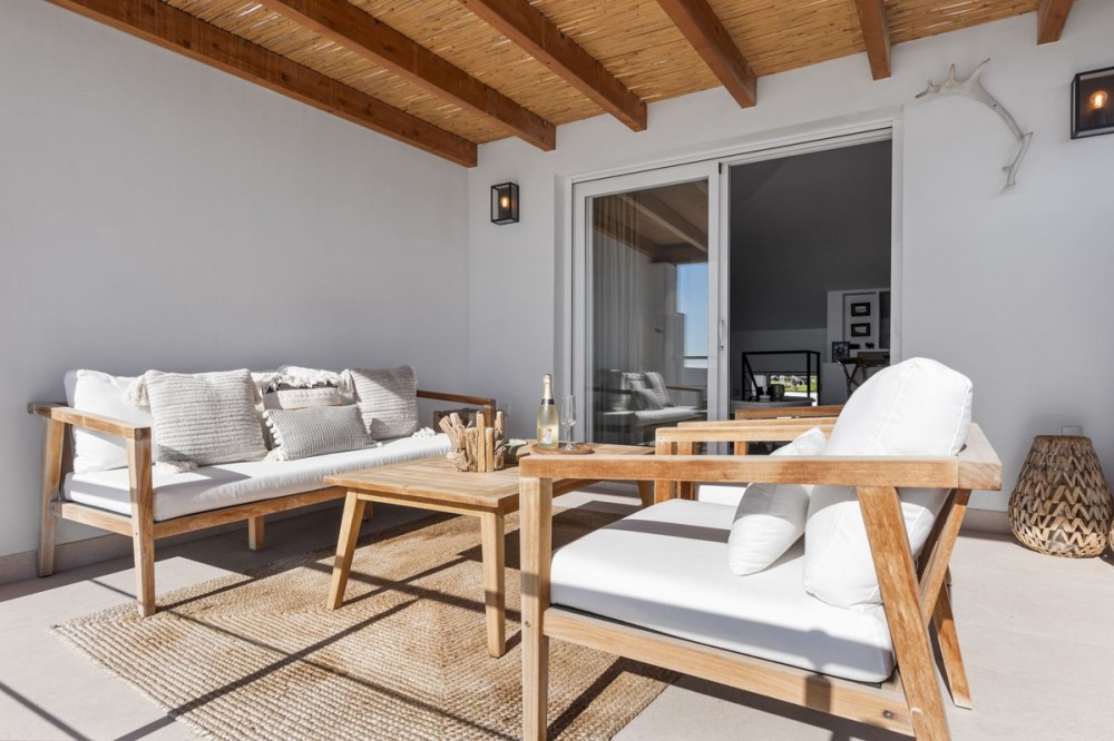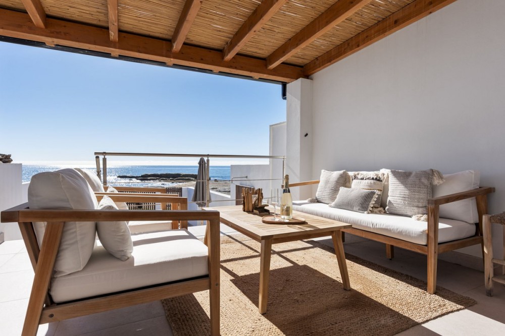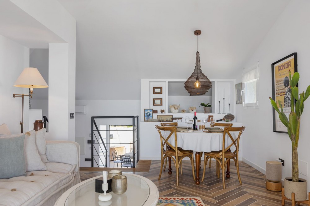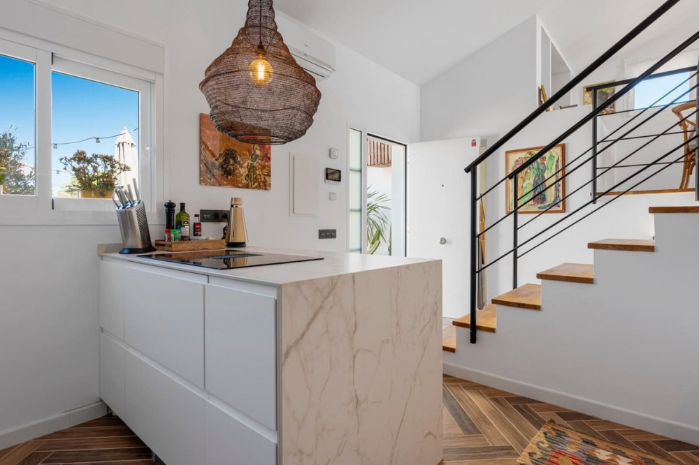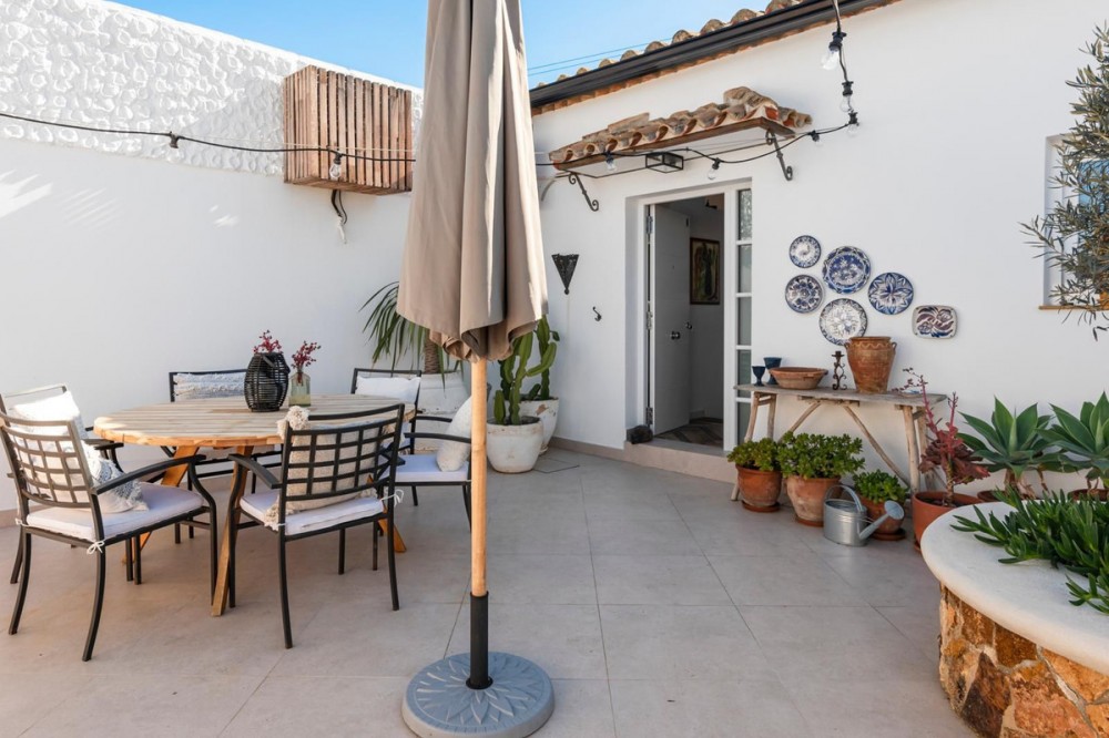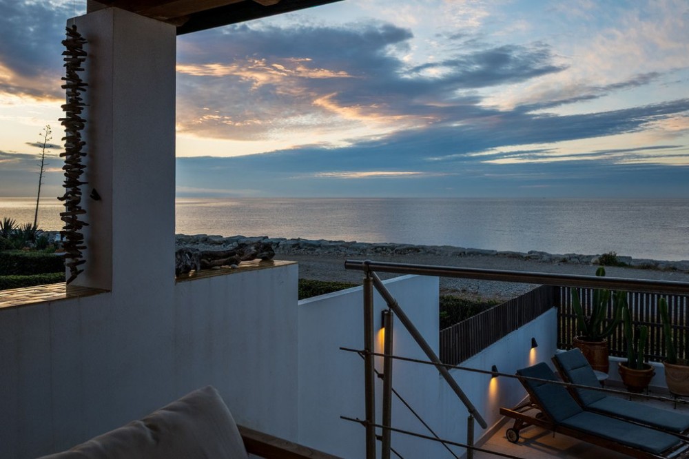 - Exceptional Frontline Luxury Beach Townhouse in Bahia Dorada Discover the epitome of luxury coastal living with this newly reformed duplex townhouse, nestled right on the beachfront in the prestigious Bahia Dorada. Offering breathtaking sea views, direct access to the promenade and beach, and a tranquil Andalusian ambiance, this exquisite 2-bedroom, 2-bathroom home is a true dream come true. Upon arrival, you are welcomed through a stunningly staged courtyard, centered around a majestic olive tree, creating a serene and inviting atmosphere. This gorgeous outdoor space is designed for alfresco living, featuring a BBQ and outdoor dining area, a dedicated prep station, a charming fountain, and exquisite décor including lush pot plants, authentic Andalusian wall-mounted plates, and unique handcrafted pieces. The front open terrace directly faces the golden sands and turquoise waters, offering an elegant outdoor lounge and chill area, where you can soak in the panoramic sea views. Adorned with soft dim lighting, vibrant greenery, and a refreshing outdoor shower, this is the perfect place to unwind. Above, the elevated covered terrace provides a sophisticated sitting area, complete with comfortable sofas and a stylish coffee table, where you can enjoy unparalleled sea and beach views from the privacy of your own retreat. Inside, the home is finished to the highest standards, featuring state of the art sound, smart home automation, air-conditioning, and bespoke interior design. Every detail has been carefully curated to blend modern luxury with timeless Andalusian charm. Perfect as a romantic getaway, a high-end holiday home, or an idyllic beachfront retreat, this turnkey-ready property is just 5 minutes from Estepona Port and close to all amenities. A rare opportunity to own a piece of paradise on the Costa del Sol!