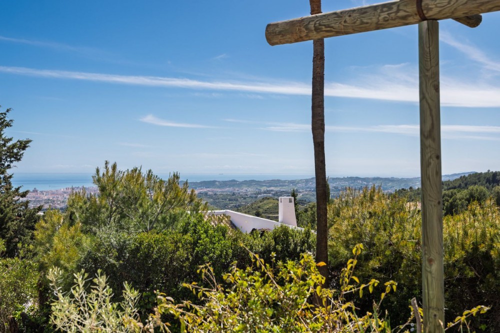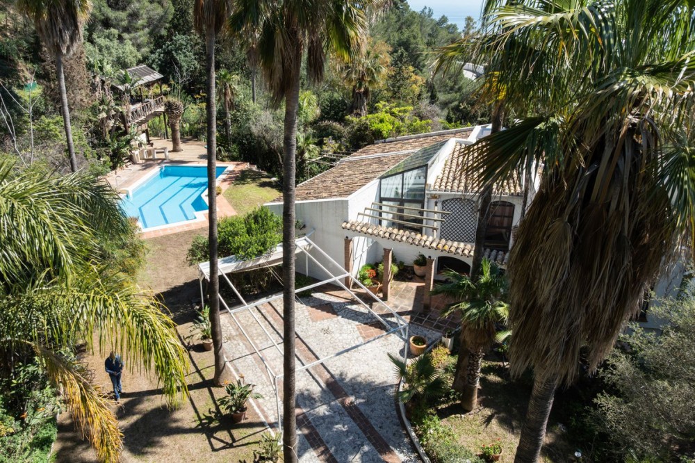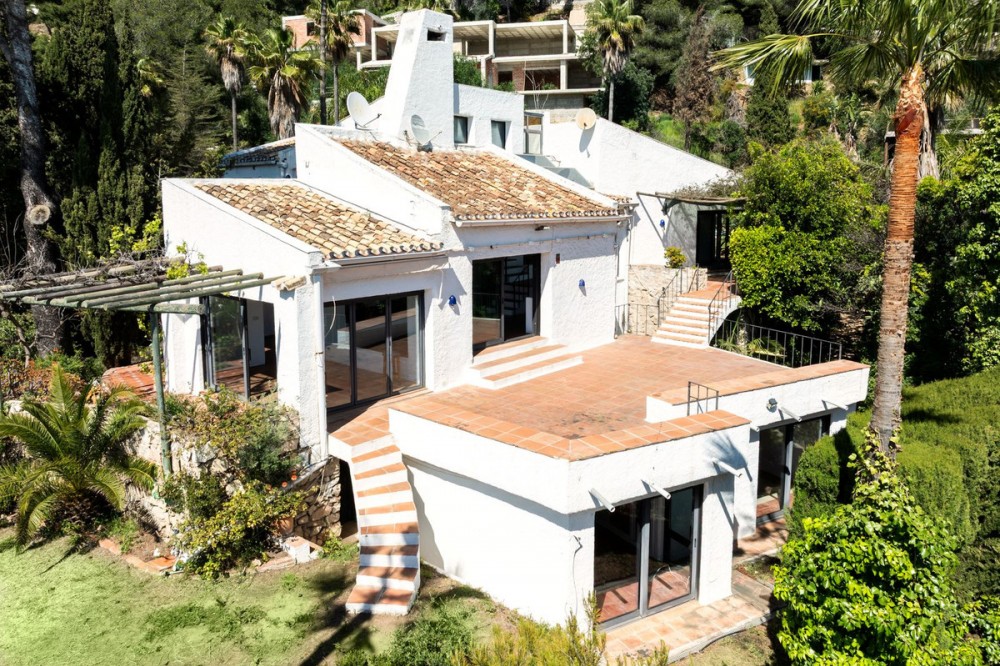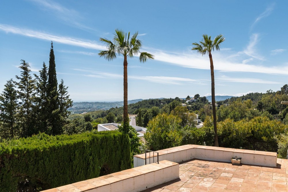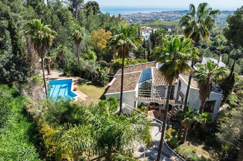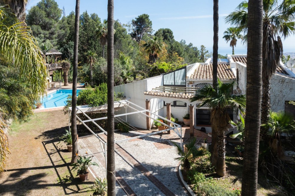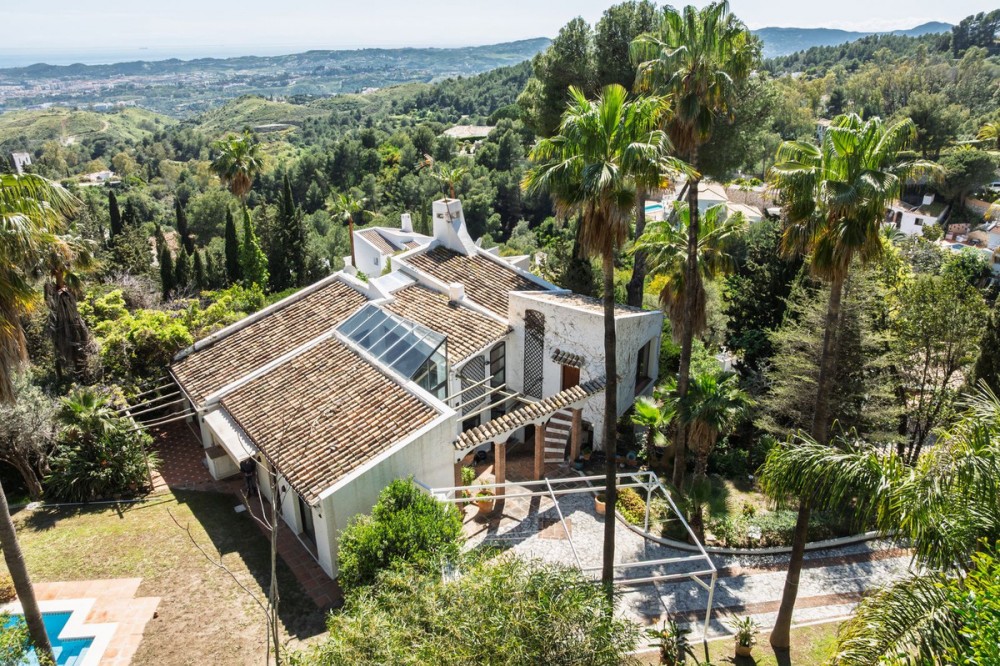 - A unique villa to renovate, surrounded by palm trees with amazing sea and mountain views in the highly sought-after Las Lomas de Mijas – An opportunity to create a dream home. WITH TOURIST LICENSE Located in the prestigious Las Lomas de Mijas neighborhood, just a few minutes’ drive from both the charming Mijas Pueblo and the coastal town of Fuengirola, this spacious villa from 1970 offers a rare combination of location, space, and great potential. Property Features: Plot: 2,194 m² with lush, mature landscaping Built area: 379 m² Terraces: 92 m² with views of the sea and mountains The villa has 9 separate rooms South- and west-facing terraces for all-day sun and unforgettable sunsets Large private pool with a wooden garden house Two separate garages, measuring 50 m² and 25 m² Layout: The ground floor welcomes you with a grand entrance hall, followed by a sunken room overlooking the whole area of Mijas all the way to the sea, a spacious living room, dining room, and a separate kitchen with utility room. From the hallway there's a raised section with 3 rooms and its own entrance – ideal as a guest wing or home office. Also on this level are 3 bedrooms (with jacuzzi) and 2 bathrooms. On the lower floor you’ll find 2 additional bedrooms (one with a sauna), 2 bathrooms, and a large storage room with a wine cellar. What makes this villa special: Although the property is in need of renovation and modernization, it offers a fantastic opportunity to fully recreate it according to your own style and needs. The location, generous size, sea views, and beautiful garden make this a unique find in the area. The south-facing terrace ensures plenty of natural light, while the west-facing terrace offers spectacular sunsets with views of Mijas Pueblo and the Sierra de Mijas mountains. An excellent investment – once renovated, this villa will significantly increase in value. Don’t miss this rare opportunity to create your dream villa on the Costa del Sol!