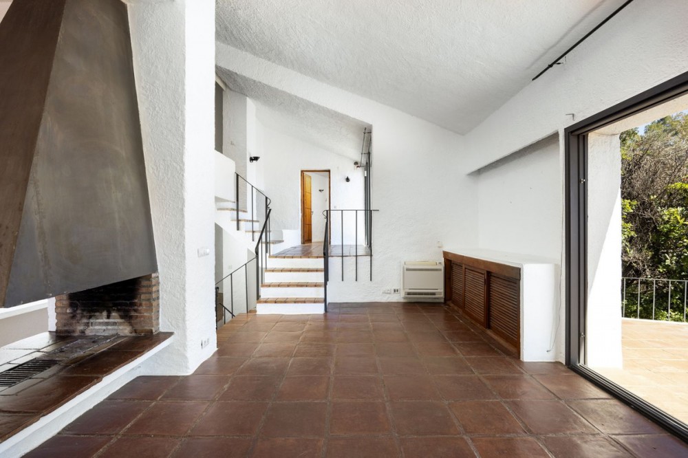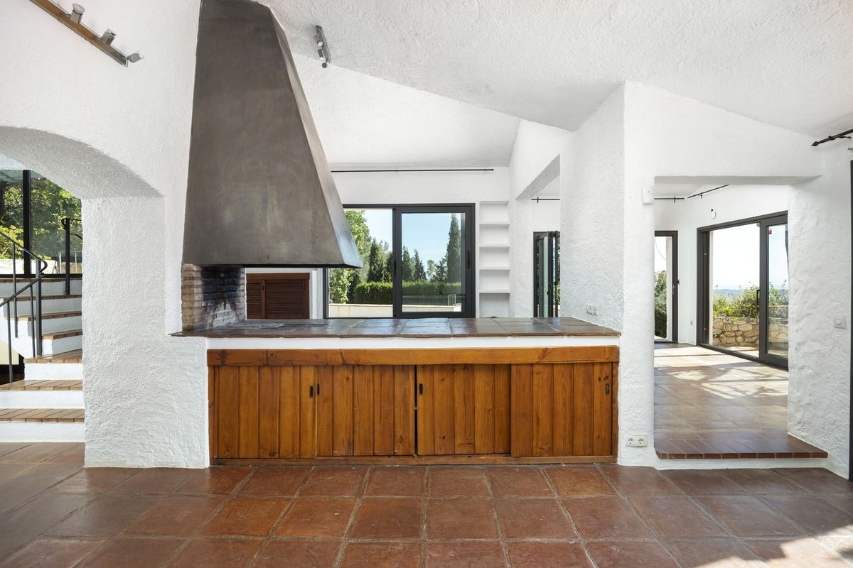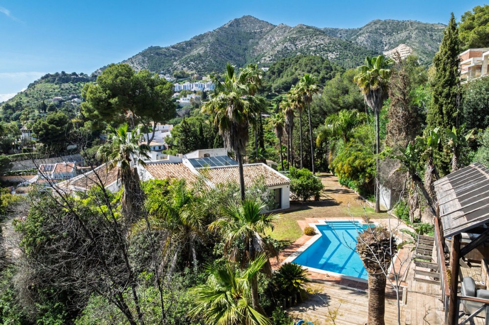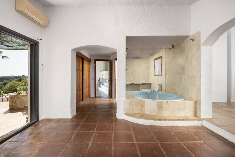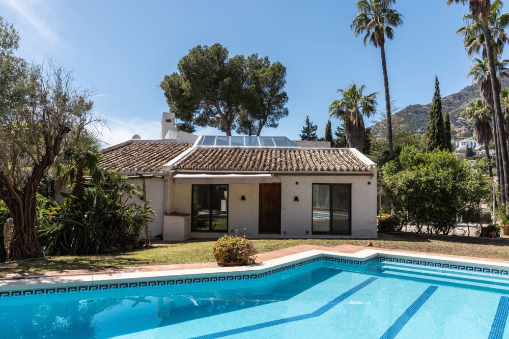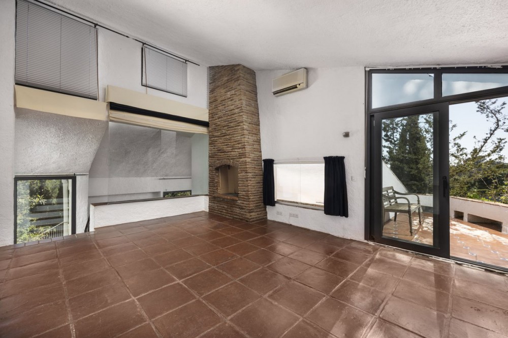 - A unique villa to renovate, surrounded by palm trees with amazing sea and mountain views in the highly sought-after Las Lomas de Mijas – An opportunity to create a dream home. WITH TOURIST LICENSE Located in the prestigious Las Lomas de Mijas neighborhood, just a few minutes’ drive from both the charming Mijas Pueblo and the coastal town of Fuengirola, this spacious villa from 1970 offers a rare combination of location, space, and great potential. Property Features: Plot: 2,194 m² with lush, mature landscaping Built area: 379 m² Terraces: 92 m² with views of the sea and mountains The villa has 9 separate rooms South- and west-facing terraces for all-day sun and unforgettable sunsets Large private pool with a wooden garden house Two separate garages, measuring 50 m² and 25 m² Layout: The ground floor welcomes you with a grand entrance hall, followed by a sunken room overlooking the whole area of Mijas all the way to the sea, a spacious living room, dining room, and a separate kitchen with utility room. From the hallway there's a raised section with 3 rooms and its own entrance – ideal as a guest wing or home office. Also on this level are 3 bedrooms (with jacuzzi) and 2 bathrooms. On the lower floor you’ll find 2 additional bedrooms (one with a sauna), 2 bathrooms, and a large storage room with a wine cellar. What makes this villa special: Although the property is in need of renovation and modernization, it offers a fantastic opportunity to fully recreate it according to your own style and needs. The location, generous size, sea views, and beautiful garden make this a unique find in the area. The south-facing terrace ensures plenty of natural light, while the west-facing terrace offers spectacular sunsets with views of Mijas Pueblo and the Sierra de Mijas mountains. An excellent investment – once renovated, this villa will significantly increase in value. Don’t miss this rare opportunity to create your dream villa on the Costa del Sol!