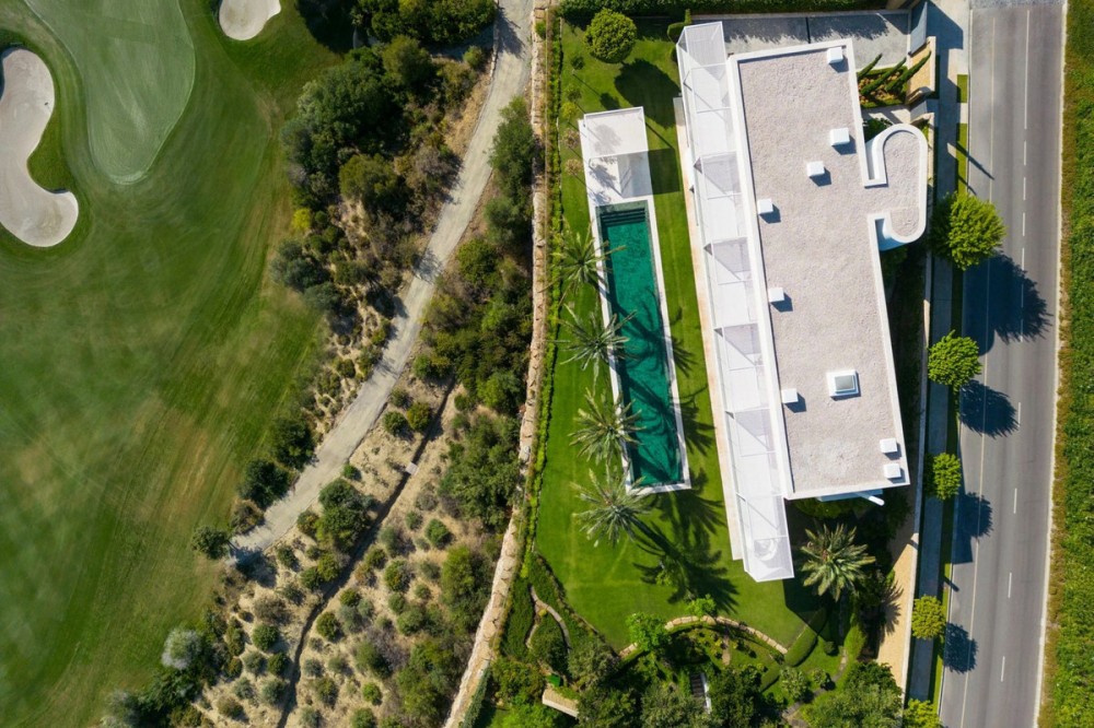 • Perched on an elevated plot within the prestigious Finca Cortesin Resort, this remarkable villa blends architectural elegance with unmatched views of the Mediterranean and golf course. Surrounded by lush gardens and towering palms, the home offers seamless indoor-outdoor living, with expansive terraces and a stunning pool creating a private oasis. Designed by renowned architects Vicens & Ramos, the villa spans three levels. The ground floor features open-concept living bathed in natural light, with floor-to-ceiling glass doors, bespoke interiors in soft neutral tones, and a state-of-the-art Gaggenau kitchen. The upper level hosts serene bedrooms, each with a private terrace, while the basement includes a hidden-entry wine cellar, laundry, and utility rooms. A showcase of sophistication and exclusivity, this frontline golf property sets a new benchmark for luxury living on the Costa del Sol.