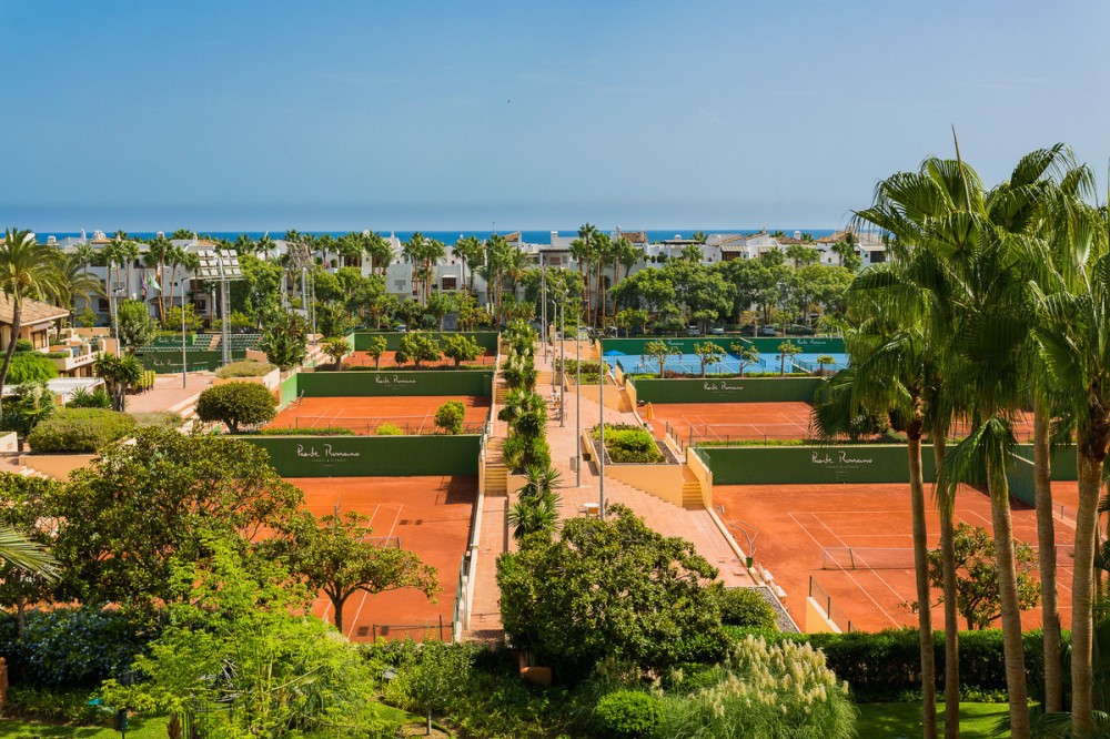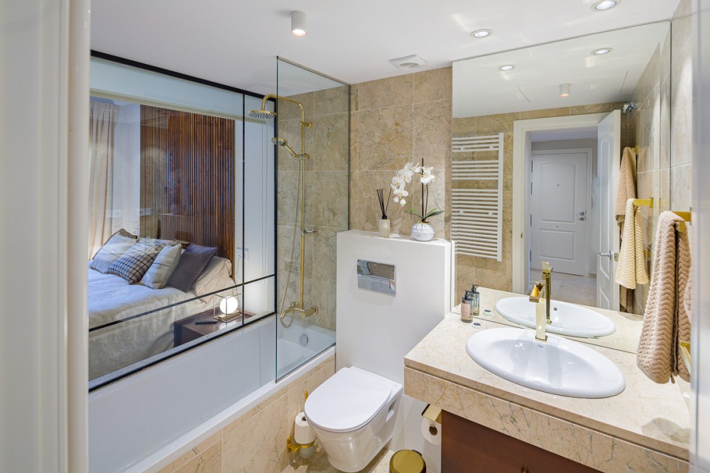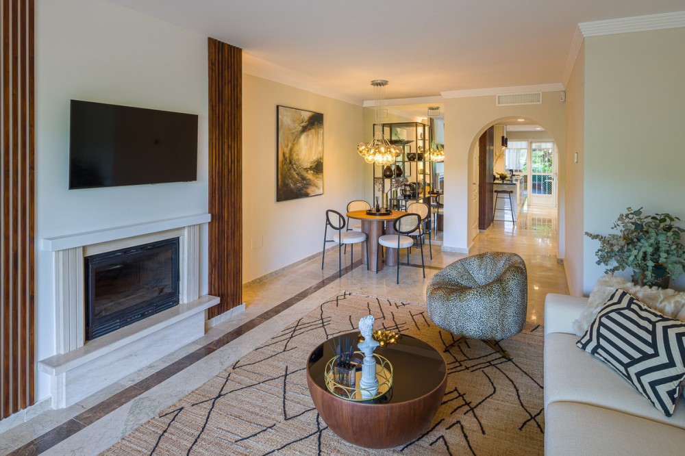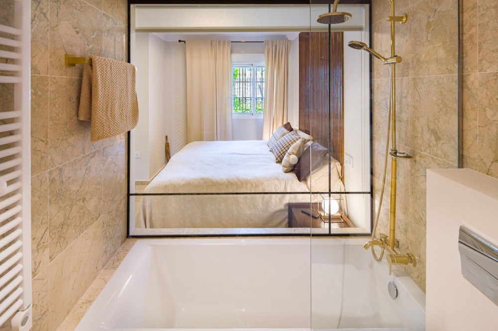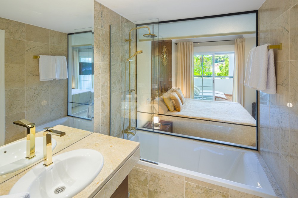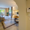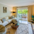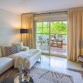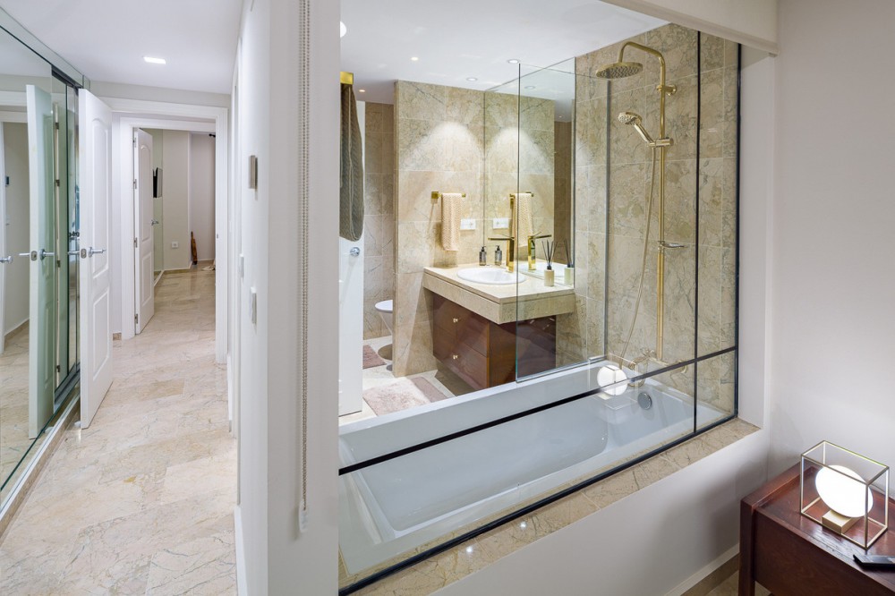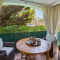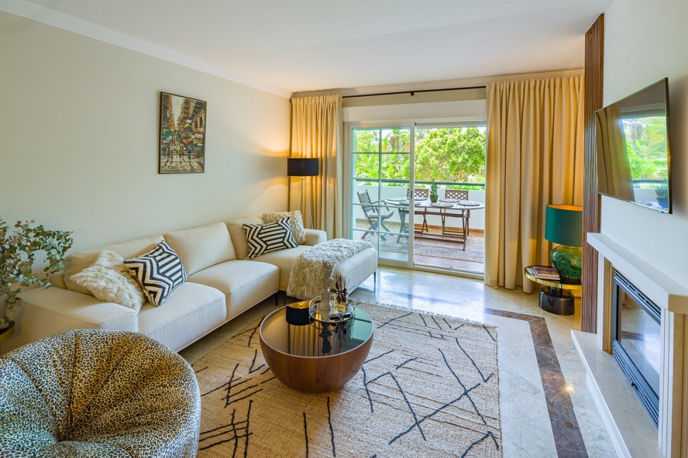- Newly renovated Luxury design, cozy apartment in prestigious Marbella Golden Mile urbanization "Balcon de Puente Romano", next to “Puente Romano Nobu”, “Marbella Club”, the beach and sea - 3-5 min walking distance. Bright and spacious apartment with a brand-new furniture and top-quality equipment, 2 modern bedrooms, 2 bathrooms, 2 big terraces, HD TV in each room, air conditioner with 3 different climate zones, 24 h access to newly renovated swimming pool. For your comfort and luxury living in tropic garden surround. Private underground parking is included. Just finished apartment project was done by professional designers, apartment is more spacious than others, prevails luxury and modern solutions. “Eichholtz”, “Kare”, “Zuiver”, “Hoffman”, “Skyline design” - these brands are equipped with apartment. Living room spacious, comfortable sitting area (or to lie down), HD TV wall composed with fireplace decorated with hidden LED lighting. Comfortable dining area with modern chandelier and exposition, workspace. Access from the living room to a big terrace with table for 7-8 persons and 2 comfortable sunbeds, swimming pool and tropical garden view. Open modern kitchen with all top-quality equipment (dishwasher, 2 fridges, oven, induction hob, modern steam extractor, microwave and etc.), bar zone, decorated LED lighting. Access to the other terrace, equipped with 4 comfortable armchairs, table, curtains for your cozy and privacy. Storage room is hidden by mirror doors, there you find laundry room. Each of 2 Bedrooms relate to separate bathrooms by modern glass walls (installed blinds). All the bedrooms equipped HD TV’s, Master bedroom have access to the main terrace too. Spacious wardrobes.
