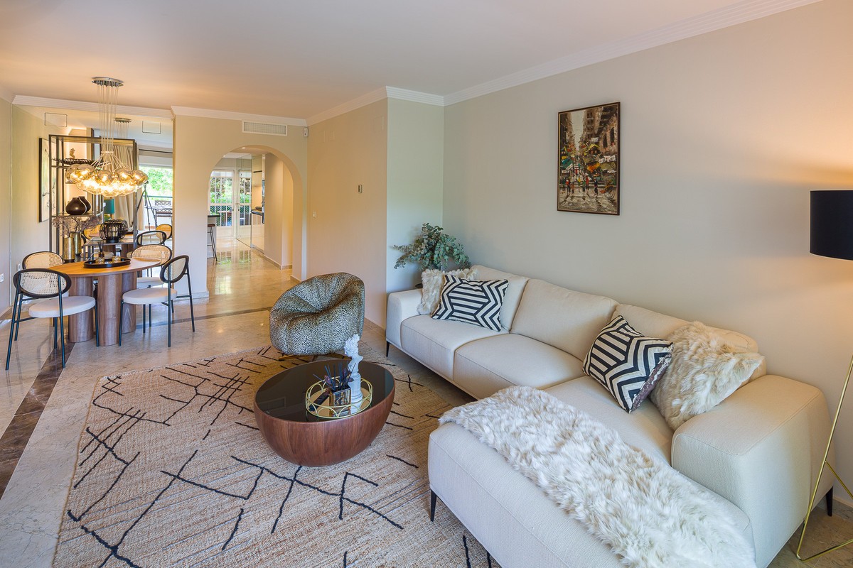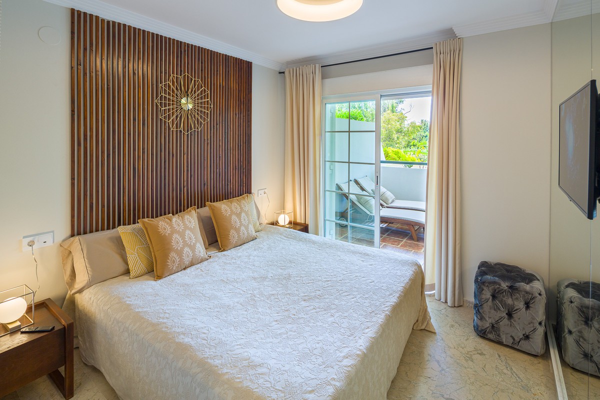 - Newly renovated Luxury design, cozy apartment in prestigious Marbella Golden Mile urbanization "Balcon de Puente Romano", next to “Puente Romano Nobu”, “Marbella Club”, the beach and sea - 3-5 min walking distance. Bright and spacious apartment with a brand-new furniture and top-quality equipment, 2 modern bedrooms, 2 bathrooms, 2 big terraces, HD TV in each room, air conditioner with 3 different climate zones, 24 h access to newly renovated swimming pool. For your comfort and luxury living in tropic garden surround. Private underground parking is included. Just finished apartment project was done by professional designers, apartment is more spacious than others, prevails luxury and modern solutions. “Eichholtz”, “Kare”, “Zuiver”, “Hoffman”, “Skyline design” - these brands are equipped with apartment. Living room spacious, comfortable sitting area (or to lie down), HD TV wall composed with fireplace decorated with hidden LED lighting. Comfortable dining area with modern chandelier and exposition, workspace. Access from the living room to a big terrace with table for 7-8 persons and 2 comfortable sunbeds, swimming pool and tropical garden view. Open modern kitchen with all top-quality equipment (dishwasher, 2 fridges, oven, induction hob, modern steam extractor, microwave and etc.), bar zone, decorated LED lighting. Access to the other terrace, equipped with 4 comfortable armchairs, table, curtains for your cozy and privacy. Storage room is hidden by mirror doors, there you find laundry room. Each of 2 Bedrooms relate to separate bathrooms by modern glass walls (installed blinds). All the bedrooms equipped HD TV’s, Master bedroom have access to the main terrace too. Spacious wardrobes.