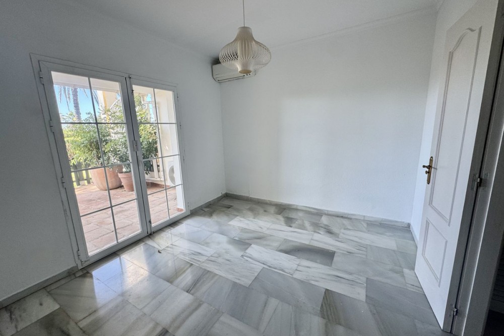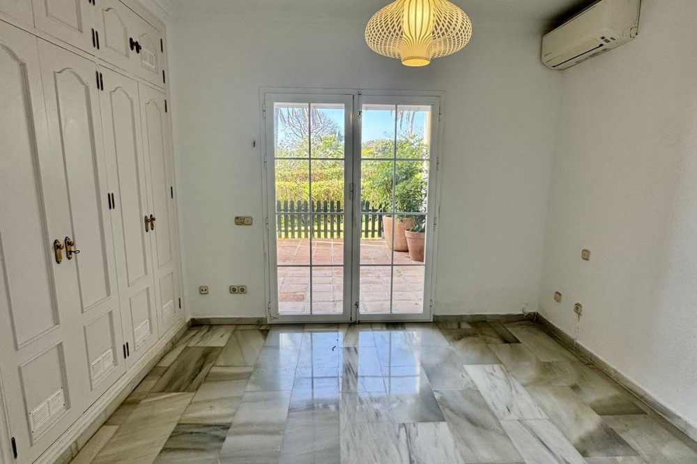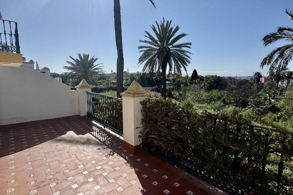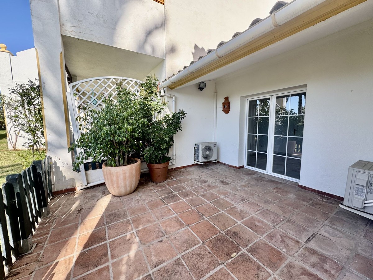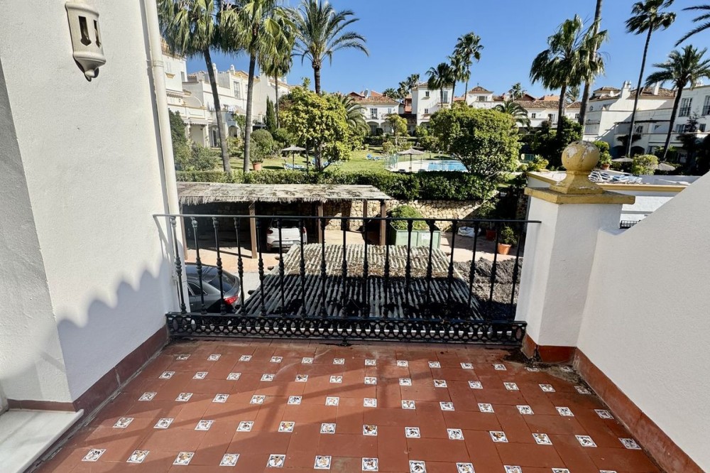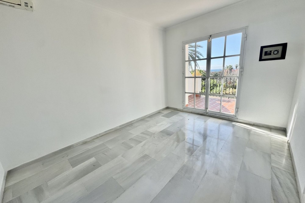 - Beautiful townhouse, in an exclusive urbanisation, Coto de la Serena in the New Golden Mile of Estepona, between Estepona and San Pedro. It has beautiful sea views from the upper floor. The property consists of two floors. On the lower floor is the renovated kitchen. The living room with a good sized fireplace has access to a wonderful south facing sunny porch with an adjoining garden. It also has a guest toilet and a nice enclosed Andalusian patio perfect for breakfast or lunch. On this floor there is also a large bedroom with bathroom en suite and access to the porch. On the upper floor there are two bright bedrooms with a bathroom. The master bedroom has a terrace with beautiful views of the Mediterranean Sea. The second bedroom also has a large balcony overlooking the pool. In addition the property has a parking space and a large storage room. All in all, a great property for holidays or to live all year round.