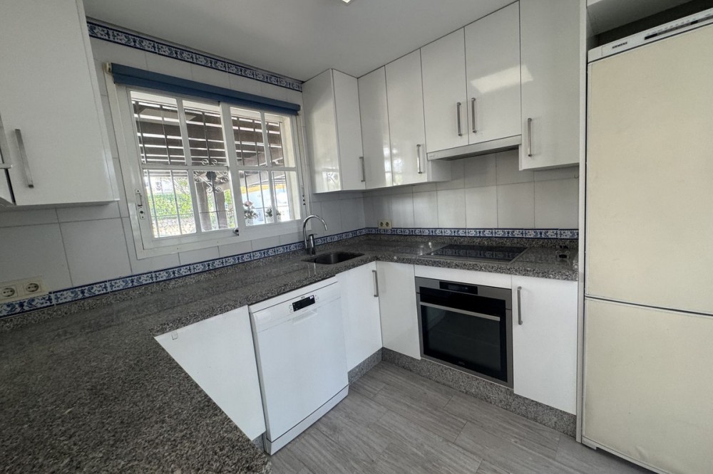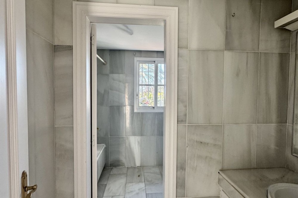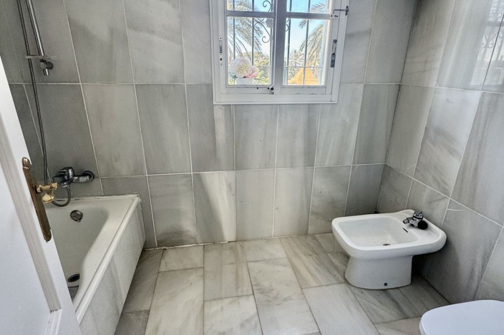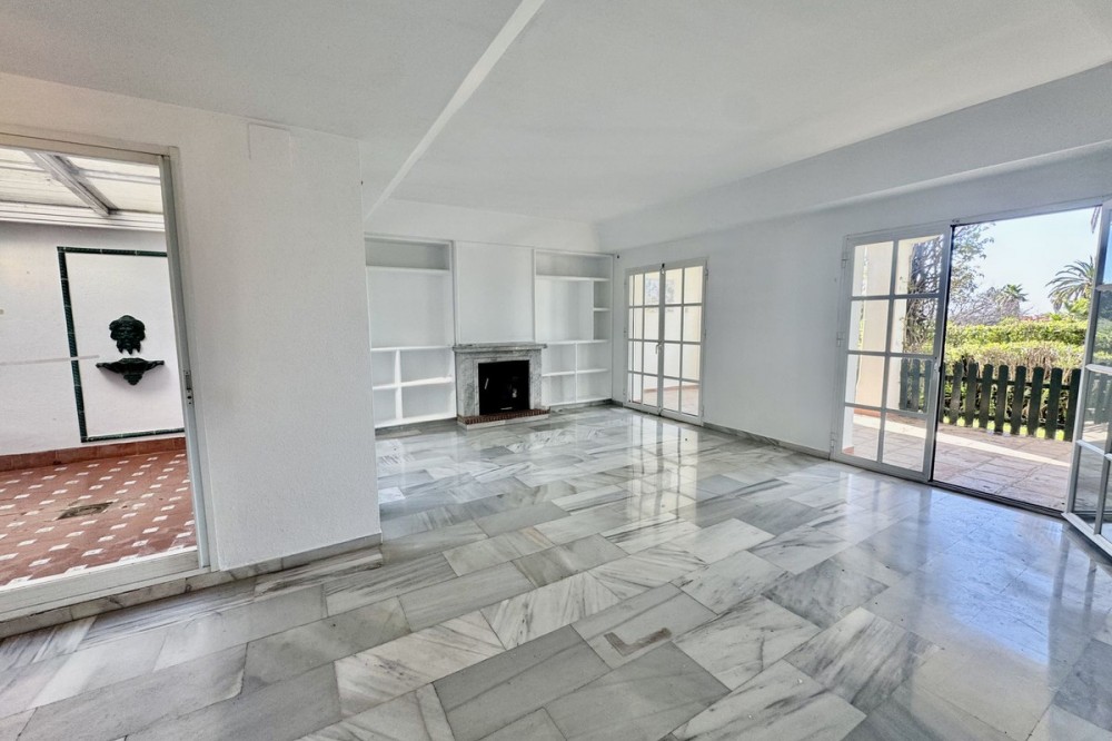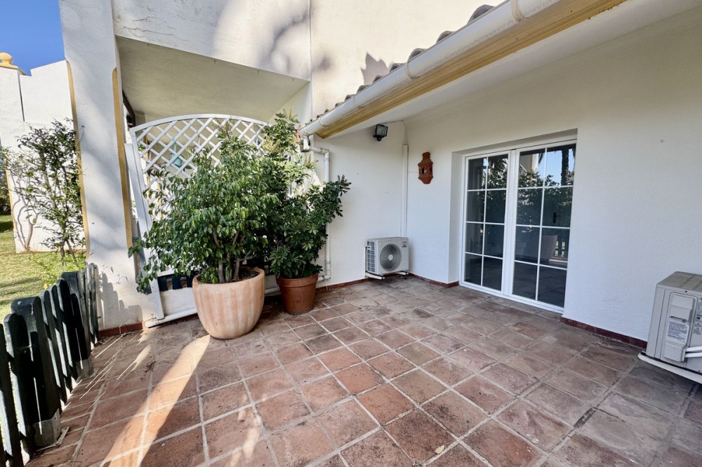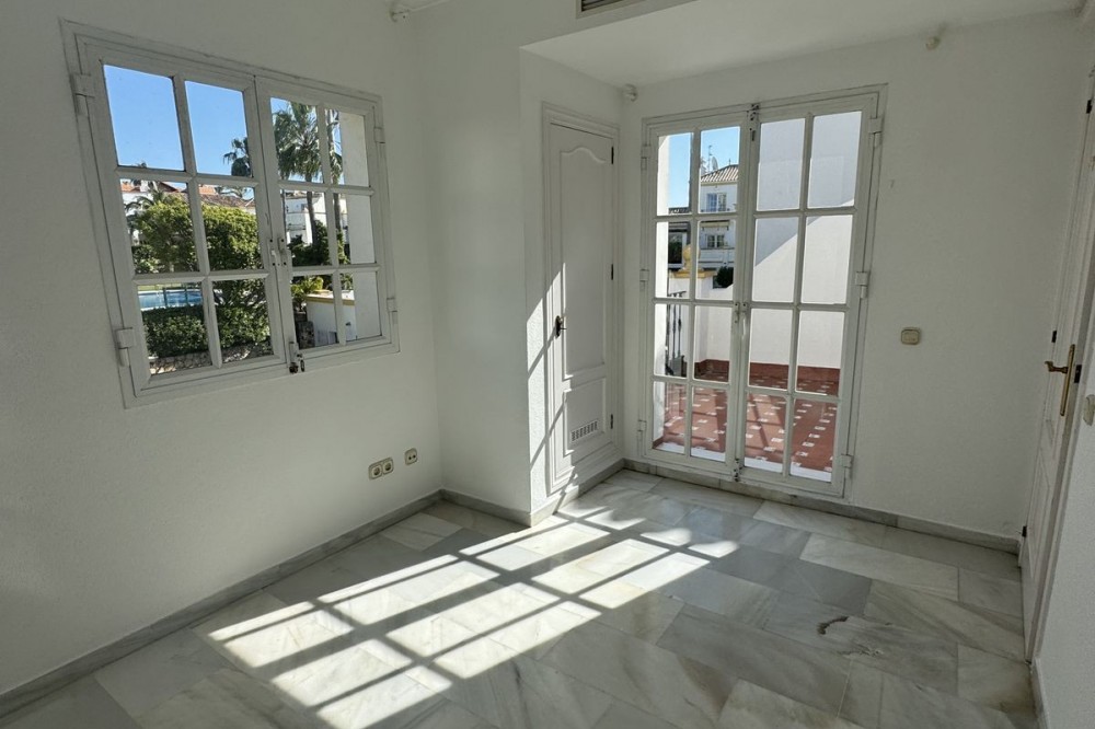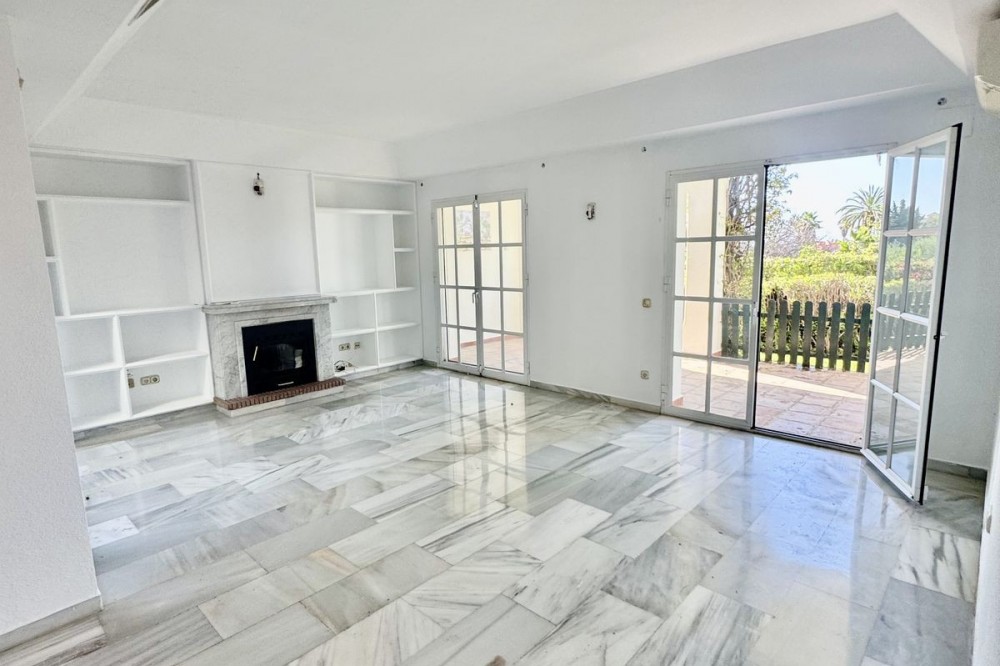 - Beautiful townhouse, in an exclusive urbanisation, Coto de la Serena in the New Golden Mile of Estepona, between Estepona and San Pedro. It has beautiful sea views from the upper floor. The property consists of two floors. On the lower floor is the renovated kitchen. The living room with a good sized fireplace has access to a wonderful south facing sunny porch with an adjoining garden. It also has a guest toilet and a nice enclosed Andalusian patio perfect for breakfast or lunch. On this floor there is also a large bedroom with bathroom en suite and access to the porch. On the upper floor there are two bright bedrooms with a bathroom. The master bedroom has a terrace with beautiful views of the Mediterranean Sea. The second bedroom also has a large balcony overlooking the pool. In addition the property has a parking space and a large storage room. All in all, a great property for holidays or to live all year round.
