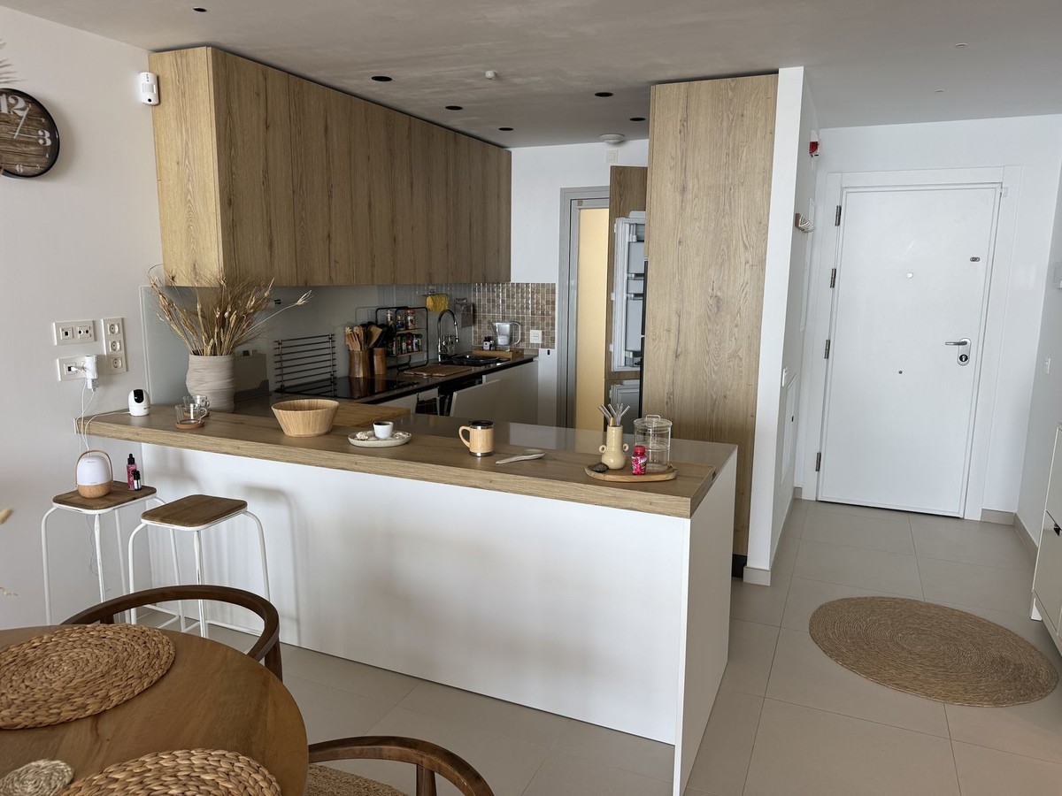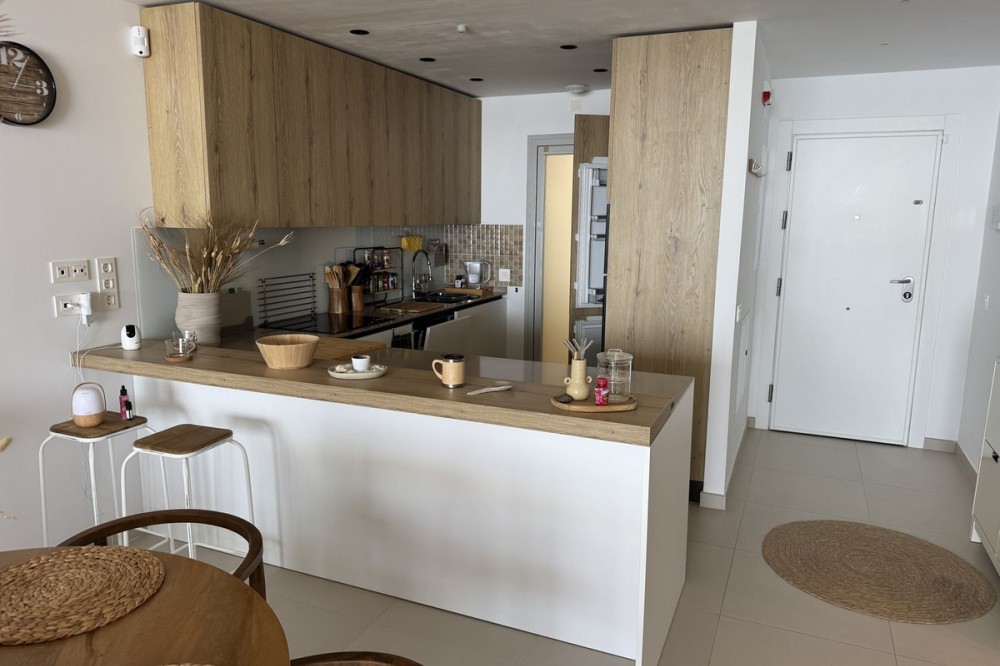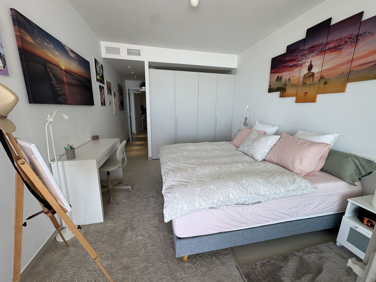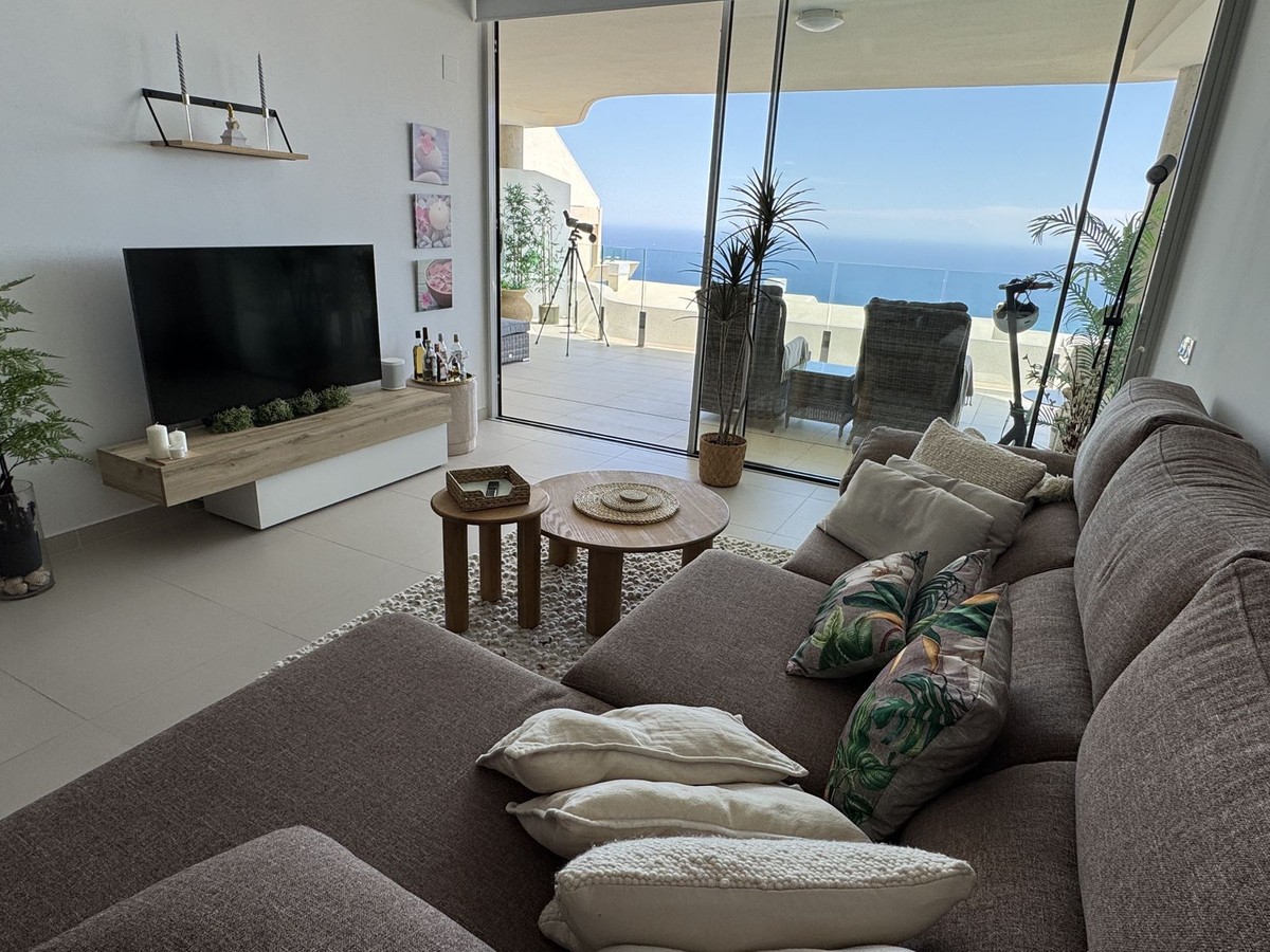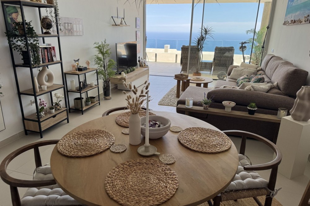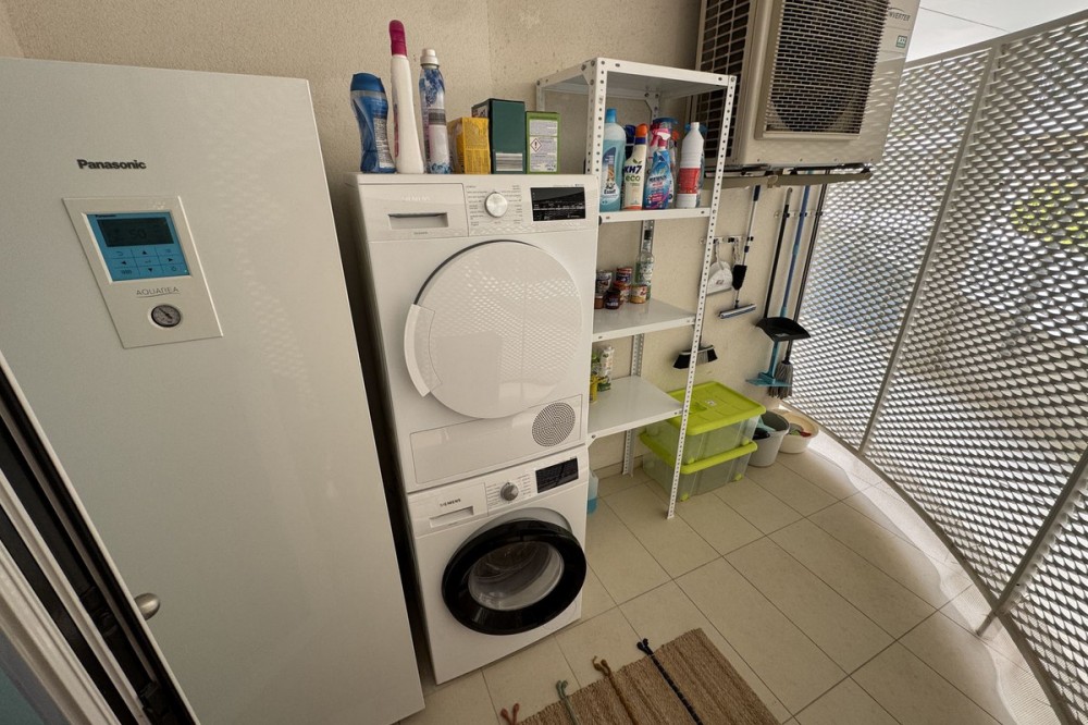 - Modern 2-bed, 2-bath apartment with 2 garage places and storage. The price is including furniture! What makes the apartment special is a private terrace with stunning panoramic sea views, perfect for relaxing or entertaining. There is a very easy access to the Aldi shop and close park, which is great for dog lovers. Located in the sought-after Stupa Hills complex . The complex is situated in near the largest Buddhist temple in Western Europe. This residence has excellent amenities, including tropical gardens, sun terraces, two outdoor pools, one indoor pool, a fitness center, and a spa with a sauna room. The outdoor infinity pool offers exceptional views overlooking the Mediterranean. The high-quality gym with sea views is equipped with top-of-the-line equipment. The luxurious spa and wellness center are ideal for relaxation and enjoyment. - the property features a bright and spacious living/dining area - the open and modern kitchen is fully equipped with high-standard appliances - a small, covered laundry area with a washing machine and dryer is connected to the kitchen. - the apartment includes 2 bedrooms with fitted wardrobes, windows have automatic blinds. This is a perfect apartment for permanent residence in an ideal community or as a holiday home for spending memorable vacations