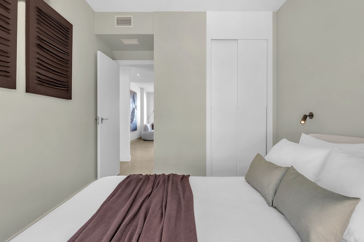 - Middle Floor Apartment, Fuengirola, Costa del Sol. 3 Bedrooms, 3 Bathrooms, Built 93 m², Terrace 26 m². Price includes full Furniture, value 30,000€ Setting : Urbanisation. Orientation : South. Condition : Excellent, New Construction. Pool : Communal. Climate Control : Air Conditioning. Views : Sea. Features : Lift, Fitted Wardrobes, Private Terrace, Storage Room, Double Glazing. Furniture : Optional. Kitchen : Fully Fitted. Garden : Communal. Security : Gated Complex, Entry Phone, 24 Hour Security. Parking : Underground. Category : Luxury, Contemporary.