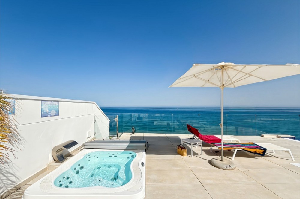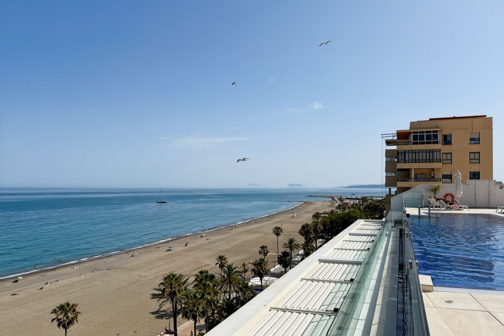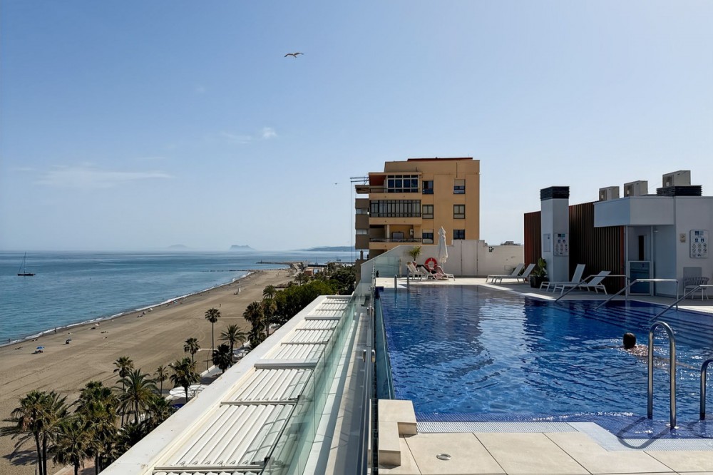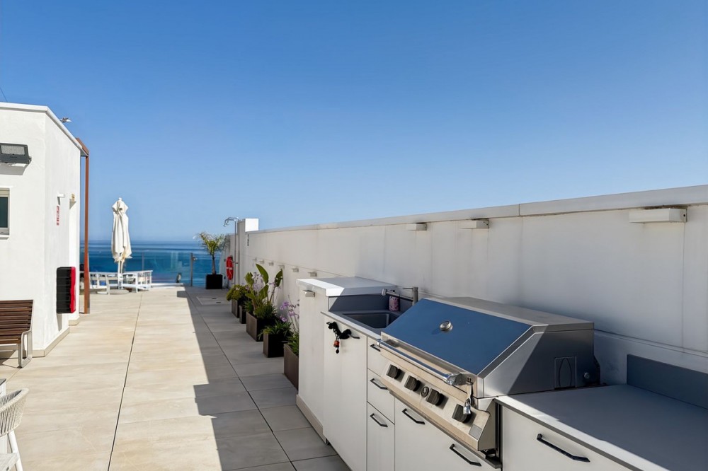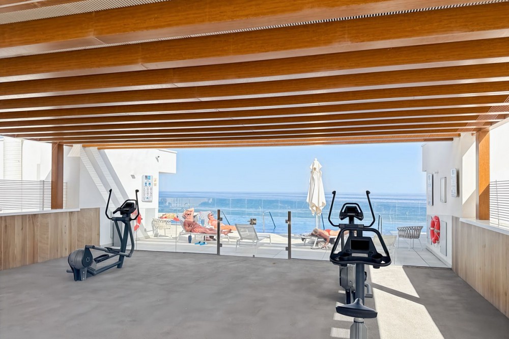 - Right in the heart of Estepona’s promenade, just across the endless blue of the Mediterranean, lies a home that’s not just seen — it’s felt. A place where every sunrise brings a sense of peace, where modern design and warmth blend in perfect harmony. This gem, located on the first floor of a 2021 premium building, is much more than an apartment. It’s a refuge, an experience, a way of life. From the very first step inside, a feeling of well-being takes over. A spacious, light-filled living room opens into a sleek, fully equipped kitchen with high-end integrated appliances — perfect for both daily life and unforgettable gatherings. Underfloor heating powered by an efficient aerothermal system keeps every step cozy, while ducted air conditioning allows individual temperature control in every room, tailored to your rhythm, your comfort, your day. The glazed terrace of over 30 m² extends your living space outdoors — a place to breathe, relax, simply be. When night falls, the two bedrooms offer a quiet retreat. The master suite features an integrated safe, a detail that brings true peace of mind. Bathrooms are designed as spa-like spaces, complete with walk-in rain showers and elegant finishes. Then you reach the rooftop. An infinity pool merges with the sky. A panoramic jacuzzi offers sea views like no other. An open-air gym makes every workout a pleasure. A barbecue and chill-out area set the stage for unforgettable evenings. Even an adapted restroom shows that every detail has been considered. This property includes a private garage space and storage room on floor -2, accessible directly by elevator. Everything is built for seamless, worry-free living. Living here is not just a decision — it’s a feeling that wraps around you. That quiet certainty that you’ve found the place where you truly belong. Some places can’t be described. They must be lived. And this, without a doubt, is one of them.