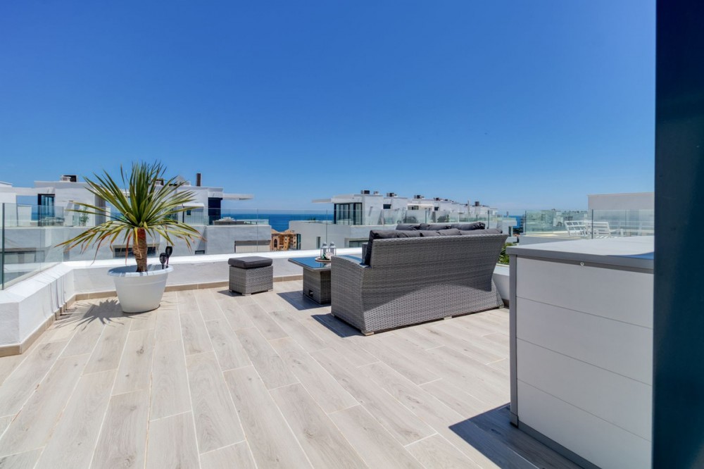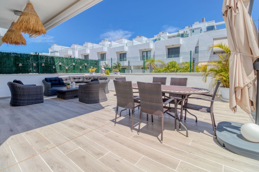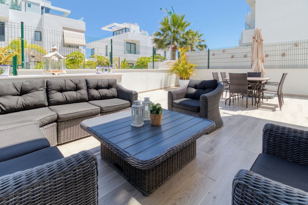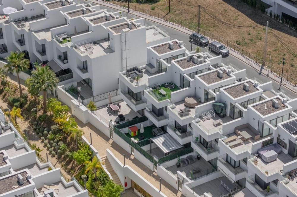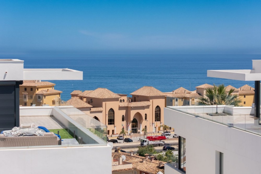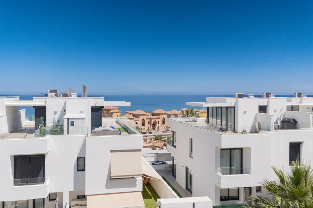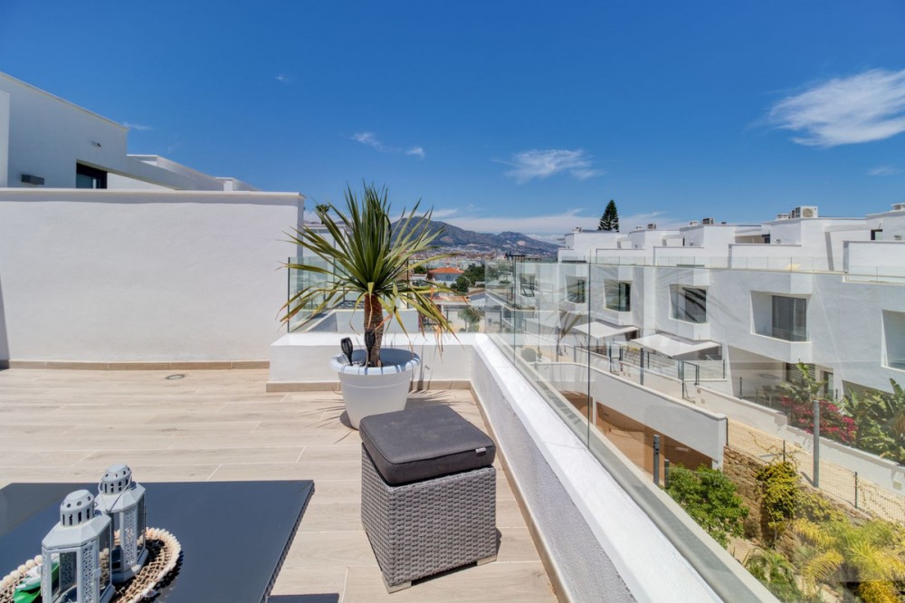 - = Stylish Modern Townhouse with prime location next to the beach in Fuengirola = This exceptional 3-bedroom townhouse offers the perfect blend of modern design, generous indoor-outdoor living spaces, and a premium location just minutes from the beach and Fuengirola’s charming town center. Set within a private gated community, this home is ideal whether you’re seeking a full-time residence, a holiday getaway, or a smart investment on the Costa del Sol. Highlights = Location: 6 minute walking distance to the beach, Sohail Castle, restaurants, shops, and transport. = The entire community has its own water softening filter = Built in: 2022 – modern, well-maintained, and move-in ready = Private garage: Direct access and space for 2 vehicles - 48 m² = Built area: 202 m² on three levels = Private plot: 317 m² with 115 m² of terraces and garden = Rooftop solarium: 55 m² with sweeping sea and mountain views = Bedrooms: 3 spacious rooms including a master with en-suite and private terrace = Bathrooms: 2 full bathrooms + 1 guest toilet = Community features: Swimming pool, gym, sauna, landscaped areas = Orientation: South and west for optimal natural light = Energy efficiency: Double-glazed windows and hot/cold air conditioning = Only 19 minutes to Málaga Airport. Whether enjoying sunset views from your private rooftop, entertaining on your garden terrace, or relaxing in the comfort of your stylish interiors, this property offers a lifestyle of ease and elegance. With its unbeatable location and access to premium amenities, it’s a rare opportunity to own a modern home in one of the Costa del Sol’s most desirable coastal towns.