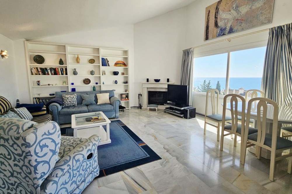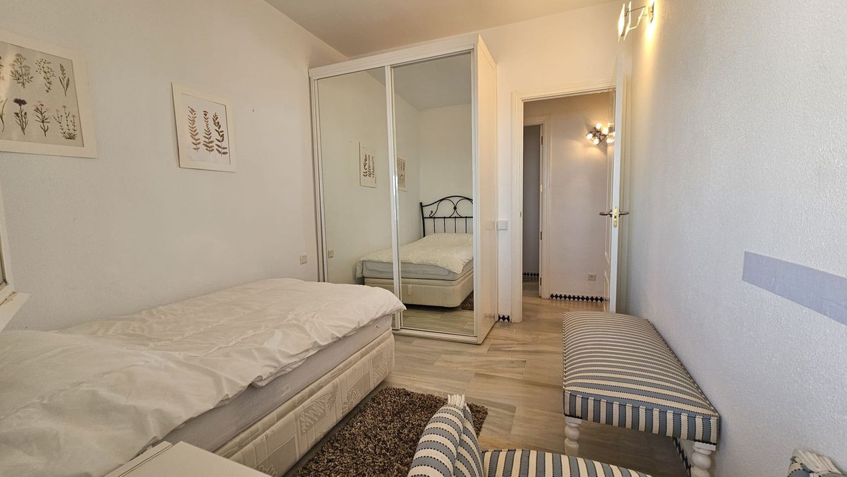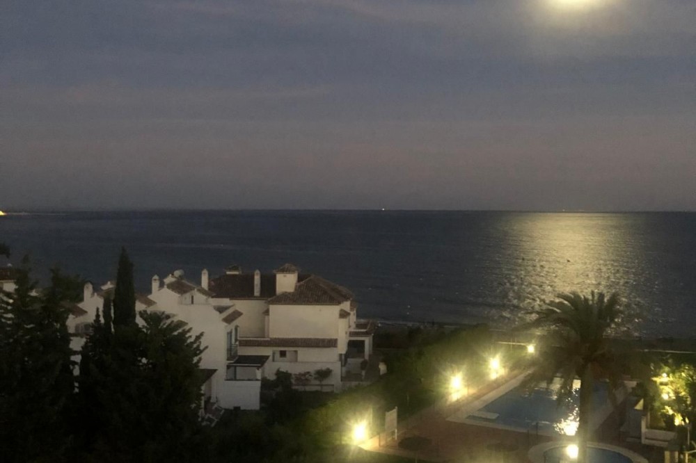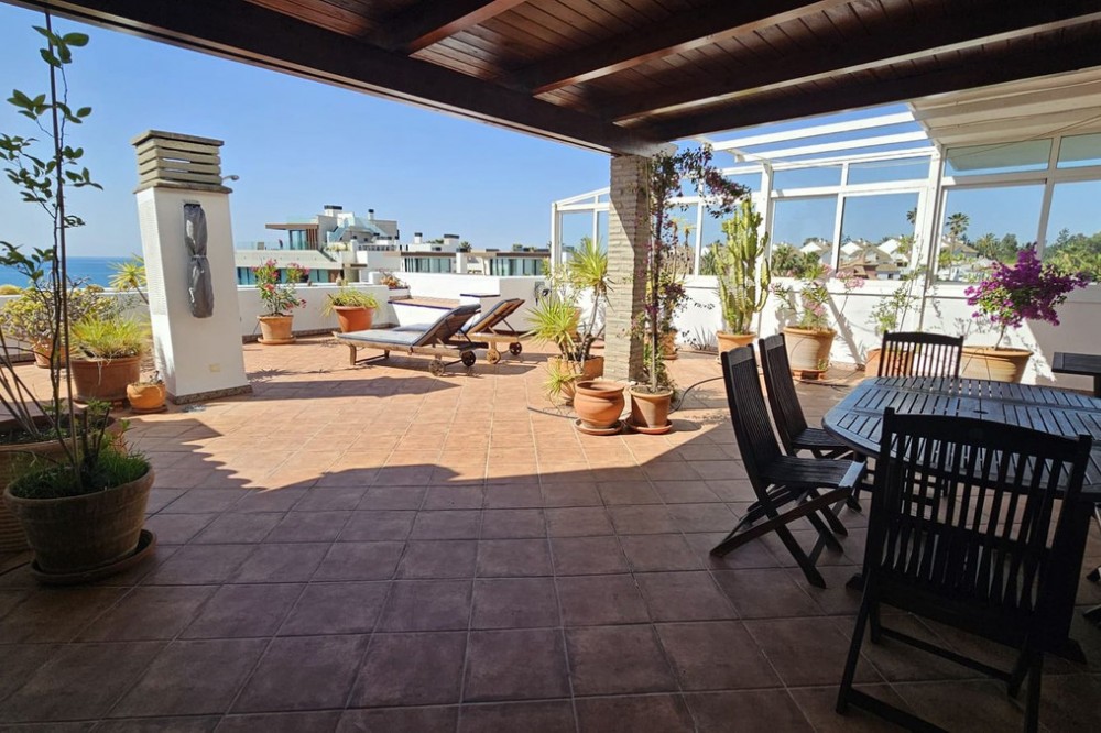 - Semi-penthouse Located on the fourth floor of a sought-after beachfront development, this bright and spacious apartment offers stunning, uninterrupted views of the Mediterranean Sea and the Estepona coastline. Thanks to its south-facing orientation, the home enjoys all-day sunshine, making it an ideal place for living or spending long stays by the sea. The property features a generous living-dining room with a fireplace and recently installed air conditioning, which opens directly onto a spacious, partially covered 85 m² terrace. This outdoor space is perfect for relaxing, sunbathing, or enjoying al fresco meals with unparalleled sea views. The kitchen is separate and fully equipped, with a renovated electrical system. From the terrace, also with recently renovated electrical system and plumbing, you can enjoy an open and unobstructed panoramic view. The home has three double bedrooms, all with built-in wardrobes. One of the bedrooms has direct access to the terrace. Two full bathrooms complete the layout. Sold fully furnished, ready to move into. The residential complex offers excellent communal areas: a communal pool, mature gardens, a tennis court, and a social area with a barbecue. It also has direct access to the promenade and the beach, and is just a few minutes' walk from the marina and the charming historic center of Estepona. Includes a parking space and storage room in a gated community with security. A unique property for both permanent residence and holiday investment.