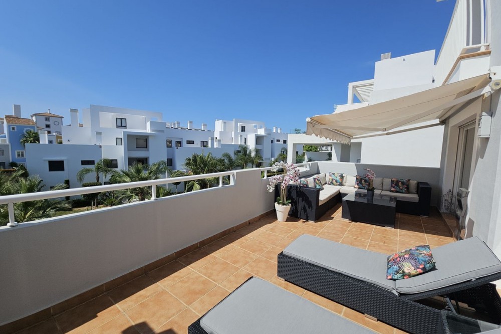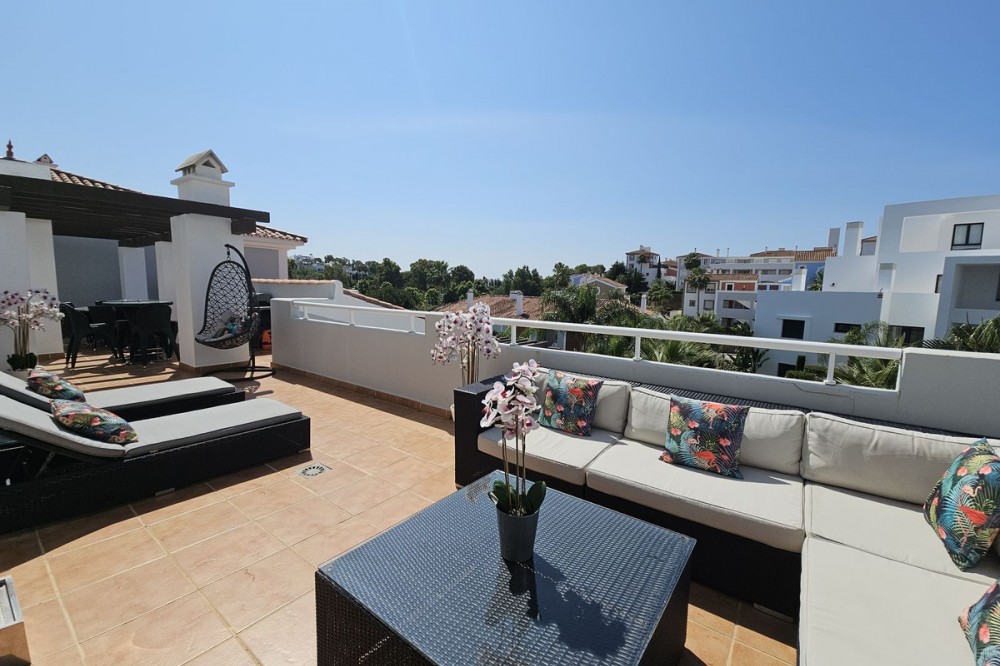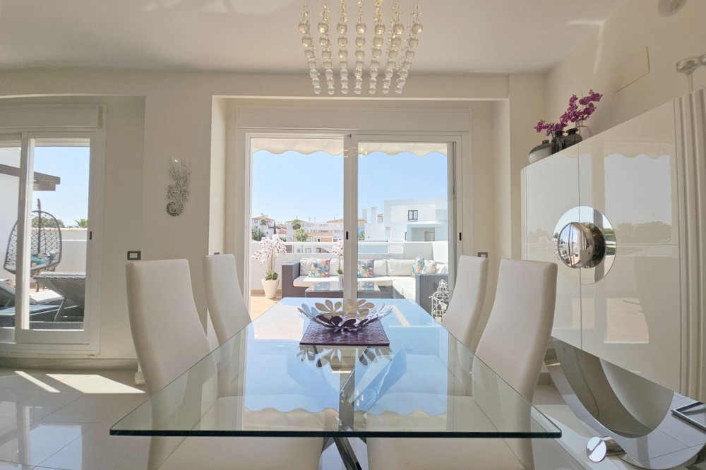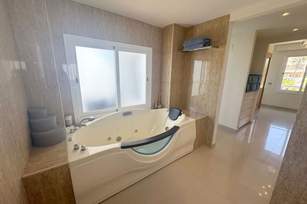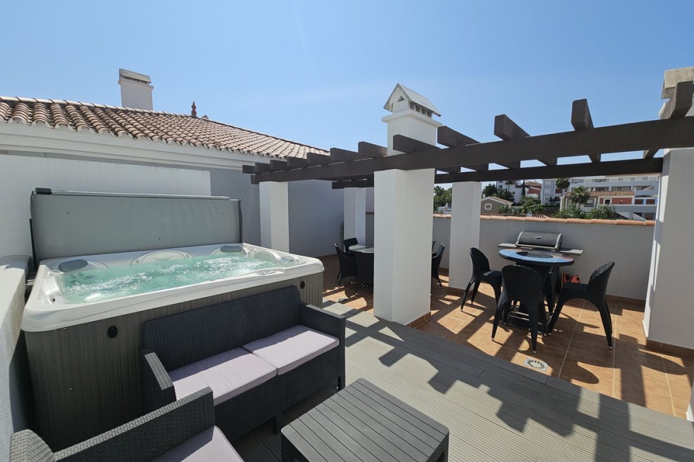 - Stunning Two-Story Penthouse in Cortijo del Mar, Private Collection Presenting the most desirable penthouse in the prestigious Cortijo del Mar development – a beautifully maintained, two-story top-floor apartment offering exceptional space, comfort, and style. This immaculate property features two spacious bedrooms, with the luxurious master suite occupying the entire upper level. The master includes a private en-suite bathroom and opens onto a charming balcony terrace with picturesque views. On the main level, you’ll find a bright and airy living and dining area, a second double bedroom, a modern kitchen, and direct access to a huge main terrace – a true highlight of the home. This expansive outdoor space features a jacuzzi, areas for sunbathing, dining, and entertaining, making it ideal for enjoying the Mediterranean lifestyle year-round. The master suite has walk through fitted wardrobe area and the bathroom has twin sinks, jacuzzi bath and separate shower. There is also potential to convert the master suite into two separate bedrooms, creating a spacious 3-bedroom layout – perfect for growing families or adding value to an already standout property. Enjoy access / shared facilities to the main resort’s larger pool, kids pool and restaurant in additional to our private collection pool. Set within a secure, well-maintained community with lush gardens and a large communal pool, this penthouse offers luxury living just minutes from the beach, golf courses, and all local amenities. Key Features: Best unit in Cortijo del Mar Two-story penthouse in perfect condition 2 bedrooms (option to convert to 3) Spacious main terrace with jacuzzi, ideal for sun and entertaining Private upper-level master suite with en-suite and balcony terrace Gated complex with communal pool, gardens, and security Prime location close to beaches, golf, and amenities Underground parking space and storage unit included in the price Electric security shutters to patio doors and window shutters A rare opportunity to own the top property in one of the Costa del Sol’s most desirable communities.