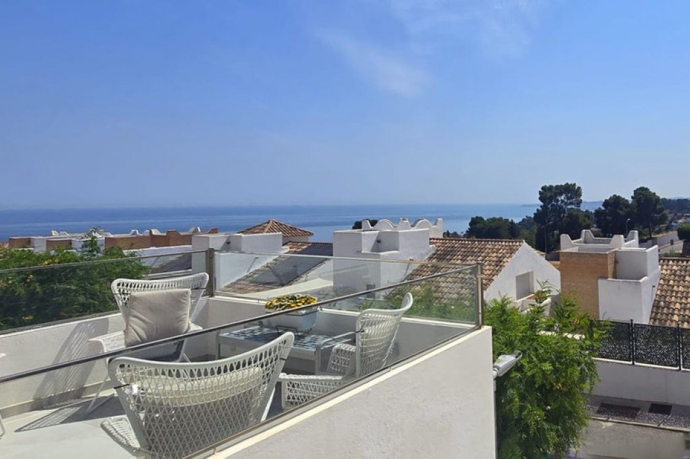 - Contemporary detached villa of 360 m² built in Benalmádena Pueblo, in the prestigious residential area of Torremuelle. It is a house built in 2017, it is in an unbeatable condition and consists of 2 kitchens + 1 bar area, 2 living rooms, a private lift, 3 terraces with spectacular sea views, direct access to the social club and pool area, underfloor heating, air conditioning and solar panels. We present this beautiful and exclusive house of 309 m2, distributed over 3 floors connected by lift, enjoys a modern and functional design and lots of natural light. The property has a fully equipped modern kitchen with a large island and an outdoor kitchen with barbecue, 2 living rooms, 3 bedrooms, all with en-suite bathrooms, 1 guest toilet, 3 terraces, 1 private patio, a closed garage for 2 cars, storage room and photovoltaic panels that significantly reduce electricity consumption. All within the prestigious Big Blue urbanisation, in Torremuelle, Benalmádena Pueblo, with a fantastic communal swimming pool, residents gym, social club and security system. The sea views with the peaceful and green surroundings are truly spectacular, present from several rooms of the house and its terraces, which makes this property a unique place to enjoy the sun and tranquillity all year round. Layout: ???? Access floor (street level): Upon entering we are greeted by a bright and spacious living room with an elegant modern-style bar area and access to a private terrace. This floor houses the spacious and comfortable master bedroom with a dressing room and en-suite bathroom, as well as a second bedroom also with en-suite bathroom. Here you will find the access to the garage for 2 cars and the entrance to the lift that connects the whole house. ???? First floor (main floor): This floor houses the heart of the house: a very spacious open concept living room, with direct access to a spectacular terrace that surrounds the entire house. The interior is divided into several well-defined areas: dining area, relaxation area, reading corner and large open-plan living room with plenty of natural light. The spacious and modern interior kitchen is fully equipped and includes a pantry and separate laundry area. From the living room there is access to the south-west facing terrace with beautiful sea views. On one of its sides there is an outdoor kitchen next to the barbecue area, ideal for celebrations or outdoor meals. Also from this floor there is access to a cosy private patio. ???? Upper floor (third floor): On this level there is a third bedroom suite with dressing room, private bathroom and access to a large terrace with panoramic sea views. From this terrace there is direct access to the communal areas of the urbanization, such as the swimming pool and the social club, which makes this level a perfect space for relaxing, teleworking or receiving guests with total independence. Located in one of the most sought after areas of the Costa del Sol, the property is within a 15 minute walk to the local train station and the beach. With easy access to the picturesque centre of Benalmádena Pueblo with its exquisite restaurants and charming cobbled streets, this property represents a unique opportunity for those seeking a luxury, efficient home with views to fall in love with, where design, location and quality come together in perfection. The house has been tastefully renovated and decorated, incorporating high quality materials such as porcelain stoneware floors, underfloor heating, modern energy efficient systems and architectural solutions that elevate comfort and style.