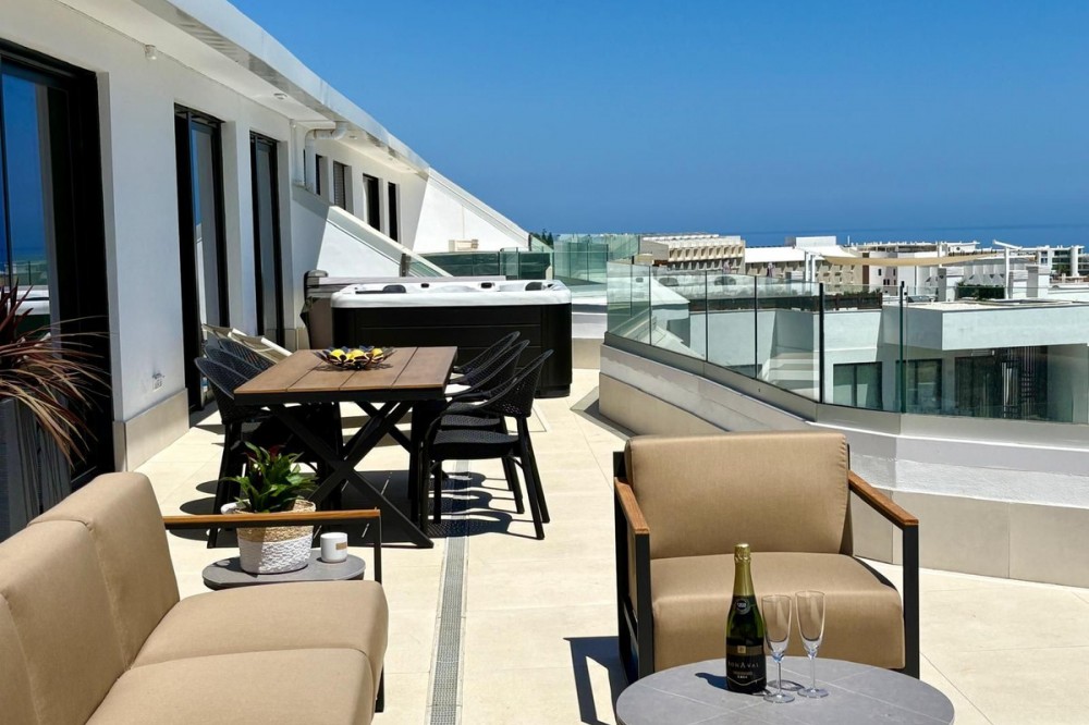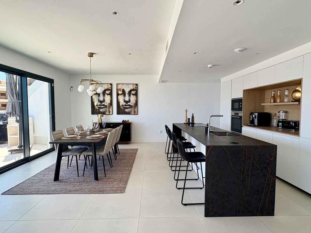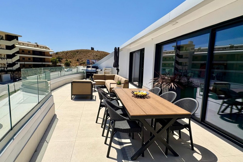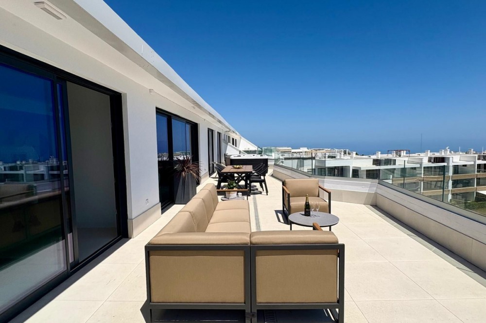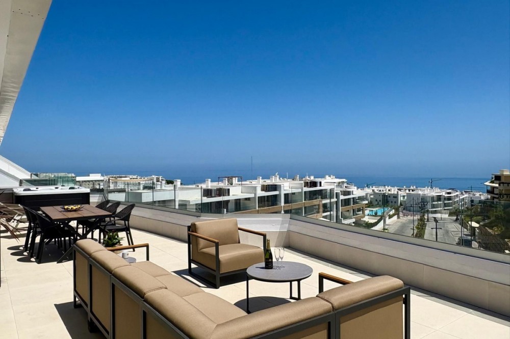 - Luxury Penthouse with Panoramic Sea Views in Reserva del Higuerón, Fuengirola Step into contemporary elegance with this stunning penthouse, built in 2024, located in the sought-after Reserva del Higuerón – just a short walk from the prestigious Higuerón Resort with world-class facilities including a gym, spa, heated indoor pool, padel and tennis courts, sports club, and gourmet restaurants, including a Michelin-starred restaurant. This modern 3-bedroom, 3-bathroom penthouse offers 152 sqm of interior space and an impressive 67 sqm private terrace with breathtaking sea views. The spacious terrace is designed for luxurious outdoor living, featuring a jacuzzi, BBQ, sun loungers, a lounge area, and outdoor dining furniture – perfect for entertaining or relaxing in style. Inside, you'll find a bright open-plan living area with a fully equipped kitchen, breakfast bar, and direct access to the terrace. Two of the three bedrooms also open directly onto the terrace. The property includes underfloor heating in all bathrooms, spotlights, a separate laundry room, and plenty of storage throughout. A modern alarm system provides added peace of mind. The apartment is sold fully furnished and equipped, ready to move in. Two underground garage spaces and a storage room are included. The gated community offers beautifully landscaped gardens with multiple swimming pools. This penthouse is a perfect blend of luxury, comfort, and location – ideal as a permanent residence, a high-end holiday home, or a premium investment opportunity