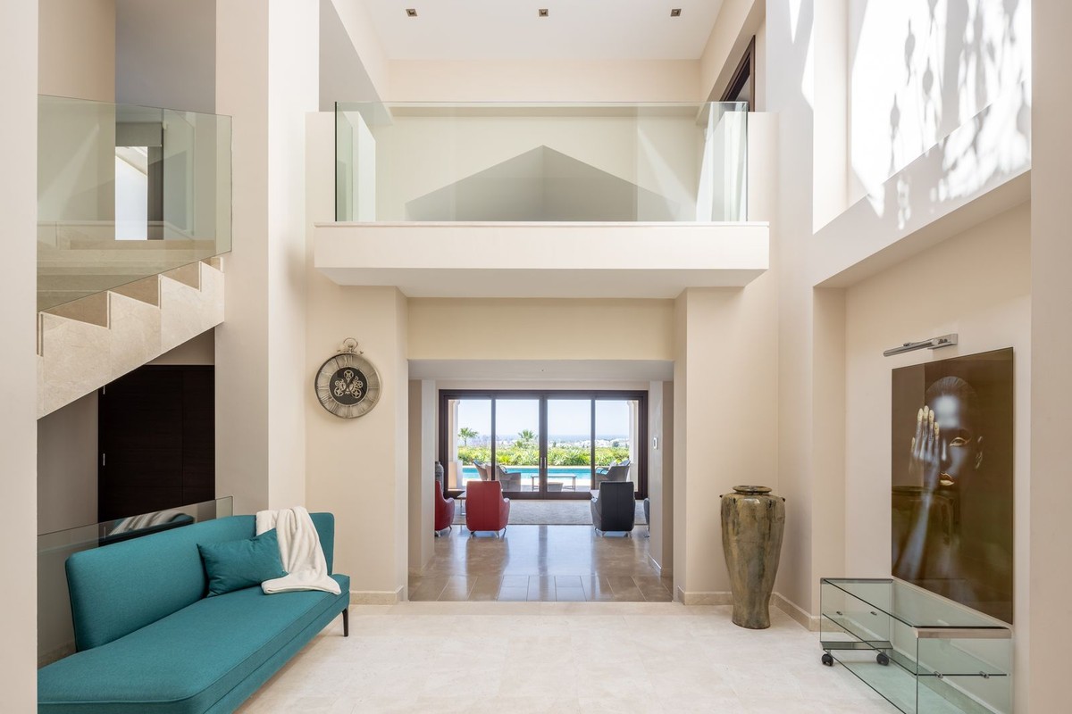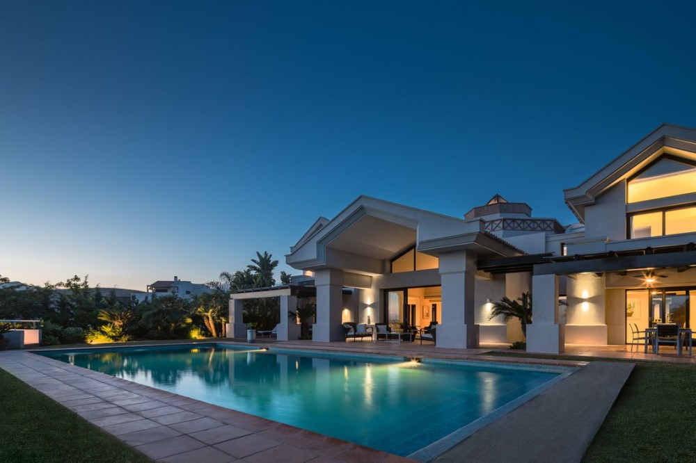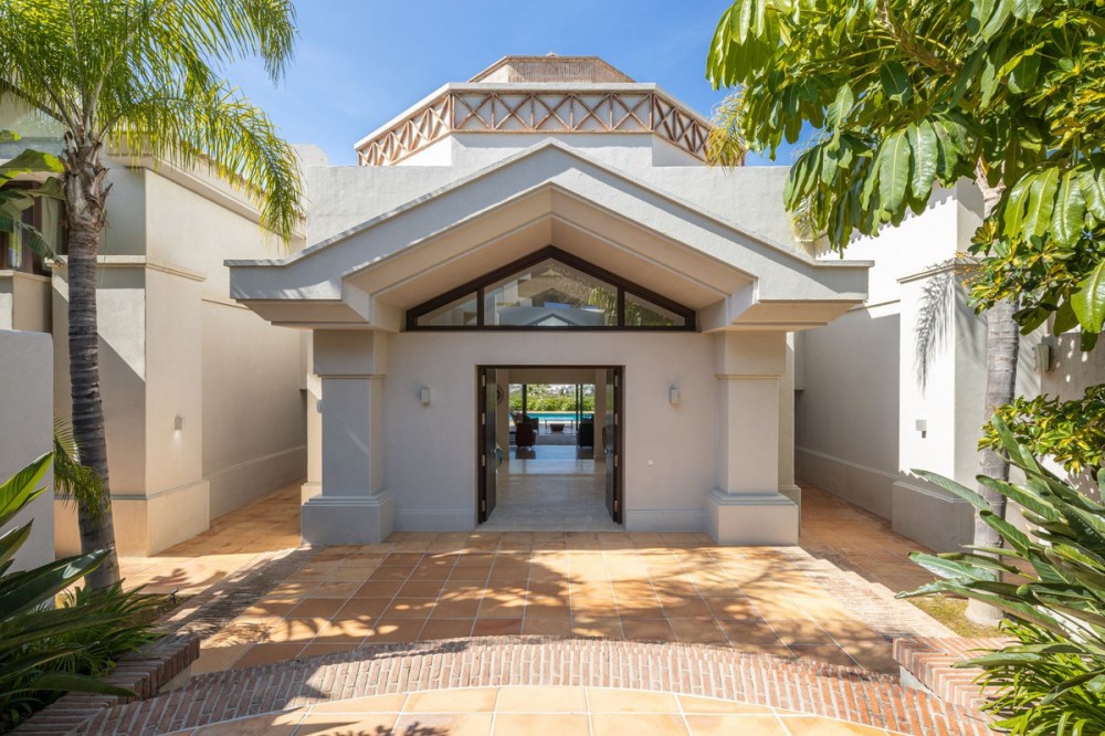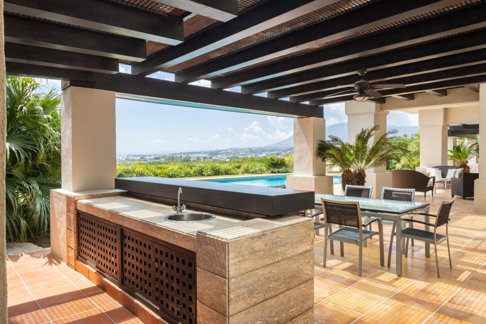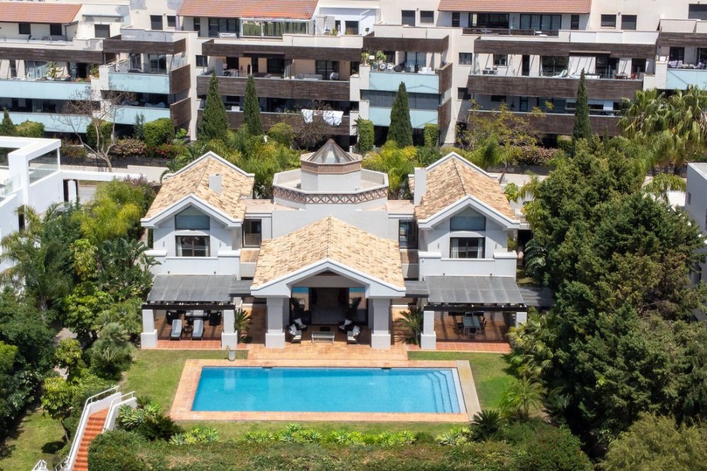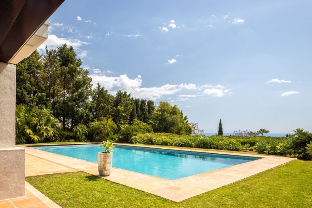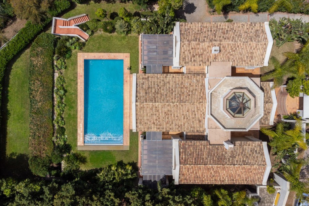 - VILLA FLAMINGOS – PROPERTY FOR SALE IN LOS FLAMINGOS, BENAHAVÍS Located in one of the most prestigious areas of Los Flamingos, this stunning south-facing villa offers spectacular panoramic sea views and is just minutes away from all amenities, the beach, and only 10 minutes from Puerto Banús. Set on a generous plot of 2,239 m² with a total built area of 727 m², the property is distributed over three floors, combining elegance, functionality, and comfort. A perfect home for those seeking exclusivity, privacy, and unparalleled views of the Mediterranean. Main Features: Detached 3-level villa 6 spacious bedrooms and 6 bathrooms Plot size: 2,240 m² Terraces and balconies with open views Private garage included Excellent condition (built in 2005) Fitted wardrobes and storage room South-facing, with maximum natural light Central gas heating and underfloor heating Air conditioning Additional Amenities: Private swimming pool (83.26 m²) Well-maintained gardens Additional outdoor parking Home cinema room Fully equipped barbecue area Layout: Basement Floor: 257.5 m² allocated to two guest or staff bedrooms, home cinema, storage room, utility room, technical room, garage for at least two vehicles, and exterior parking area. Includes internal stairs connecting to the main level. Ground Floor: 288.73 m² plus 52.80 m² of porches and pergolas. Features an elegant entrance hall, guest toilet, spacious main living room, hallway, en-suite bedroom, family lounge, independent kitchen, dining room, and direct access to covered terraces and barbecue area. Upper Floor: 180.74 m² comprising a majestic master suite with private bathroom and two additional en-suite bedrooms. Internally connected to the lower floors.