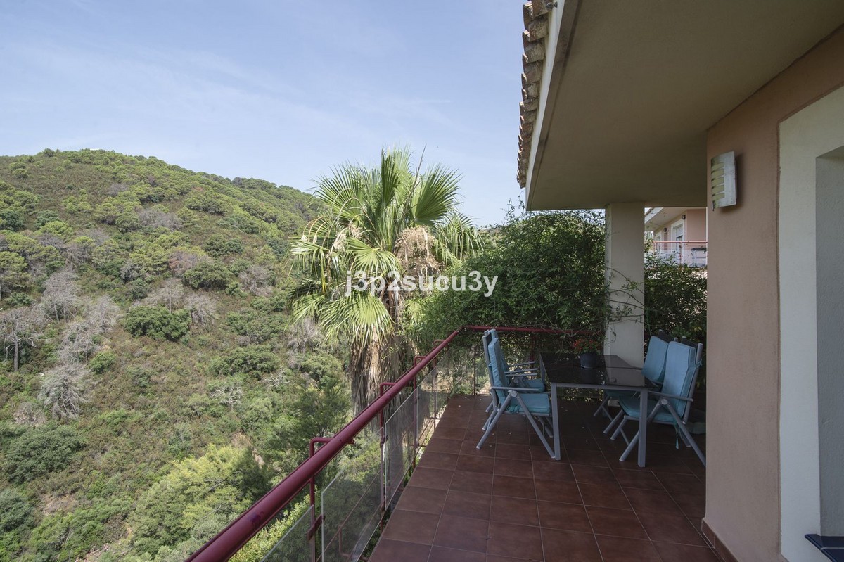 - This semi-detached house is located in the hills of Sierra Bermeja, in the Forest Hills urbanisation of Estepona, nestled in nature and surrounded by lush vegetation and mountain air. With a constructed area of 205m² spread over 3 floors and a private garden of 320m2, this property has uncommon potential. The entrance through the porch at street level is to the upper floor, where the spacious living room with fireplace, dining room and kitchen are located. This floor also offers a large terrace with panoramic views of the hills, as well as a guest toilet. On the lower floor are the 3 bedrooms with fitted wardrobes and 2 bathrooms. The master bedroom has an en-suite bathroom and access to another terrace with the same open panoramic views of the mountains and surrounding greenery. On this floor there is also a utility room which provides additional storage space. On the lower level, we have a second storage room and a large covered terrace equipped with an outdoor kitchen that opens onto the large private garden. This covered terrace, currently used as a gym and play area, offers a unique opportunity to expand the interior space of the house by closing it with glass curtains. The house is equipped with solar panels, which ensures energy efficiency. In addition, the property has parking for 2 cars and 2 storage rooms, one of which can be converted into an additional bedroom or office if desired. There is also a communal swimming pool available for residents. Located on the side of the mountain, the house is located in the Forest Hills area, right next to the Estepona Tennis and Padel Club, just 15 minutes from the centre of Estepona and 10 minutes from the beach and the main motorway that will easily take you to Marbella in 15 minutes or Malaga in 50 minutes.