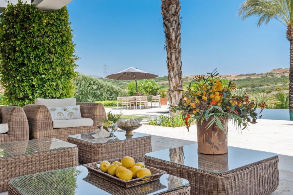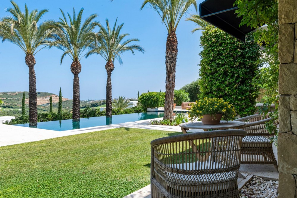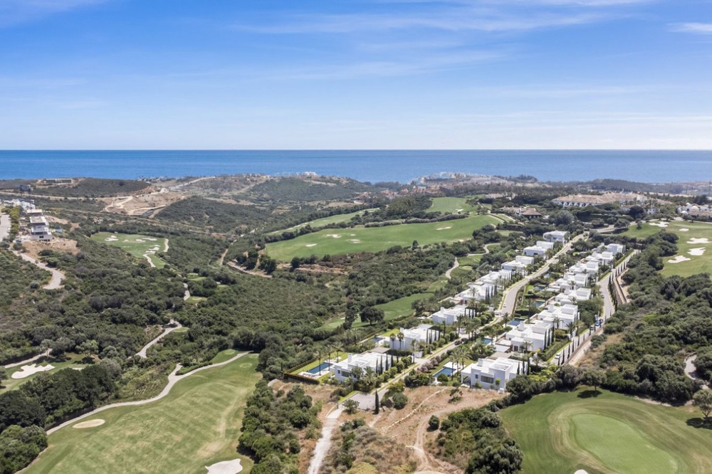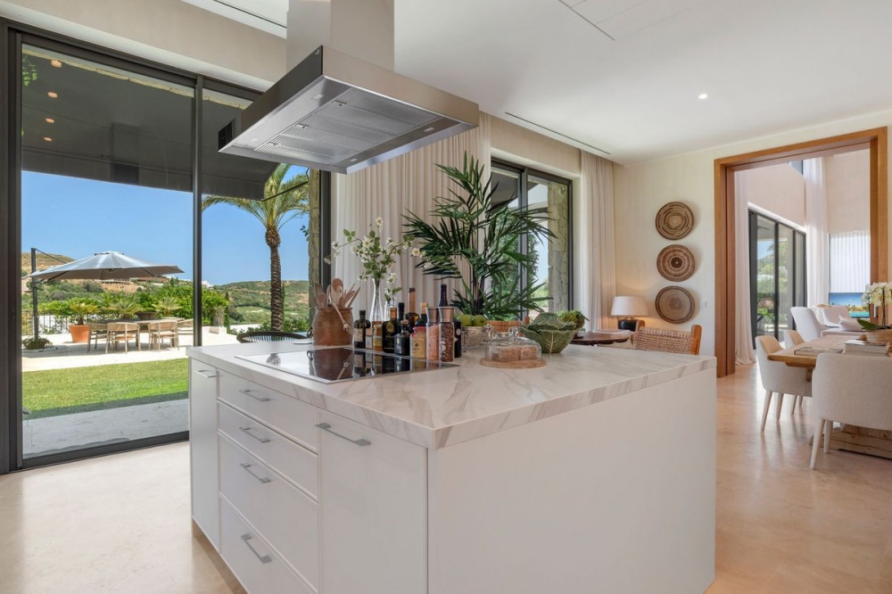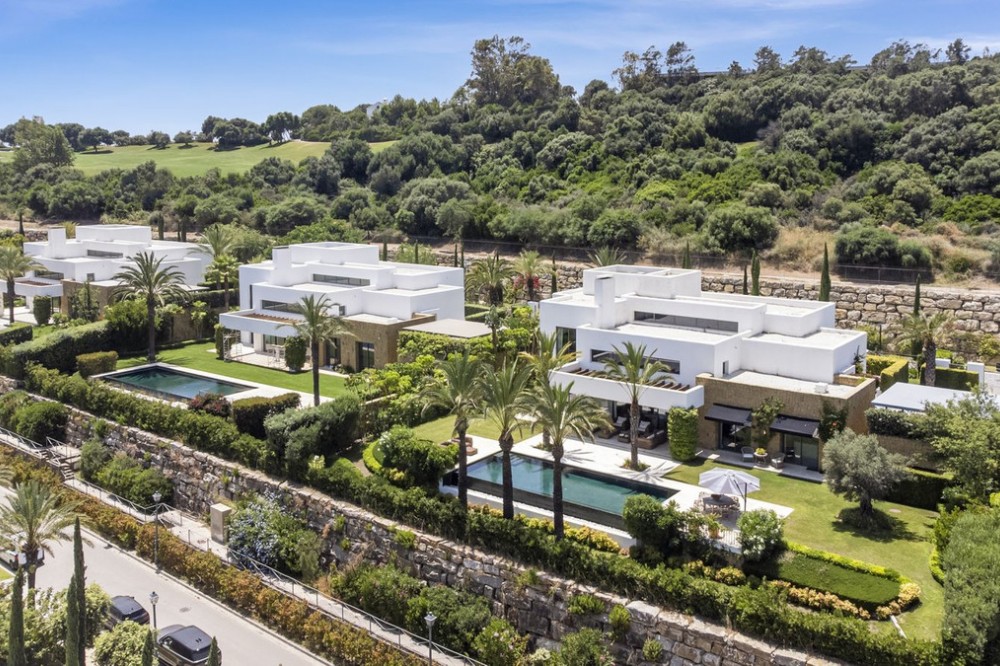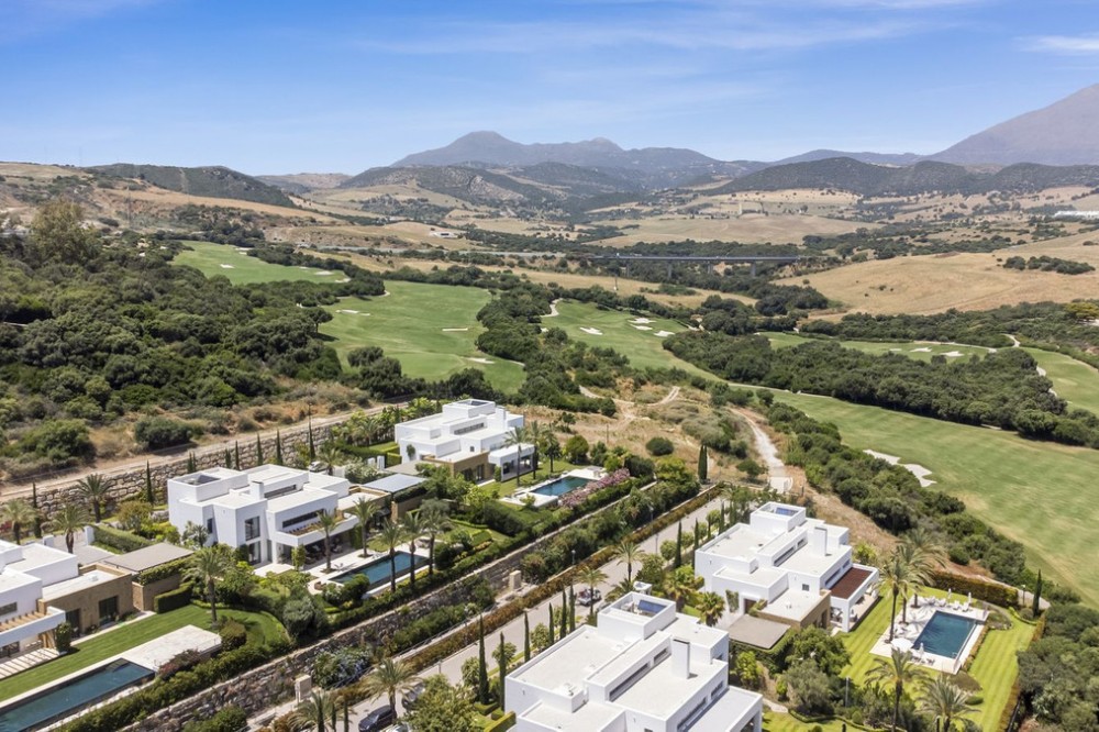 - Ibiza-style villa located within the Finca Cortesin resort. Set on a large plot with landscaped gardens, the property offers panoramic views of the golf course and surrounding mountains. The villa is distributed over two levels and features a clean white façade with Mediterranean stone accents. The ground floor includes an open-plan living and dining area with high ceilings and large windows, a fully equipped modern kitchen, and two bedrooms with en-suite bathrooms and direct access to the garden area. The upper level offers three en-suite bedrooms. The property includes a private pool, covered terrace, and private driveway. Located within the gated Finca Cortesin resort, owners have a discount when using facilities at the luxury hotel, spa, gym, tennis club, restaurants, and the Finca Cortesin Golf Course.