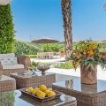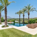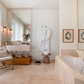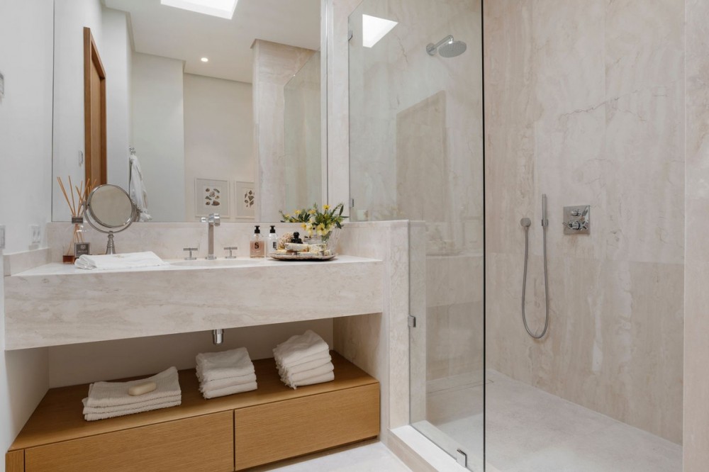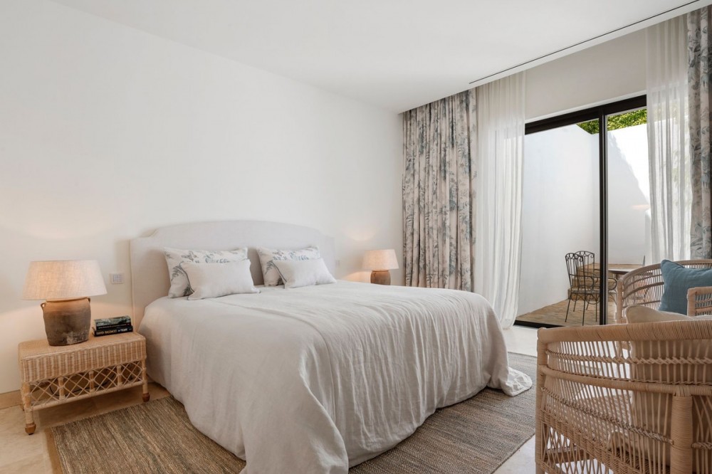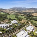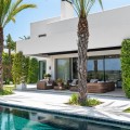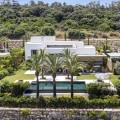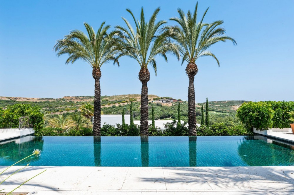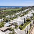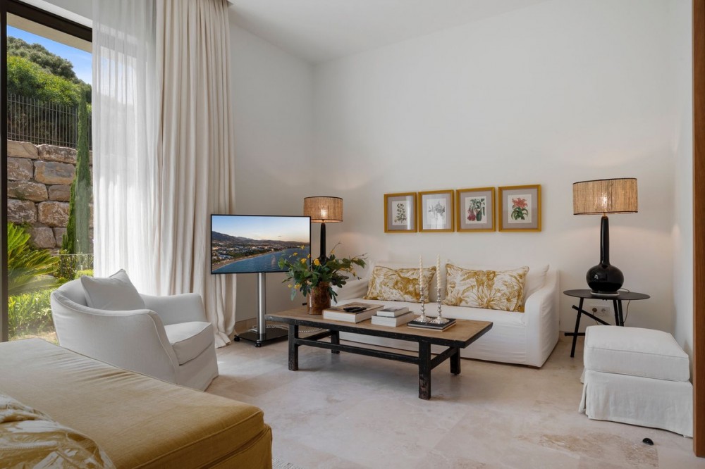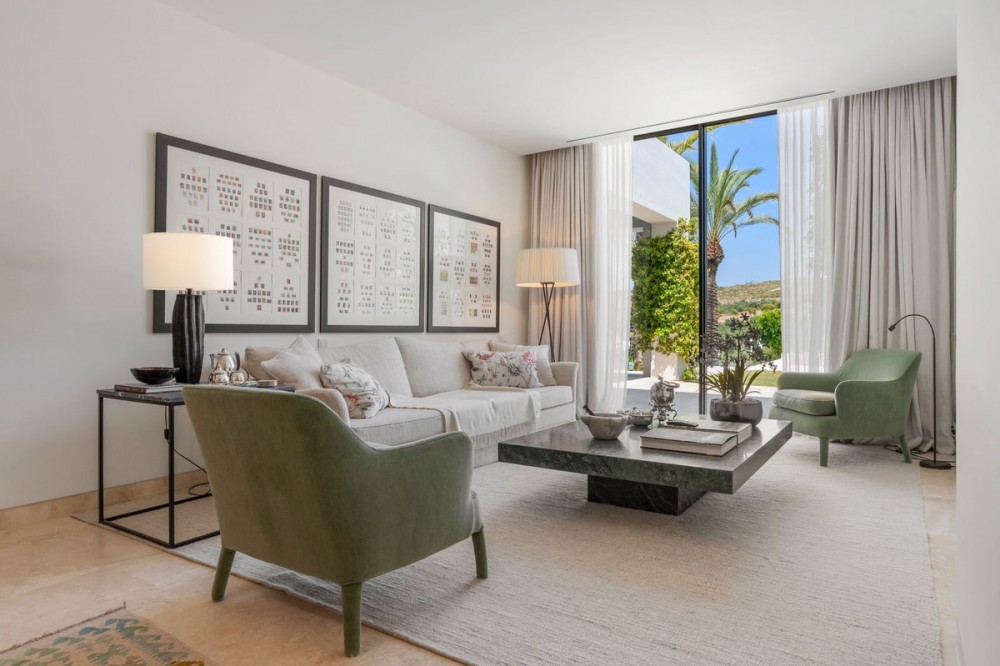 - Ibiza-style villa located within the Finca Cortesin resort. Set on a large plot with landscaped gardens, the property offers panoramic views of the golf course and surrounding mountains. The villa is distributed over two levels and features a clean white façade with Mediterranean stone accents. The ground floor includes an open-plan living and dining area with high ceilings and large windows, a fully equipped modern kitchen, and two bedrooms with en-suite bathrooms and direct access to the garden area. The upper level offers three en-suite bedrooms. The property includes a private pool, covered terrace, and private driveway. Located within the gated Finca Cortesin resort, owners have a discount when using facilities at the luxury hotel, spa, gym, tennis club, restaurants, and the Finca Cortesin Golf Course.