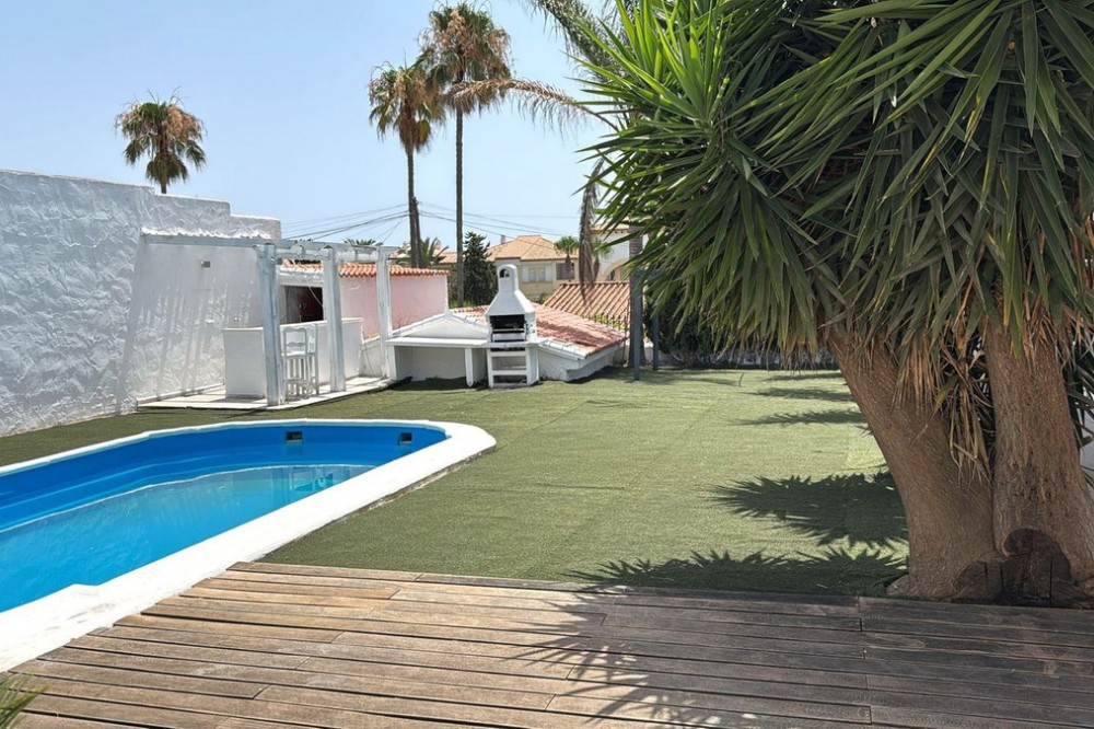 - 3-BEDROOM DETACHED HOUSE WITH PRIVATE POOL 100M FROM THE BEACH Located just 100 meters from the beach, in a residential area between Estepona and San Luis de Sabinillas, both just a 7-minute drive away. The coastal path that connects the entire Costa del Sol is a 4-minute walk away, and it is well connected to the main roads and highways, with Malaga Airport 90 km away and Gibraltar Airport 40 km away. This house enjoys an excellent south-facing corner location and a spacious 759 m2 plot, featuring the house, a large private pool, barbecue area, a large covered terrace, and a spacious sun terrace. The house is distributed over a single floor. From the main entrance, we access the living-dining room with a fireplace and large windows offering sea views. It features a fully equipped separate kitchen, the three bedrooms located along the hallway have built-in wardrobes, and two bathrooms, one with a shower and the other with a whirlpool tub. WE HIGHLY RECOMMEND A VIEWING!