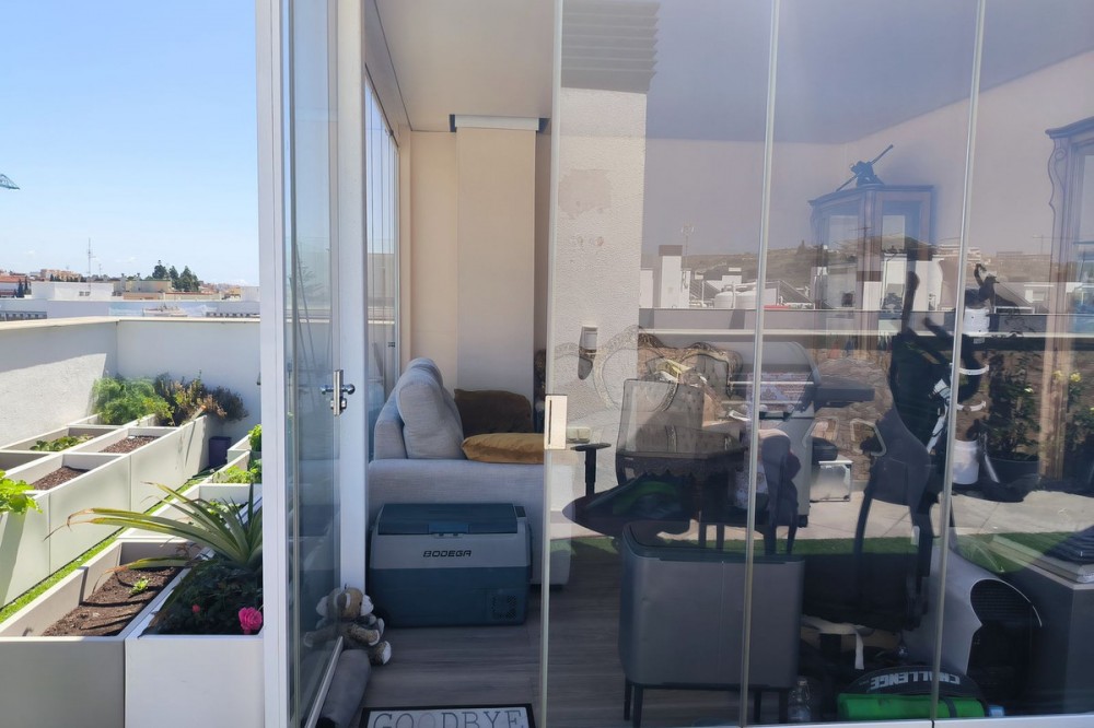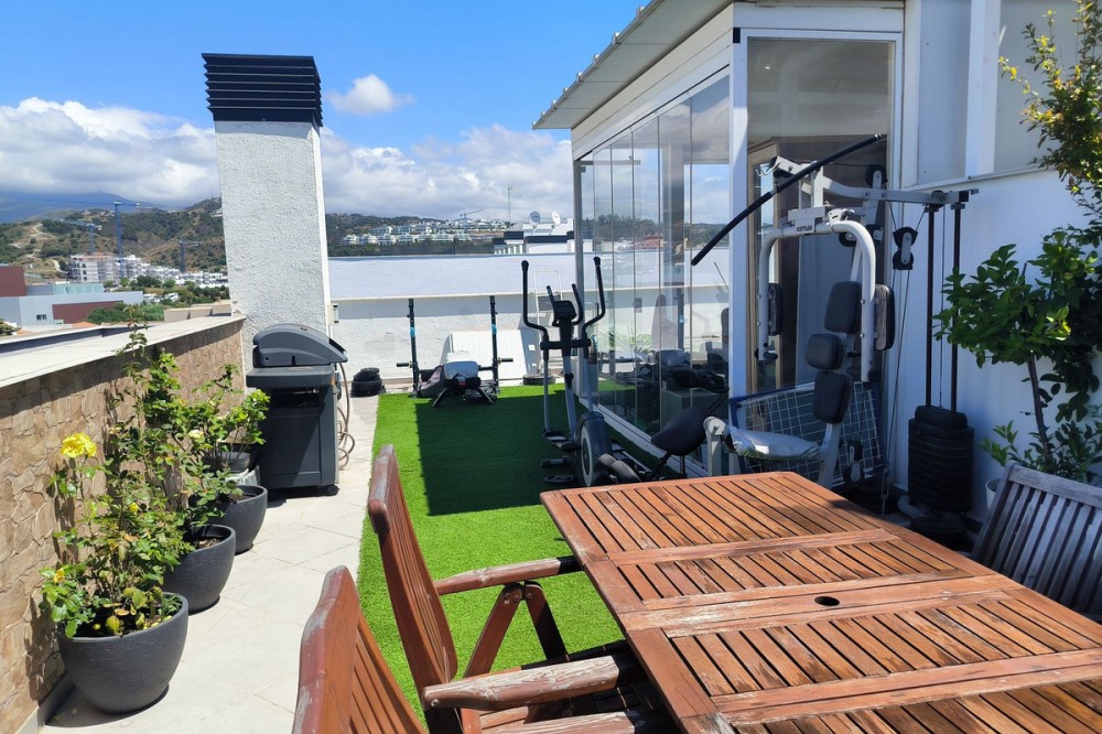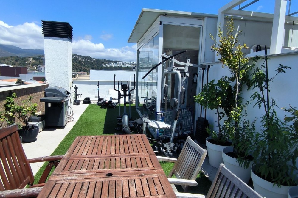 - Modern Penthouse with Panoramic Views, Private Solarium and EV Charging – Estepona Center Located in the vibrant heart of Estepona, in a recently developed neighborhood where modern living blends seamlessly with tranquility, this charming top-floor apartment stands out for its unique character and exceptional features. Situated on the top floor of a building constructed in 2020, surrounded by green areas and with gated access for added security, this property offers a serene and safe environment just steps from Avenida Juan Carlos I, supermarkets, sports centers, schools, and all essential daily services. From the moment you enter, the apartment conveys a sense of space and warmth. A spacious living-dining room welcomes you, opening onto two cozy terraces—perfect for enjoying the Mediterranean climate. The generously sized kitchen is designed for those who value both space and functionality. The sleeping area includes three well-proportioned bedrooms and two full bathrooms, offering comfort and privacy for the whole family. However, the true highlight of this home lies above: an impressive 63 m² private rooftop solarium with panoramic views over the entire city and stretching out to the majestic Sierra Bermeja mountains. This outdoor space invites you to embrace al fresco living—whether it’s sharing meals under the open sky, relaxing in the barbecue area, or even cultivating your own urban garden. There is also a glazed room on the rooftop, ideal as a reading nook, study, or relaxation space. Additional Features: Total built area: 167 m² Usable living space: 141 m² Bedrooms: 3 Bathrooms: 2 Terraces: Two private terraces plus the rooftop solarium Orientation: South-facing, providing excellent natural light Year of construction: 2020 Central heating system Private parking space (13 m²) with electric vehicle charging point Large storage room (15 m²) Built-in wardrobes Property sold partially furnished This is a rare opportunity for those looking for a modern, centrally located home with soul, in one of the most attractive towns on the Costa del Sol. A home where every corner invites you to enjoy and fully embrace the Mediterranean lifestyle.