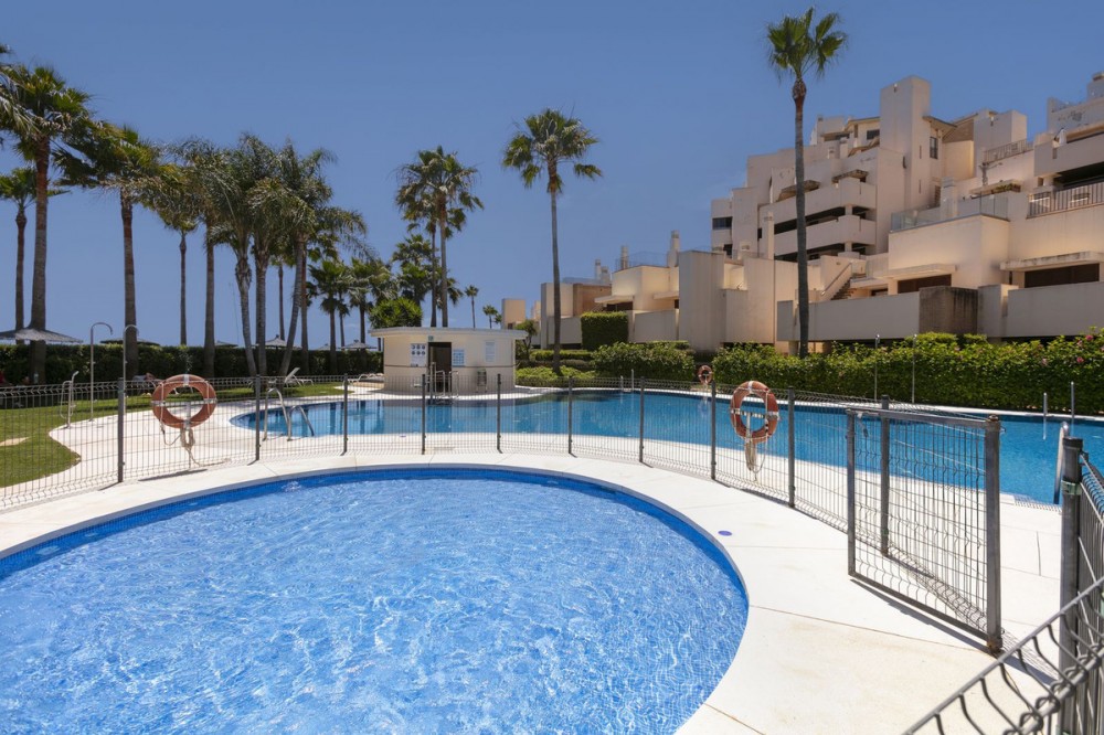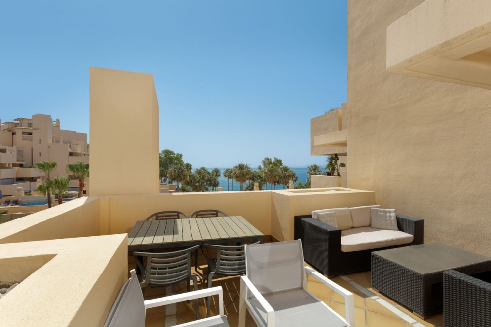 - Stunning 3 bed duplex with private rooftop pool located in the exclusive beachfront urbanisation Bahia de la Plata. Perfectly positioned with direct beach access and a short walk into the centre of Estepona and only 15 minutes drive from world famous Puerto Banus make this beautiful property the epitome of convenience. The community is gated and enjoys 24 hour security and concierge, large gymnasium with top quality weights and equipment, indoor spa centre with heated swimming pool, Turkish bath & sauna, padel tennis court & two large outdoor pools. The development is a short walk to a large number of restaurants and beach clubs including the famous Laguna Beach Club and even supermarkets. The apartment itself is built to a high standard & comes with underfloor hearting, electric roller shutters, jacuzzi bath and hot and cold air conditioning. The property is distributed with two bedrooms & bathrooms on the lower level with large sitting room leading out to a nice terrace with beautiful sea views, there is an internal staircase that leads up to another large terrace area, the 3rd bedroom & the large rooftop pool that belongs to the apartment. The perfect place for all day sun lovers where you can dip in and out of the privacy of your very own pool. Private underground parking space and storage are included. This property is stunning and must be viewed to be fully appreciated!