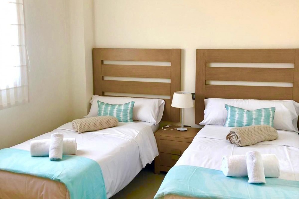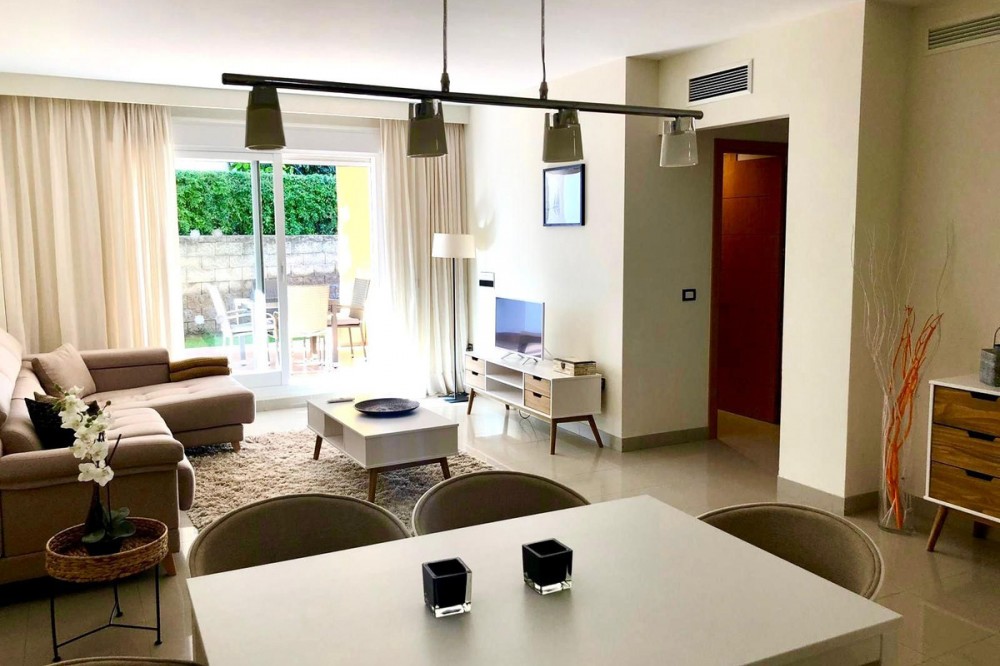 - As you enter this cozy oasis, you are greeted by a perfect blend of contemporary elegance and Mediterranean style. West charming ground floor apartment with spacious living room which open on to the terrace and private garden. Siematic fully fitted Kitchen with Siemens appliances and separately utility room. Two large bedrooms with fitted wardrobes, master bedroom with modern bathroom ensuite hydromassage bath and direct access to the terrace and garden, generous second bedroom and bathroom with walking shower. Parking space and storage including with the property. Gated complex with 24hrs concierge service, tropical gardens, swimming pools, Swimming pool bar. Walking distance from amenities and services such as El Campanario Club House ( reception, gym, heated swimming pool, massage room, sauna, massage room, beauty room, restaurant, social area…) and Diana Park Comercial Center.
