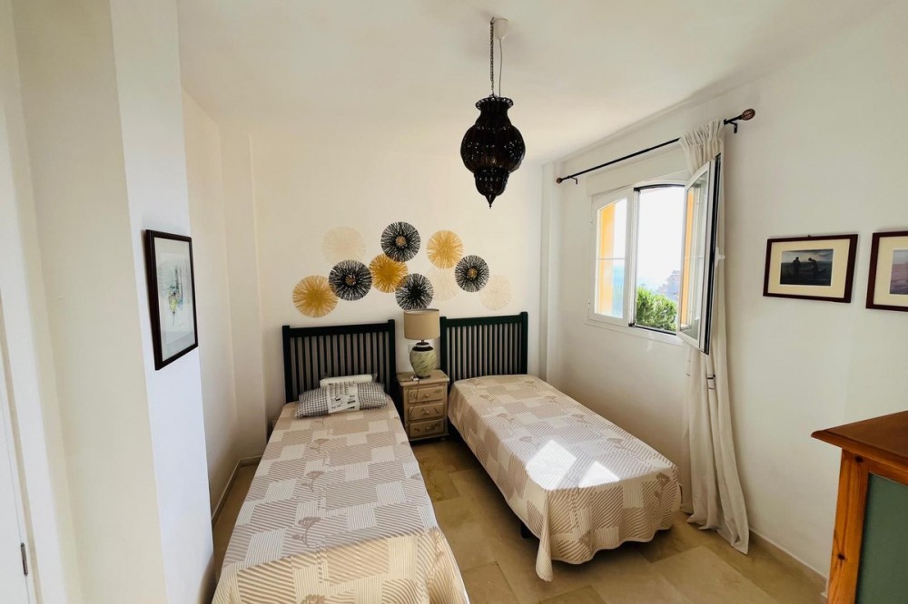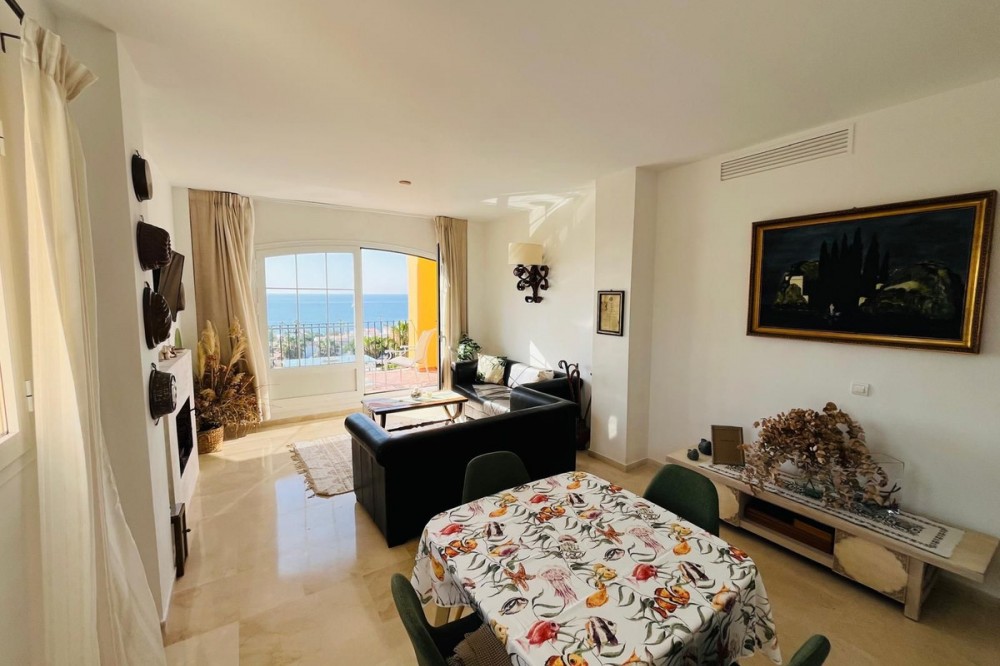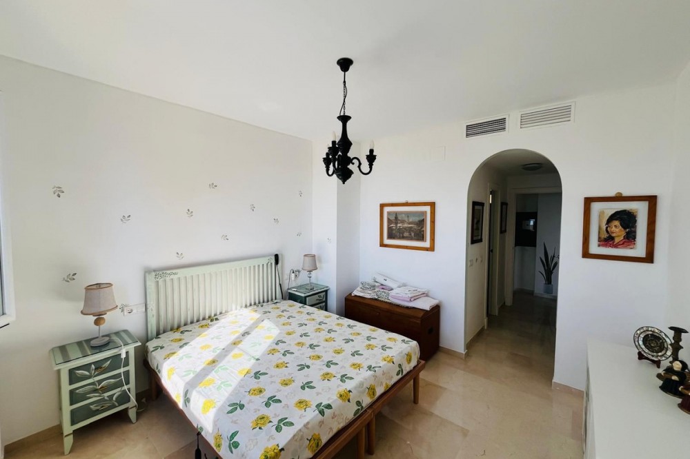 - A Rare Sea View Gem with Tourist License! To find a top floor penthouse with 2 bedrooms, 2 bathrooms, 2 terraces, and these sea views at this price point is rare. This apartment is a little over 90m2 and is in great condition, with touches of character like the arched doorways. It has 2 good sized bedroom, all with views of the sea. The master is a great size with a large en-suite. With a fully equipped closed kichen connected to a large shaded terrace for al fresco dining, as well as a dining area in the living room, this property never feels cramped. The living room is lovely - a worrking refurbished fireplace, a lovely large patio window/door bringing in the sea views, and a beautiful fron terrace to look out to sea. The property comes with an underground parking, nice communal pool, and is walking distance to the beach. To be clear, there is no underground storage unit. Note: This property already has the Andalusian Tourist License and is a good generator of income. Community fees are affordable at €400/Qtr (Micro) and €115/Qtr (Macro). Could this be your Paradise?