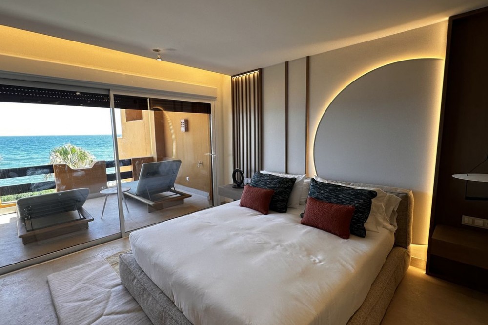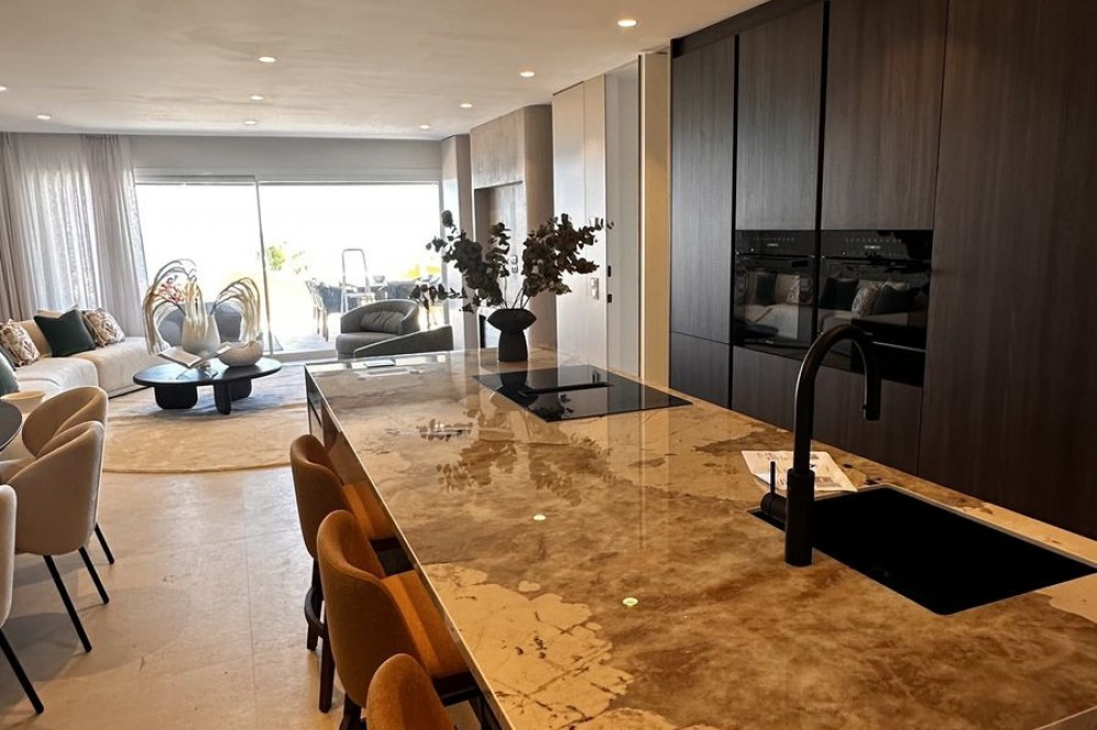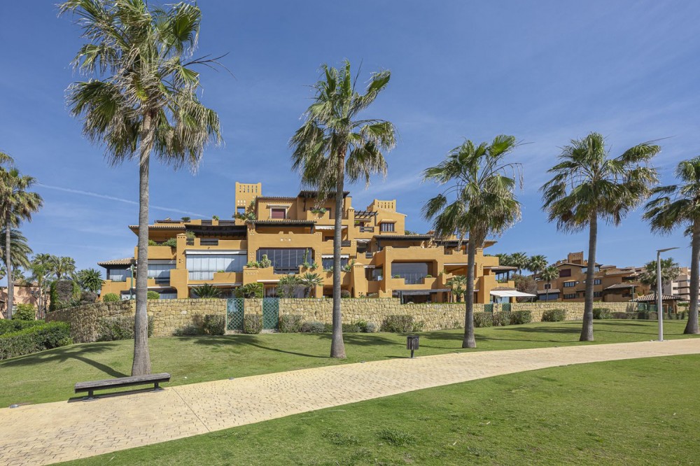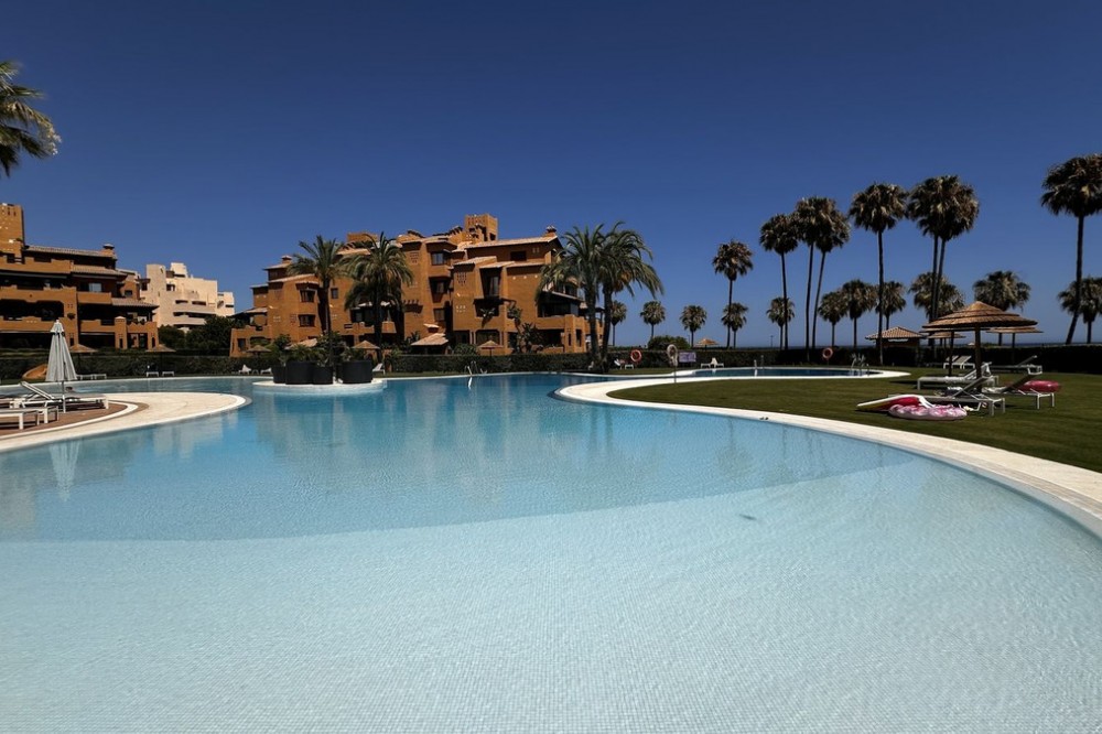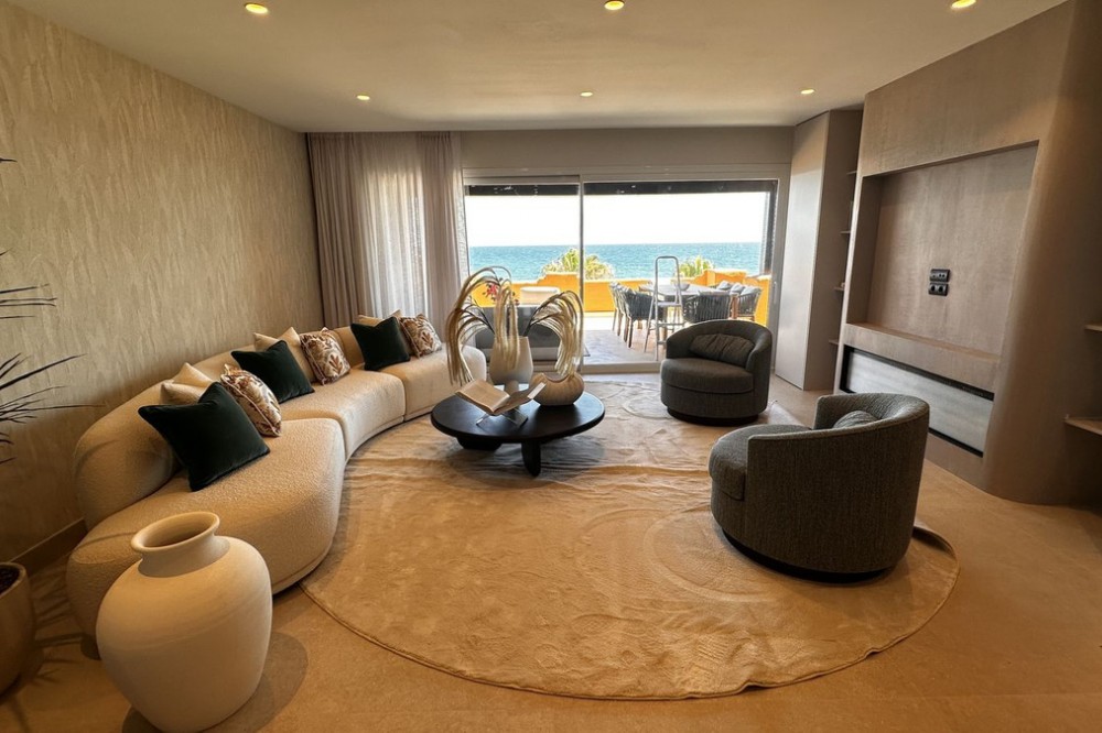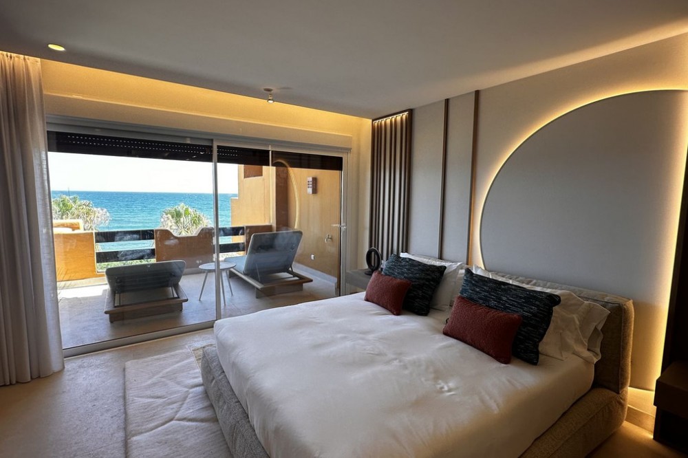 - This Front Line Beach Apartment presents itself as one of the most exclusive urbanisations on the **New Golden Mile** and combines luxurious living comfort with a spectacular location directly on the Mediterranean Sea. Luxurious designer flat on the -New Golden Mile- **(187 m², bright & modern with top fittings)** **Highlights of the apartment** ✔ **Open designer kitchen** (brand new) - High-quality **German brand appliances** - Integrated **B&O sound system** for first-class entertainment - Electric fireplace** for a cosy atmosphere ✔ **Master bathroom with luxury details** - Free-standing bathtub** as an eye-catcher - Walk-in wardrobe & high-quality materials ✔ **More premium features** - **Wine fridge** for wine lovers - **Second kitchen** / guest cooking area (depending on layout) - **Office area** or guest room possible #### **Exclusive location & communal comfort** - **Direct beach access** & Mediterranean Sea views - Access to **pools (3), sauna, fitness, 24h security** - **Laguna complex & Estepona centre** within walking distance --- **Perfect for discerning buyers looking for modern luxury & lifestyle! Here are some of the highlights of this prestigious development: *Luxury Amenities & Services** ✔ **Multiple pools**: Heated indoor pool + two outdoor pools ✔ **Wellness area**: Sauna, whirlpool and fitness centre ✔ **Gastronomy**: Own restaurant within the complex ✔ **Security**: 24-hour security service for maximum privacy ✔ **Maintained gardens**: Mediterranean landscaping with a high feel-good factor **Perfect location** ???? **Direct beach access** - just a few steps to the Mediterranean Sea ???? **Local amenities**: Shops, top restaurants and schools in the immediate vicinity ???? **Laguna complex**: Exclusive beach clubs, trendy bars and culinary highlights in the newly built complex.
