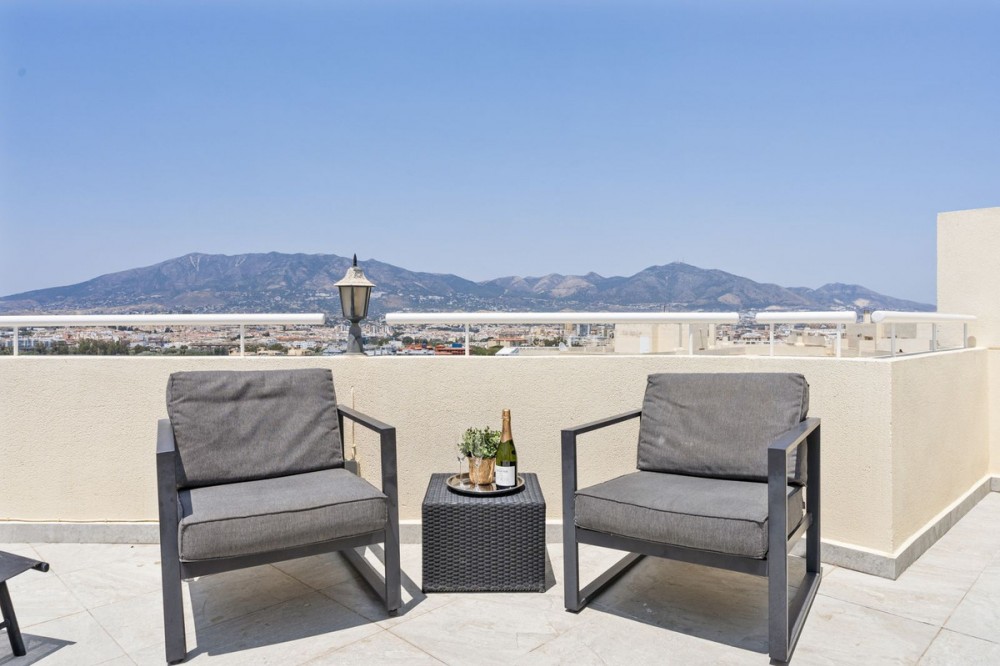 - Welcome to our large penthouse with 4 bedrooms and 125m2 terrace with Jacuzzi, located just around the corner from the Fuengirola Castle and the enormous shoppingcenter of Miramar in Fuengirola. This clean apartment features a large and fully equiped kitchen with a closed space with a washingmachine, there is a large livingroom with a spacious sofa, diningtable and a large tv and it leads out to the 460 degree terrace with panoramic views over the mountains and Fuengirola. Our place can host up to 8 persons over 4 bedrooms. There is a communal pool open during the summer months and a safe garage. The Jacuzzi will be prepared and ready for your arrival aswell the bbq for the good evenings. Bathrooms renovated winter 2023 Terrace renovated winter 2024 65.658€ in net revenue generated 2024-2025 as a vacation rental. Has tourist license and NRA number.
