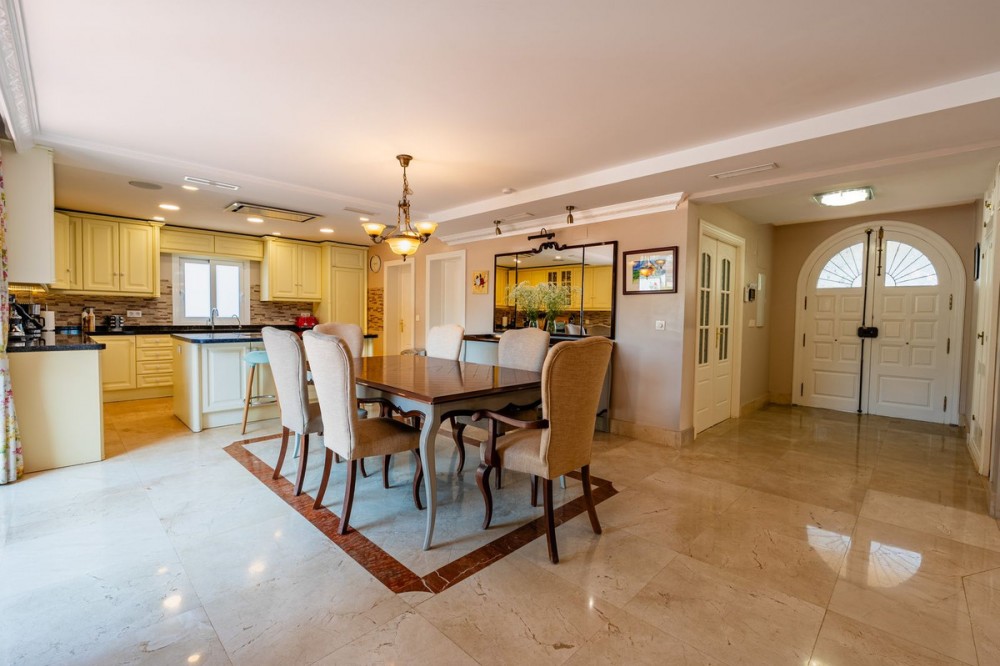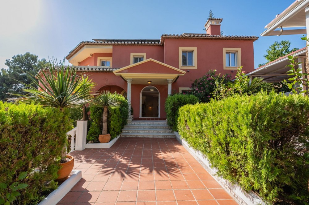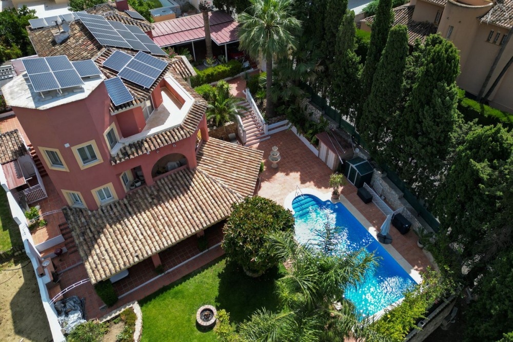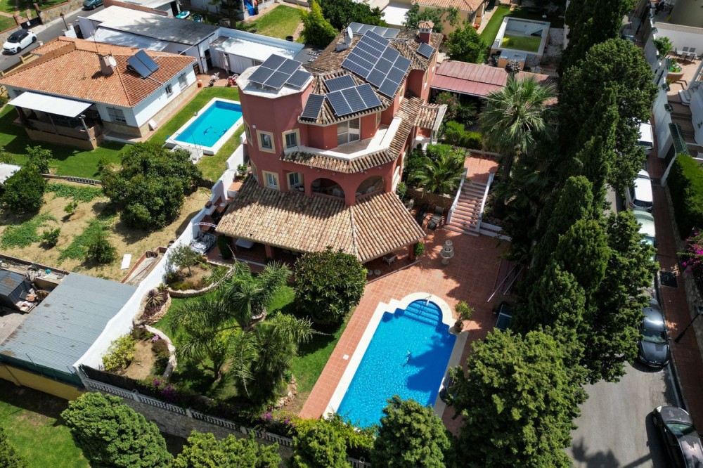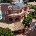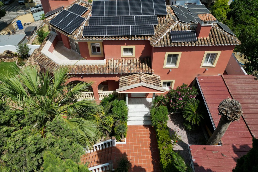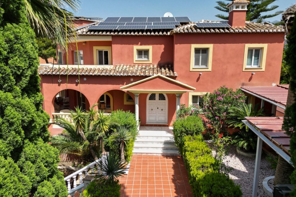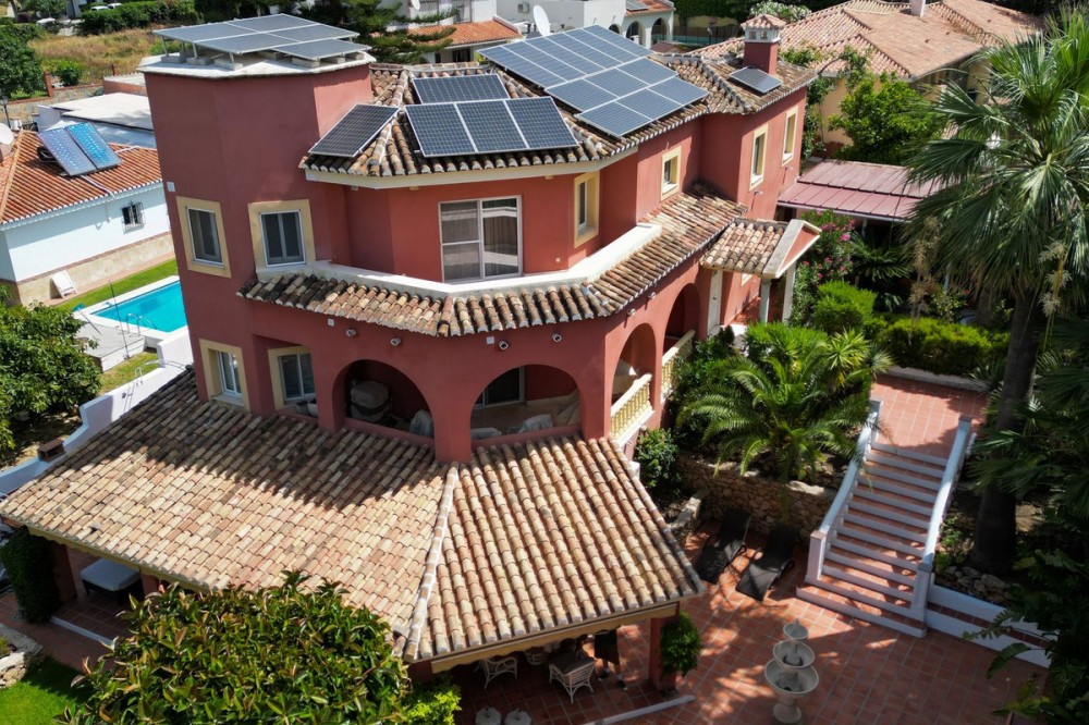 - Discover this stunning, luxory newly listed villa located in one of the most popular residential neighborhoods El Coto in Mijas. Set on a generous 946 m² southwest-facing plot, this meticulously upgraded villa offers 416 m² of light-filled living space across three refined levels. South-west orientation ensures warm natural light all day and postcard-perfect sunsets from the expansive main terrace. Step through the front door and into a home that welcomes you with comfort and space. The main floor boasts an open-concept design where a fully equipped American-style kitchen with granite countertops and a central island seamlessly connects to a spacious dining area and a dual-sitting lounge. Large glass doors open directly to the garden-view terrace, creating an effortless indoor-outdoor living experience. This floor also includes a serene study, a guest powder room, and a thoughtfully designed laundry and ironing room. Air conditioning and heating—via both split units and radiant floor heating in key areas—ensure cool summers and cozy warmth during the colder months. A state-of-the-art home automation system allows you to control lighting, blinds, and climate throughout the house, while high-speed fiber-optic internet is available, ideal for remote work or streaming. Upstairs, the master suite is your private retreat. It features a walk-in wardrobe, a luxurious ensuite with a double shower, soaking tub, in-floor heating, and a private terrace. Two additional bedrooms on this level offer built-in wardrobes and full ensuite private bathrooms—both with shower and tub—providing elegant comfort and privacy for family or guests. The lower level is where functionality meets flexibility. Enjoy a dedicated home cinema, a second full kitchen, and a spacious suite combining bedroom and lounge with a private bathroom and direct garden access. Ideal as a guest apartment, games room, or independent living space. Outdoors, the home continues to impress. A beautifully maintained garden surrounds a heated saltwater pool—perfect for year-round use. A built-in barbecue area invites entertaining, and the generous garage easily accommodates up to four vehicles. There are also three large separate buildings for additional storage. The property is located within a secure, quiet residential area with 24-hour private security, ensuring peace of mind for you and your family. Sustainability and modern convenience go hand in hand with 36 solar panels, offering considerable energy savings and reflecting the home’s commitment to eco-conscious living. This turnkey villa is in excellent condition, located in the highly desirable residential area of El Coto in Mijas. International schools are within easy reach, with the prestigious San Francisco School just 200 meters away. Grocery stores, playgrounds, and clinics are all less than a 5-minute drive, making daily life exceptionally convenient. Rental Investment Potential The villa presents an attractive opportunity for both short-term and long-term rental income. The property holds an active tourist license (VFT), allowing immediate rental operations and maximizing investment potential in one of the Costa del Sol’s most in-demand areas. Don’t miss your chance to own one of Mijas’ most thoughtfully designed homes, in a peaceful neighborhood ideal for families, professionals, or investors. Contact us to schedule your private viewing.