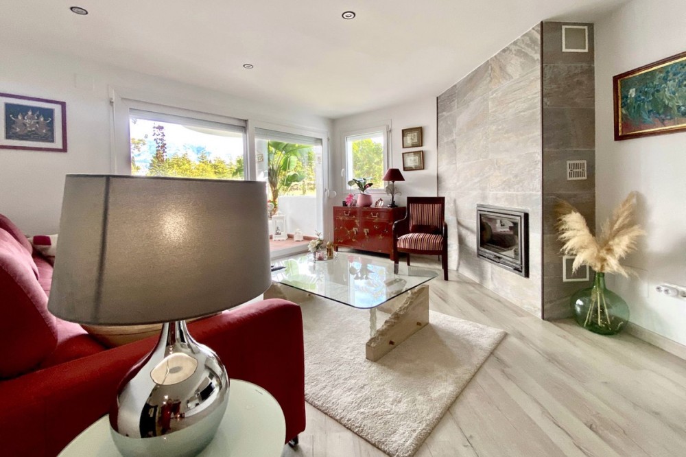 - STUNNING ULTRA LUXURY/MODERN APARTMENT in front line Mijas Golf location. Refurbished to the very highest of standards. The property consists of a spacious lounge/dining room, modern fully fitted kitchen, master bedroom with en-suite bathroom, another double bedroom with walk in wardrobe (formerly second bathroom, but with all plumbing still in place to be made into a bathroom again easily), a small southwest terrace overlooking the immaculately kept communal gardens and swimming pools and a large covered north east terrace overlooking the golf course and mountains. Amongst the many improvements made to this property are: fully insulated walls, ceiling, and floors for temperature regulation and noise reduction, quality double-glazing glass on windows and sliding doors throughout the house, new plumbing and wiring, and a feature wood-burning fireplace. Underground car parking space and store room are also included in the price. Just 600m to the local mini supermarket, bus stop, and a 5-minute drive to Fuengirola with its beautiful sandy beaches, massive selection of shops, bars, and restaurants, and just a short walk to local amenities. Fabulous for holidays and all-year-round living. A dream of a property! Community fees: 157 euros per month IBI fees: 650 euros per month Apartment Built Area including Terraces: 119m² Parking Space: 13m² Storage Room: 4m²