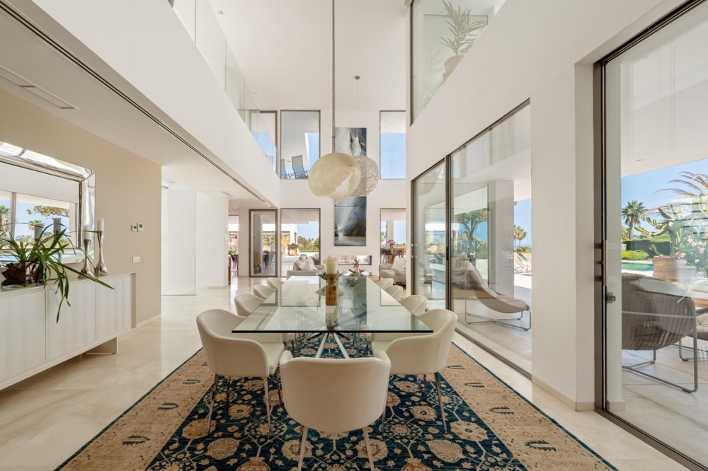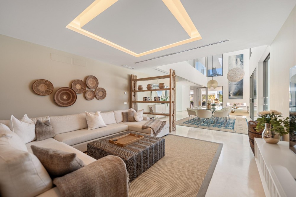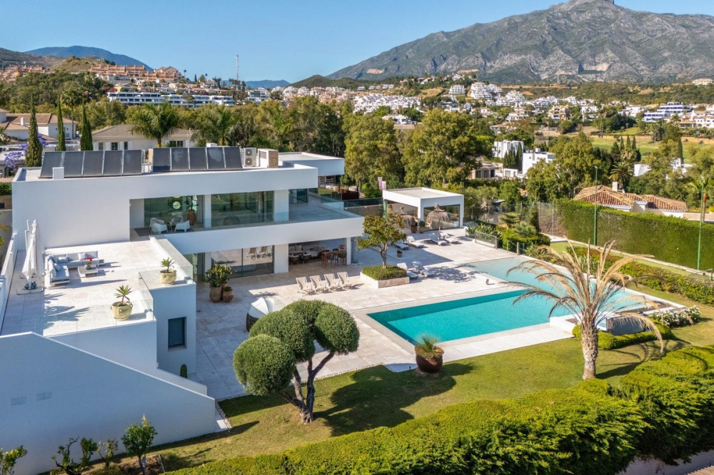 - Introducing a stunning contemporary villa located in the prestigious neighbourhood of La Cerquilla, nestled in the heart of Nueva Andalucía’s Golf Valley. This exclusive 7-bedroom residence sits on a generous 2,548m2 plot, offering unmatched privacy and panoramic views of Marbella’s iconic La Concha mountain and the Mediterranean coastline. Its prime location places it within close proximity to top golf courses, international schools, upscale restaurants, and the vibrant Puerto Banús marina, making it an exceptional investment and lifestyle choice. Step inside to discover expansive interiors thoughtfully designed with natural textures and rich finishes. The villa boasts soaring ceilings, elegant lighting features, and a harmonious flow between indoor and outdoor living. The main living areas are spacious and inviting, adorned with custom furnishings, organic materials, and curated decor elements such as woven wall art and hand-crafted ceramics. The upper floor showcases a tranquil gallery-style corridor overlooking the main level, with direct access to bedrooms that enjoy sweeping views and private terraces. At the heart of the home is a modern kitchen outfitted with premium appliances, sleek cabinetry, and a large glass dining area framed by floor-to-ceiling windows. The seamless connection to the outdoor living spaces includes an impressive pool with a jacuzzi, Balinese- style sun loungers, and a covered dining terrace with a fireplace and barbecue setup—perfect for entertaining. What's best is the private pristine tennis court at the foot of the garden, ideal for residents to use all year round. This villa epitomises contemporary luxury in a Mediterranean setting, offering an unparalleled blend of comfort, sophistication, and location.
