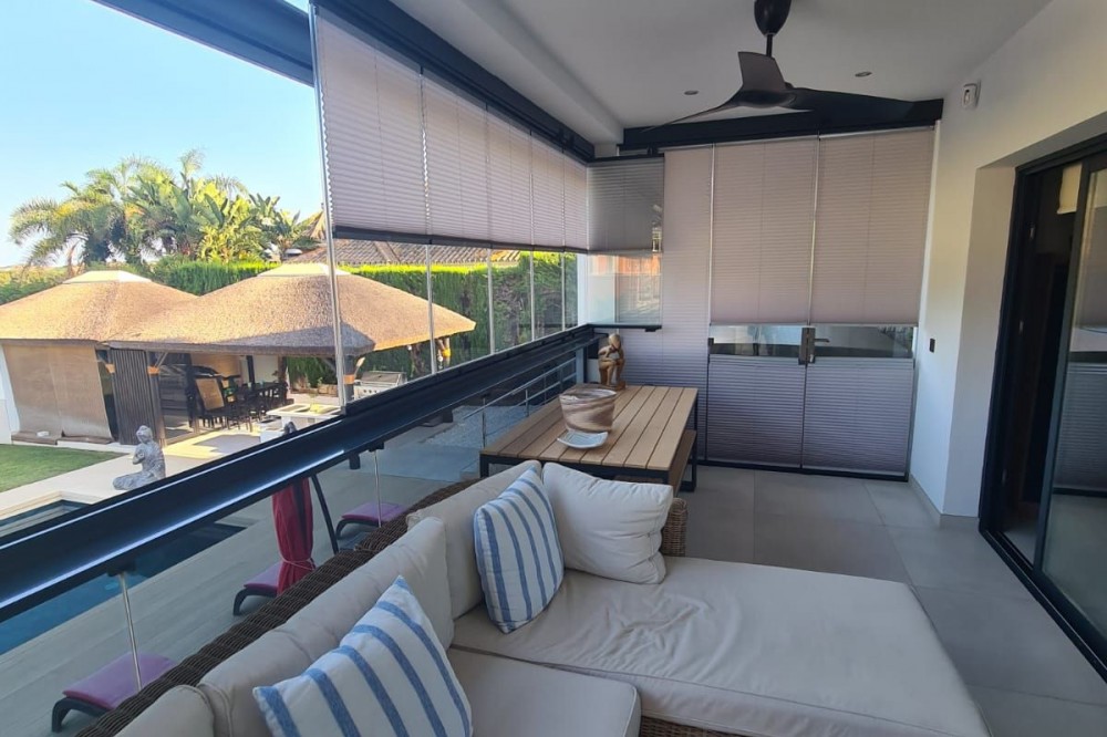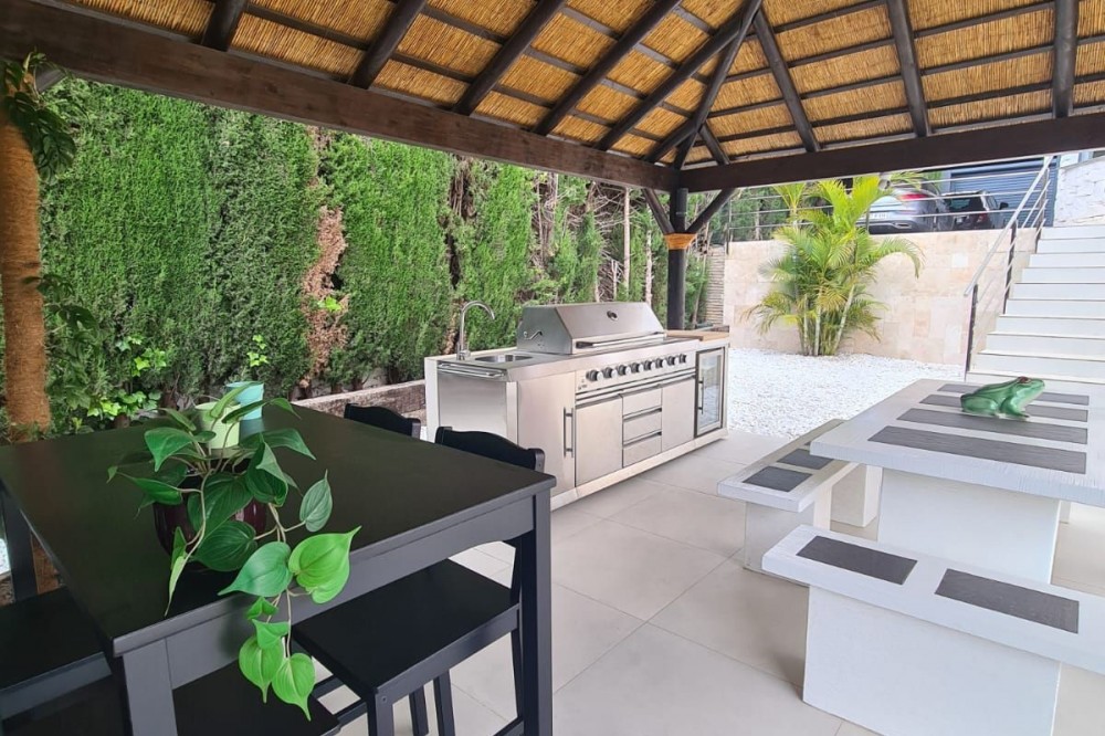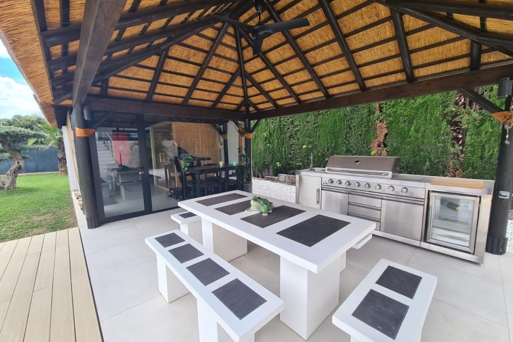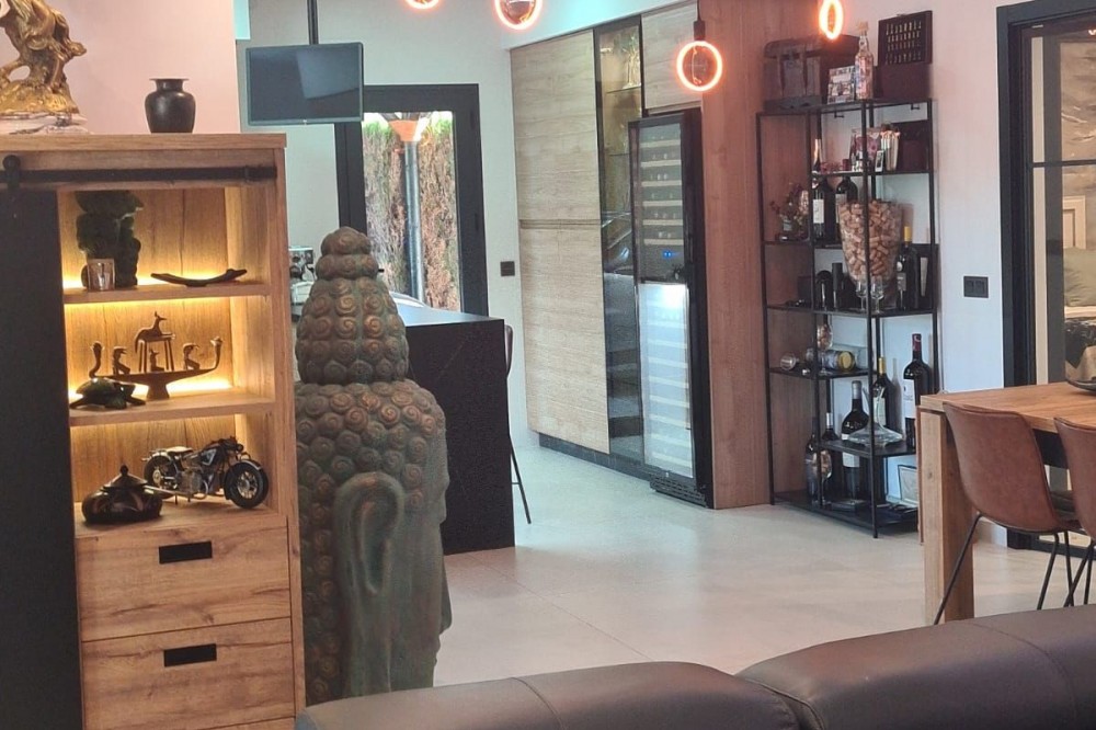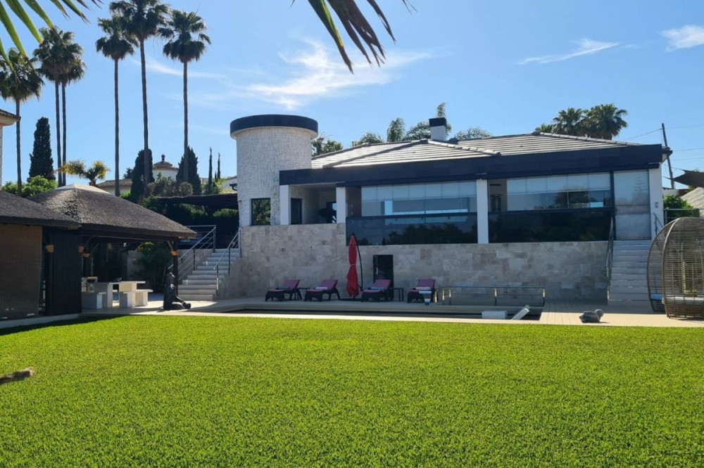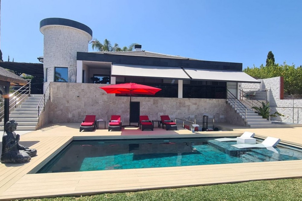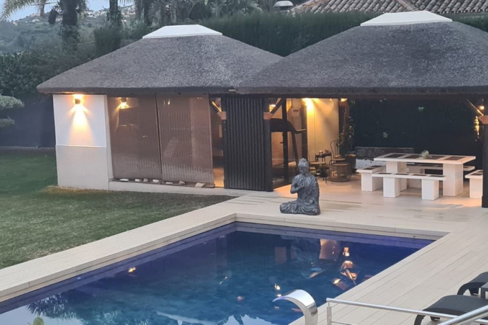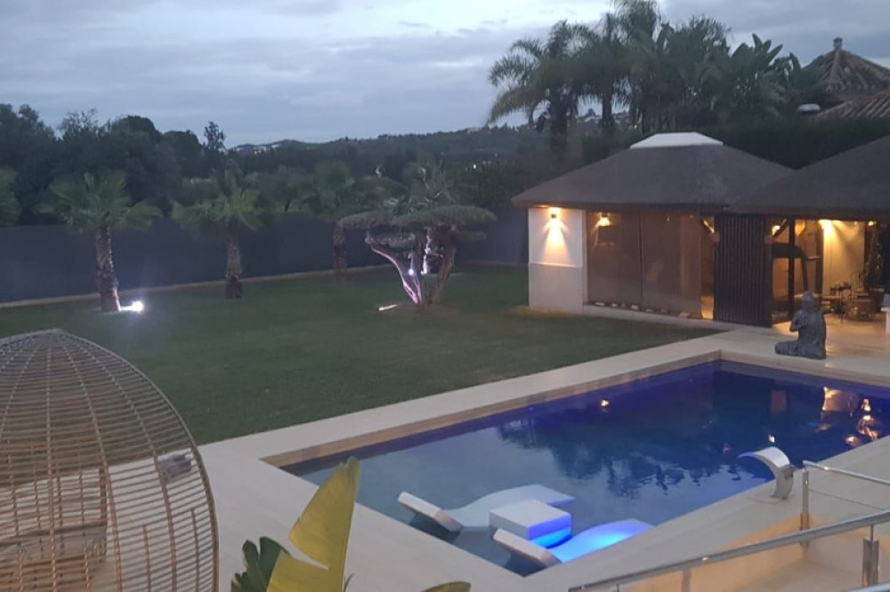 - Single-storey villa, completely renovated with high-quality finishes, located in a quiet area of the sought-after Mijas Golf residential area, on a 1,065-square-metre plot. This villa is an exceptional residence that combines contemporary design with elegance and offers a relaxed lifestyle in a well-connected neighbourhood The meticuloustly designed areas enable enjoymet of every aspect of the house. An elegant entrance porch with a pivoting security door leads to a very welcoming hallway that separates the master bedroom from the rest of the house. Spacious living-dining room that connects directly to a semi-open kitchen and leads to a covered seating area where you can enjoy the views even from an integrated jacuzzi. The suspended fireplace and décor create a very sophisticated atmosphere. Master suite with dark glass illuminated wardrobe and shoe organiser. Modern bathroom with elegant bathtub and walk-in shower. Guest bedroom Cinema room /third bedroom Shower room. The villa is equipped with individually controlled ducted air conditioning, alarm system, solar panels. All rooms have been tastefully furnished, adding a refined style to the property. Wooden gazebo with thatched roof with a summer kitchen and dining area Gym/yoga area, sauna and a guest toilet Balinese-style swimming pool and shower, surrounded by synthetic wood-effect flooring. Chillout area next to the pool Carpot for 3 vehicles next to a secondary entrance. Machinery/garden/storage room Exceptionally well-kept garden with palm trees. Cobblestone terrace Sold fully furnished and with most of the ornaments
