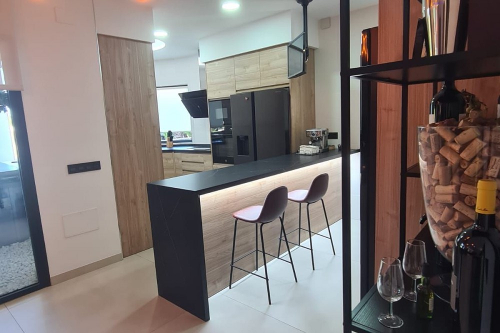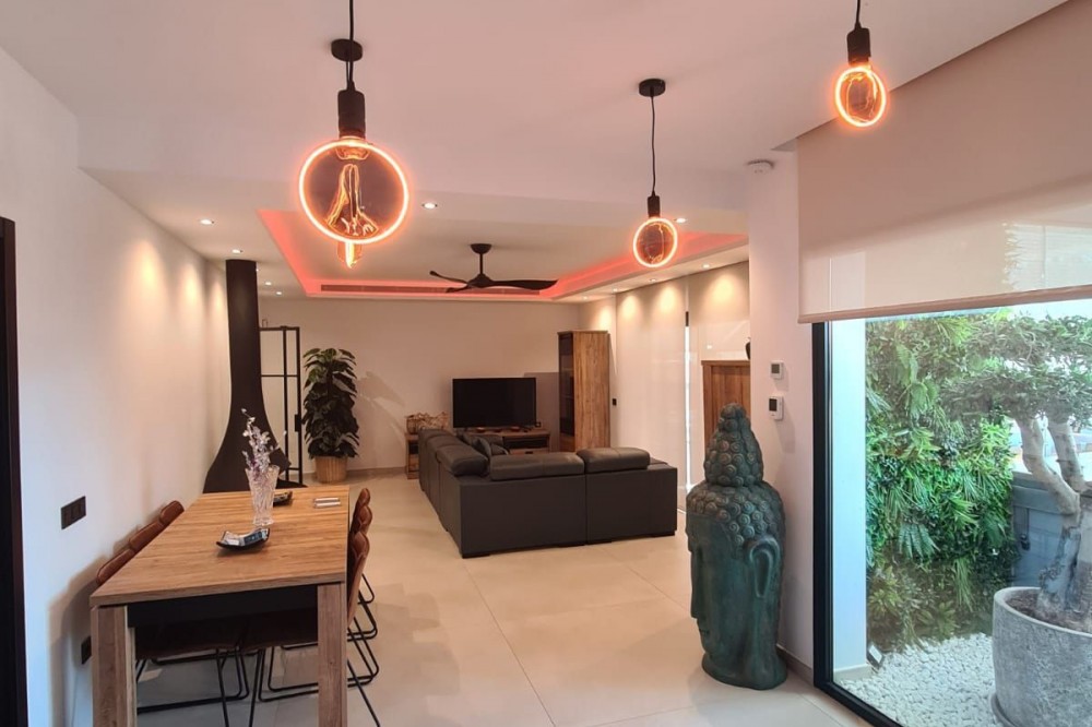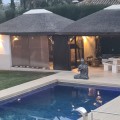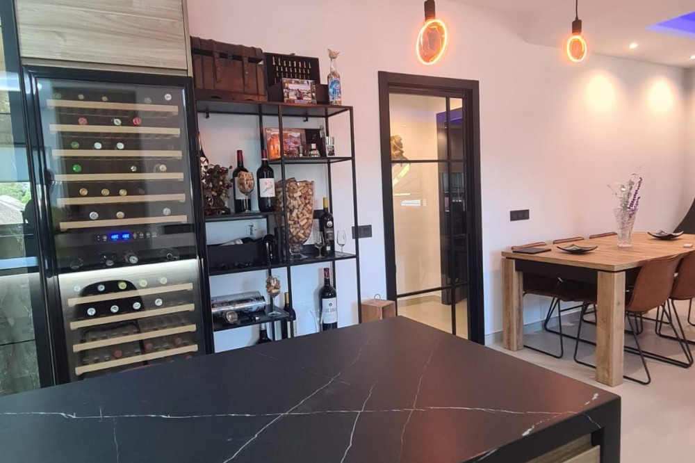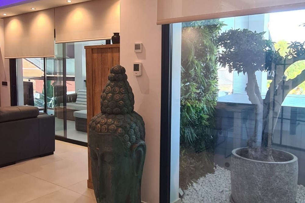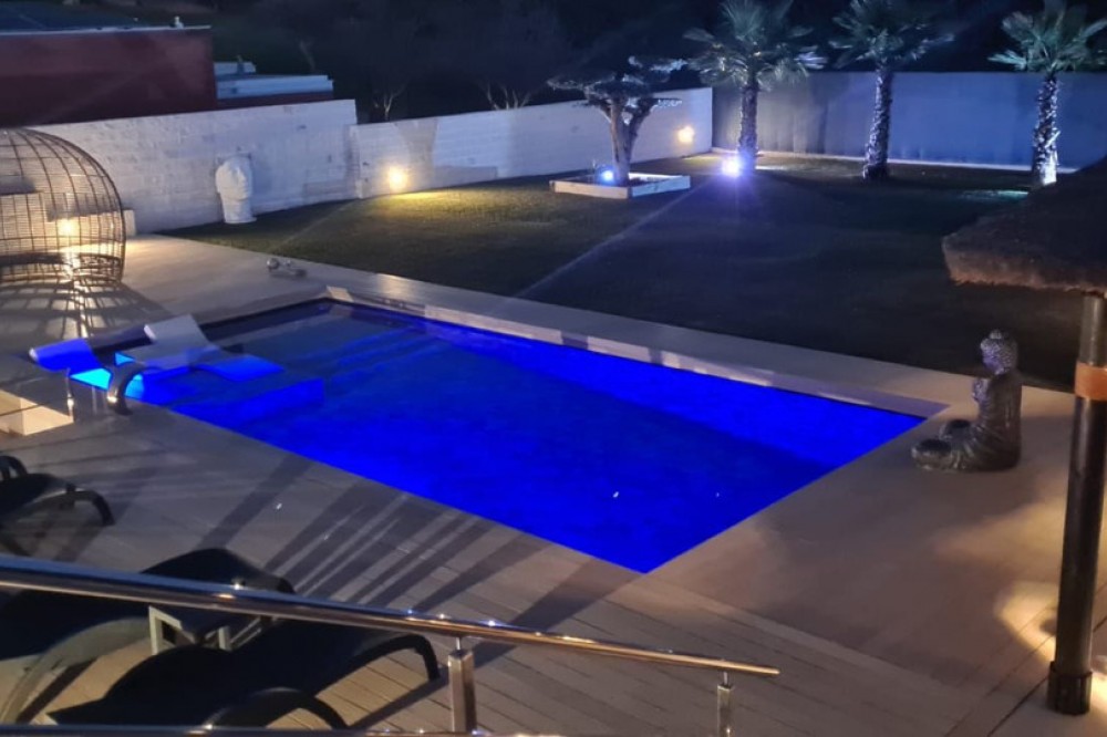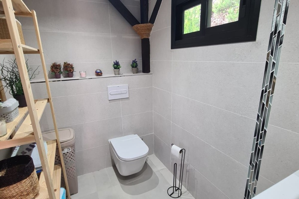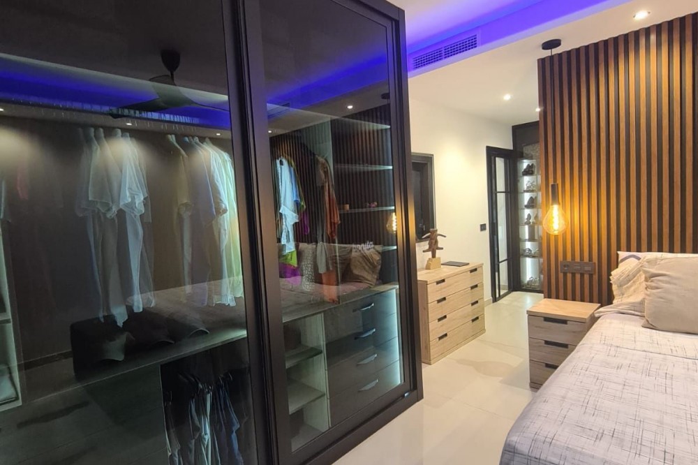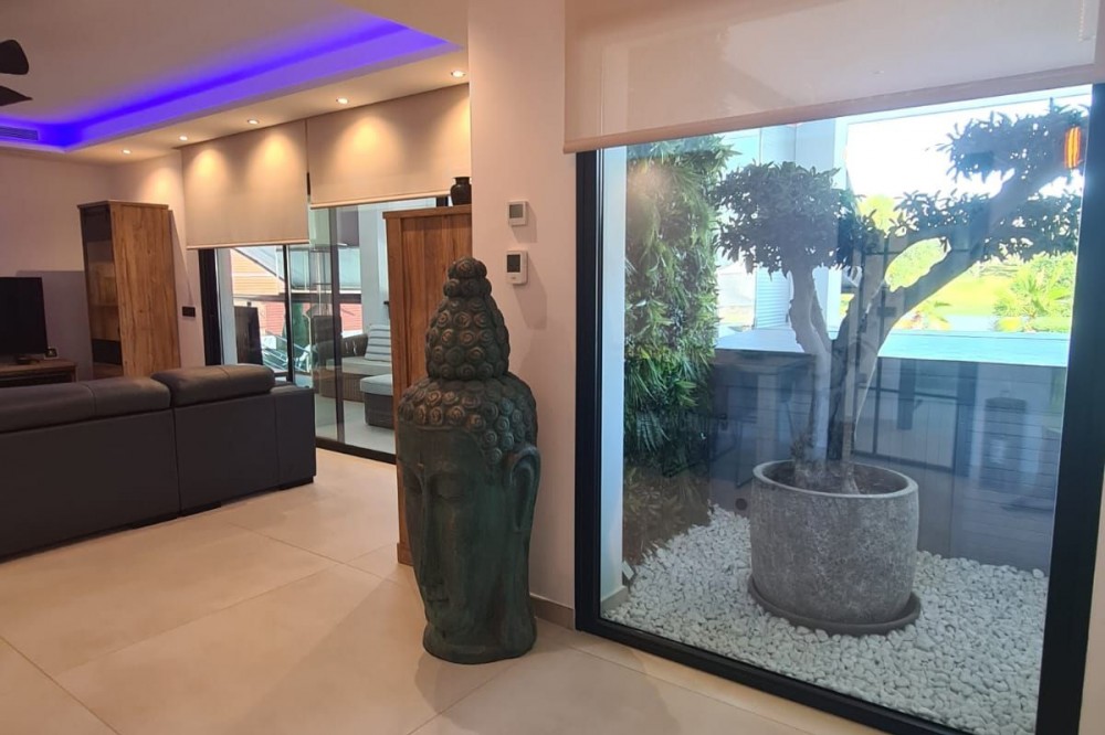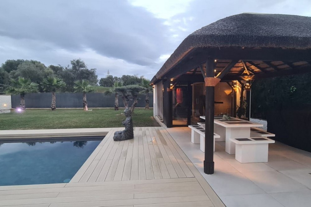 - Single-storey villa, completely renovated with high-quality finishes, located in a quiet area of the sought-after Mijas Golf residential area, on a 1,065-square-metre plot. This villa is an exceptional residence that combines contemporary design with elegance and offers a relaxed lifestyle in a well-connected neighbourhood The meticuloustly designed areas enable enjoymet of every aspect of the house. An elegant entrance porch with a pivoting security door leads to a very welcoming hallway that separates the master bedroom from the rest of the house. Spacious living-dining room that connects directly to a semi-open kitchen and leads to a covered seating area where you can enjoy the views even from an integrated jacuzzi. The suspended fireplace and décor create a very sophisticated atmosphere. Master suite with dark glass illuminated wardrobe and shoe organiser. Modern bathroom with elegant bathtub and walk-in shower. Guest bedroom Cinema room /third bedroom Shower room. The villa is equipped with individually controlled ducted air conditioning, alarm system, solar panels. All rooms have been tastefully furnished, adding a refined style to the property. Wooden gazebo with thatched roof with a summer kitchen and dining area Gym/yoga area, sauna and a guest toilet Balinese-style swimming pool and shower, surrounded by synthetic wood-effect flooring. Chillout area next to the pool Carpot for 3 vehicles next to a secondary entrance. Machinery/garden/storage room Exceptionally well-kept garden with palm trees. Cobblestone terrace Sold fully furnished and with most of the ornaments