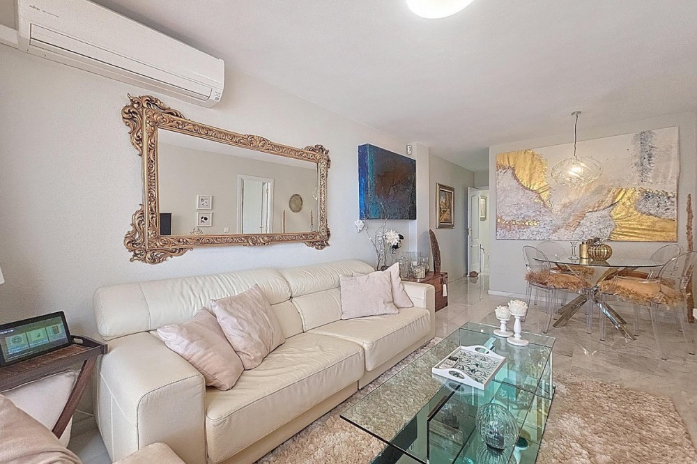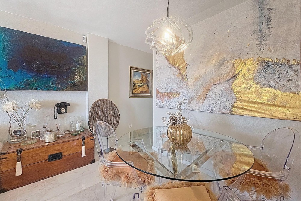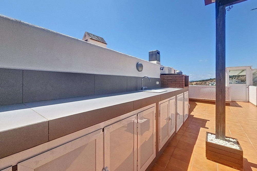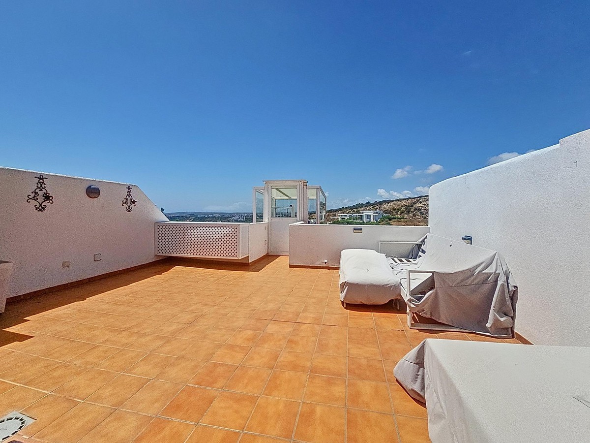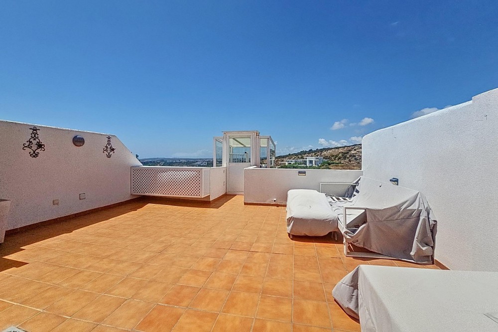 - Located in the peaceful and sought-after urbanization of Hacienda Casares, near the prestigious Doña Julia golf course, this 3-bedroom, 2-bathroom apartment stands out for its excellent condition and high-quality features. The master bedroom has its own en-suite bathroom, recently renovated with modern materials, offering a private and comfortable space. The independent kitchen is fully equipped with high-end appliances, perfect for cooking enthusiasts. The living area opens onto a pleasant terrace enclosed with a Lumon system, ideal for year-round enjoyment, and stairs lead up to a spacious private solarium of 72 m² boasting spectacular views of the Mediterranean Sea and the Doña Julia golf course. The property also includes a private parking space and a storage room, adding extra convenience to daily life. Close to the beaches, La Duquesa marina, and all amenities, this apartment is perfect as a primary residence or holiday home.