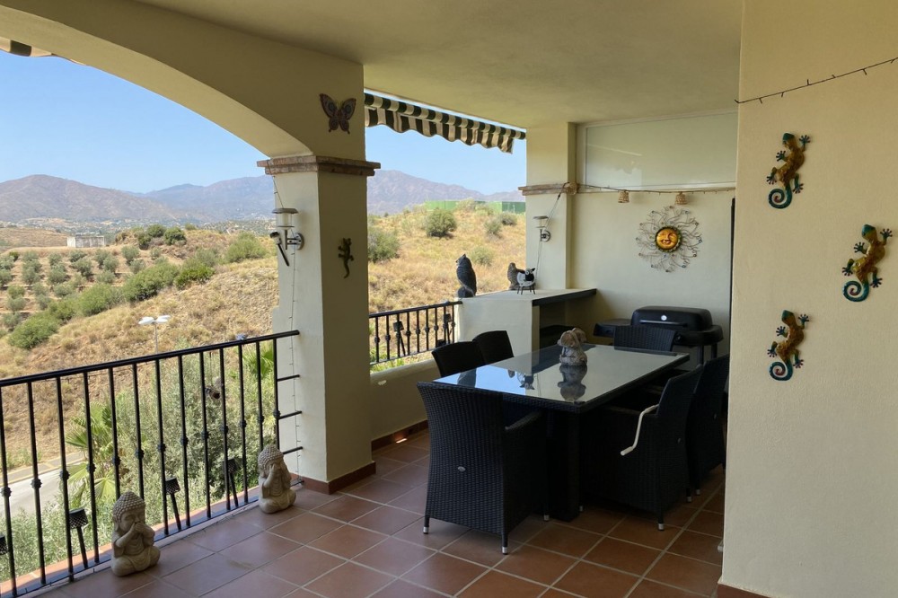 - A SUPERB, HIGH QUALITY 1ST FLOOR APARTMENT IN A MUCH DEMANDED URBANIZATION. WONDERFUL MOUNTAIN, GOLF AND COUNTRY VIEWS. Westerly orientation, secure underground parking. AT A GLANCE 2 BEDROOMS 2 BATHROOMS - ONE EN SUITE EXPANSIVE TERRACE SPACIOUS LOUNGE/DINER OPEN, PANORAMIC VIEWS ONE LEVEL SECURE GATED COMMUNITY Direct lift access from the underground parking to the first floor. Entrance hall with storage, leading to the luminous and spacious lounge/diner with triple, sliding patio doors leading to a large terrace which is ideal for entertaining and al fresco dining. Fully fitted kitchen with granite work surfaces and Endesa, Daewoo and Hisense appliances. The kitchen also benefits from a breakfast bar and off the kitchen is a utility room with additional storage. There is a good sized guest double bedroom, family shower room and Master bedroom with en suite and access to the terrace. The property is equally desirable as a holiday home, or for permanent living. The apartment has the most glorious views looking towards the fairways of Santana golf and the mountains. The terrace is the ideal place to marvel at the stunning sun sets whilst enjoying your favourite cocktail. ADDITIONAL FEATURES AIR CONDITIONING HOT/COLD MARBLE FLOORS COVING BUILT IN WARDROBES DEDICATED, SECURE PARKING SPACE WITH ADDITIONAL STORAGE ROOM DOUBLE GLAZING THROUGHOUT HOLIDAY RENTALS PERMITTED Excellent rental potential. COMMUNITY FACILITIES Very well tended community gardens. Children’s pool and main pool. Property is sold unfurnished except for the terrace furniture. LOCATION Ideally located close to a small commercial centre with bars and restaurants and within walking distance of the highly regarded school, St. Anthony’s College. SANTANA GOLF COURSE 6 MINUTES BEACH/FUENGIROLA 15 MINUTES MARBELLA 30 MINUTES MALAGA 25 MINUTES LA CALA 10 MINUTES