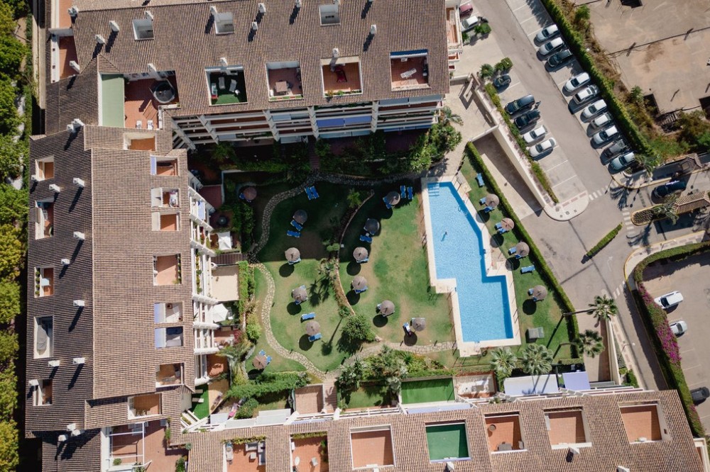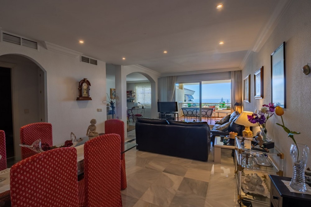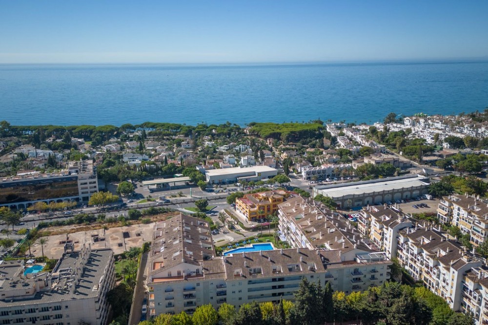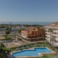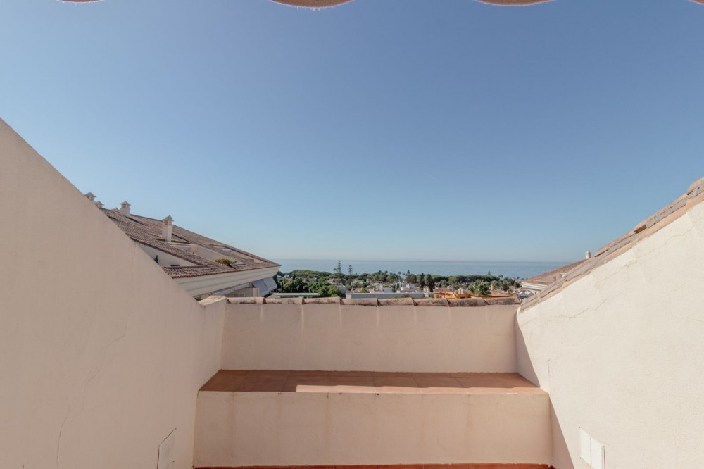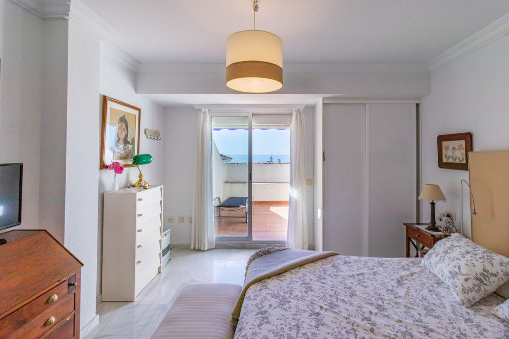 - Stunning corner duplex on the top floor with breathtaking sea views. This spacious property features 4 bedrooms and 3 bathrooms, perfect for a large family or those who love to entertain. The fully equipped kitchen opens up to a generous living area, providing direct access to the terrace with panoramic sea views. Each of the 3 bedrooms also has its own private terrace with blinds. The interior boasts white marble flooring, lacquered white woodwork and built-in furniture, and cream marble bathrooms. Sold fully furnished, this duplex also includes a garage and storage room. The location is unbeatable, just a few minutes' walk from the beach, city center, supermarkets, and public transportation. The community offers a pool and 24-hour security. Don't miss out on this well-maintained gem! 185m² built, 157m² usable, 4 bedrooms, 3 bathrooms, terrace, second hand/good condition, storage room, built in 2002, elevator, south facing, garage included in the price, air conditioning, pool, garden..