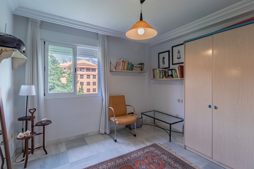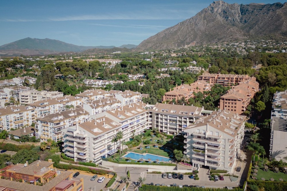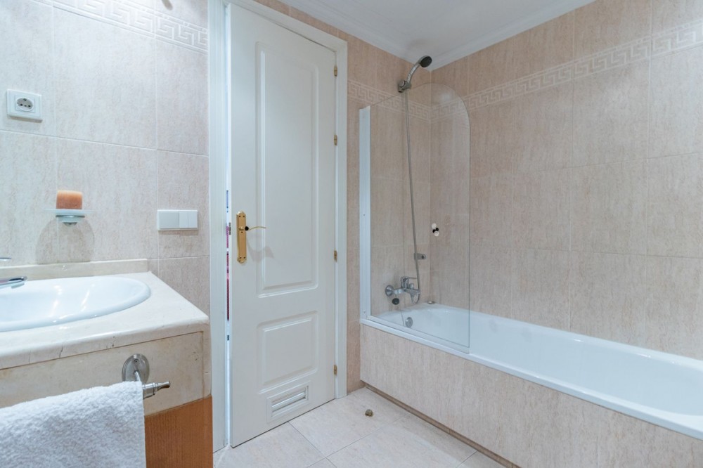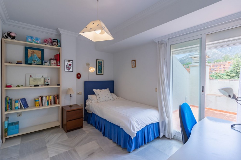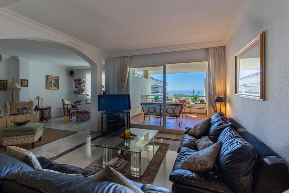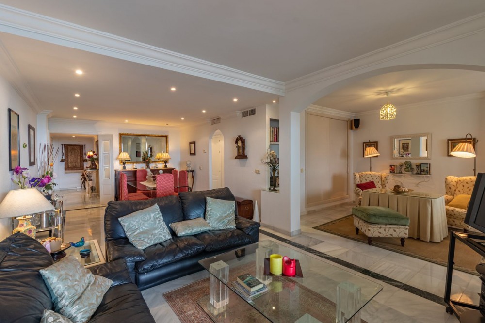 - Stunning corner duplex on the top floor with breathtaking sea views. This spacious property features 4 bedrooms and 3 bathrooms, perfect for a large family or those who love to entertain. The fully equipped kitchen opens up to a generous living area, providing direct access to the terrace with panoramic sea views. Each of the 3 bedrooms also has its own private terrace with blinds. The interior boasts white marble flooring, lacquered white woodwork and built-in furniture, and cream marble bathrooms. Sold fully furnished, this duplex also includes a garage and storage room. The location is unbeatable, just a few minutes' walk from the beach, city center, supermarkets, and public transportation. The community offers a pool and 24-hour security. Don't miss out on this well-maintained gem! 185m² built, 157m² usable, 4 bedrooms, 3 bathrooms, terrace, second hand/good condition, storage room, built in 2002, elevator, south facing, garage included in the price, air conditioning, pool, garden..