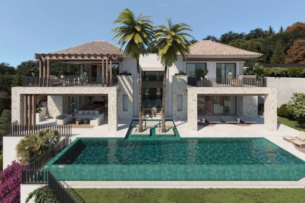 - New Development: Prices from €18,000,000 to €18,000,000. [Bedrooms: 8] [Bathrooms: 8] [Built size: 1343m2]. This is a majestic contemporary villa in the exclusive 24hrs double gated community of El Herrojo Alto, Marbella. The layout contains 3 floors with 8 bedrooms and 8 bathrooms, 2 of the bedrooms with private access. An open plan living space and extensive outside space, including multiple terraces and a stylish pergola equipped with an outdoor kitchen and dining area. The property has an impressive private swimming pool – and a private sports club with Tennis, Padel, Beach Volley and 5 aside Football. The villa sits on an elevated position ensuring undisturbed sea-views. This property is ideally located within close proximity to several golf and country clubs and restaurants. Puerto Banús is only 6.8km away and the Puente Romano Beach Resort is just a short drive. Ideal for those who wish to enjoy the peace and privacy, with the benefit of being within easy reach of a wide range of upmarket amenities.