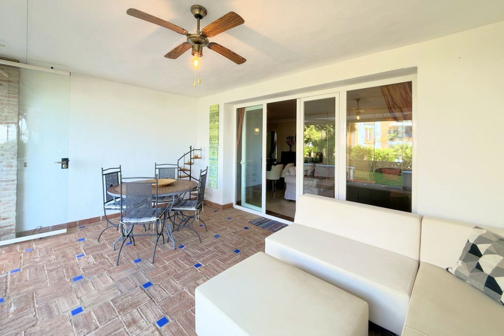 - NEW TO THE MARKET: IMPRESSIVE FIRST-LINE BEACH APARTMENT, GROUND FLOOR, CORNER UNIT, with a PRIVATE GARDEN perfectly maintained by the community, offering SPECTACULAR VIEWS OF THE SEA, THE BEACH, GIBRALTAR, AND AFRICA. Located in the beautiful Bay of Casares, next to a protected historical area with an ancient Arab tower, within the stunning La Perla de la Bahía complex, beautifully designed by fusing Andalusian and Arab styles. Surrounded by lush gardens, magnificent pools (2 heated), a wide variety of decorative fountains, and relaxation areas designed for ultimate enjoyment. Only a 2-minute walk to 3 different beaches, 2 renowned restaurants, and the prestigious Finca Cortesín golf resort, which is awarded every year as the Best Golf Resort in Spain, is ranked among the 50 best golf courses in the world, and hosted the prestigious Solheim Cup competition in 2023, among others. Strategically located between Estepona and the charming Puerto de la Duquesa and the village of Sabinillas, all just a 5-minute drive away, offering access to a wide range of shops, restaurants, leisure activities, and different golf courses. The gated community offers 24-hour security and video surveillance, ensuring peace of mind and safety. This property includes 2 parking spaces in a garage and 1 large storage room. All of this makes it not only a dream residence but also an outstanding investment opportunity with high rental potential. A unique property that must be seen!