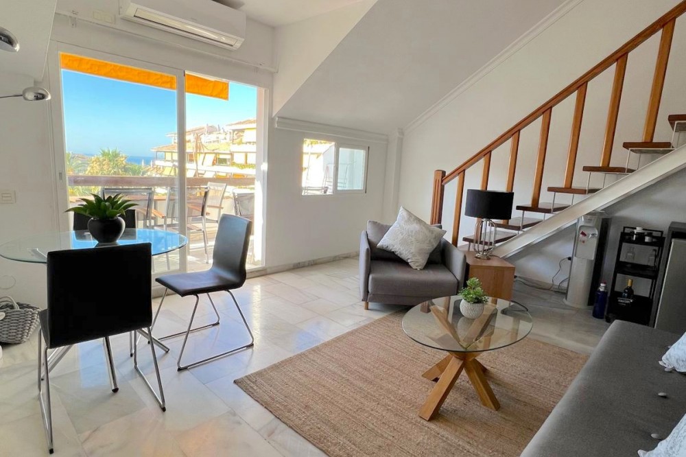 - Located within one of the most sought-after gated communities on Marbella’s Golden Mile, this elegant duplex boasts a coveted south-facing orientation with open views over beautifully landscaped gardens, a large communal swimming pool, and partial sea views. The property is distributed over two levels and has been recently refurbished to high standards. The main floor features a bright, double-height living-dining area with a sleek open-plan kitchen, one bedroom, and a full bathroom. The upper level offers a charming attic-style second bedroom and an additional bathroom. Modern comforts include air conditioning, new awnings, and a contemporary interior design that blends sophistication with comfort. The secure gated community offers daytime concierge service and night-time security. Ideally located just 350 metres from the beach, and within walking distance to all amenities, fine dining, and Marbella’s city centre. Residents enjoy access to extensive gardens, tennis courts, and a generously sized swimming pool. A unique property in the most exclusive area of Marbella — perfect as a primary residence or a high-value investment opportunity.