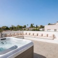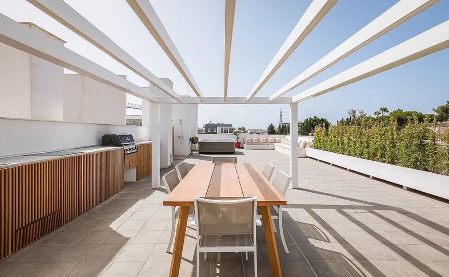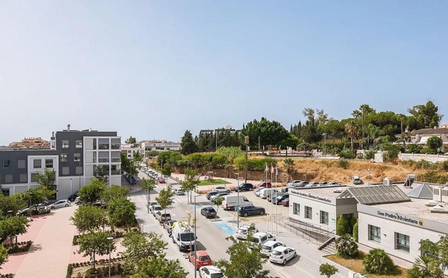 - Located in a recently built development, in a prime position just steps from the center of San Pedro de Alcántara, this elegant penthouse combines modern design, comfort, and an unbeatable location, surrounded by all amenities: charming cafés, supermarkets, pharmacies, and schools. The property features a bright open-plan living and dining area with a fully fitted kitchen equipped with Whirlpool appliances, opening directly onto a covered terrace – perfect for enjoying breakfast or relaxed dinners outdoors. It offers 4 spacious bedrooms and 3 full bathrooms, plus a guest toilet that adds extra convenience for visitors. The highlight of this home is its spectacular 150 m² private solarium, boasting panoramic views of La Concha mountain. With its jacuzzi and barbecue area, it becomes the perfect space for family gatherings, entertaining guests, or simply enjoying the Mediterranean sun all year round. Key features include: Porcelain stoneware flooring Large windows with solar control and thermal & acoustic insulation Built-in wardrobes LED lighting Aerothermal system for air conditioning and hot water In addition, the property includes 2 parking spaces and a storage room in the underground garage of the community. A unique opportunity for those seeking an exclusive, modern home with all comforts, in one of the most sought-after areas of the Costa del Sol.