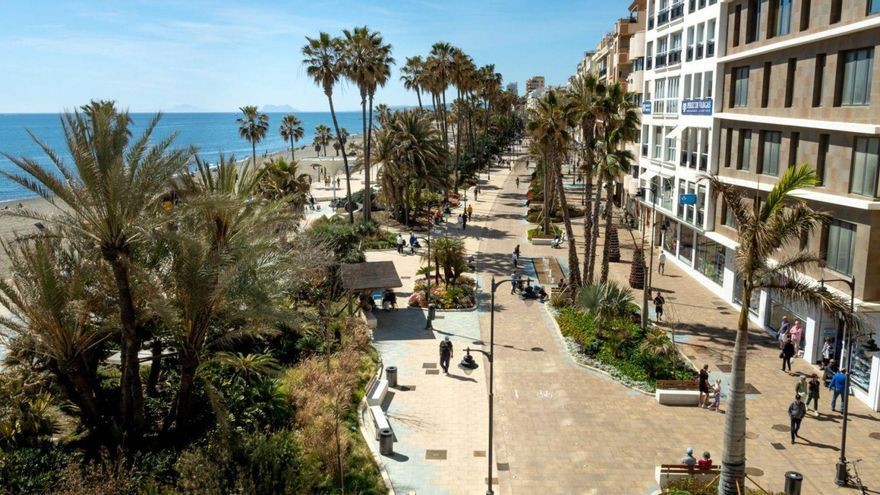 - This first-floor apartment, located in the exclusive Paseo Maritimo area in the center of Estepona, stands out for its side sea views and direct access to the promenade. Fully renovated and ready to move in, the property offers a privileged location just a few meters from the beach and close to all essential services such as shops, restaurants, schools, and public transport. The main area of the property consists of an open-plan living room with an integrated dining area, providing a spacious and bright atmosphere. The parquet flooring and large windows with glass doors add warmth and light to the space. The kitchen, fully equipped and designed in an open-plan style with a peninsula, is integrated into the social area, facilitating interaction and optimal use of space. From the living room, there is access to a balcony-style terrace of approximately 7m², ideal for enjoying the side sea views and the Costa del Sol climate. The apartment features two bedrooms, both with built-in wardrobes and modern finishes. The master bedroom has a large private bathroom with a spacious shower, while the second bathroom is also fully equipped and maintains the same contemporary design. Finishes include porcelain flooring in wet areas and double glazing on all windows, ensuring comfort and efficiency. Additional features include air conditioning, reinforced entrance door, elevator in the building, and direct access to the promenade. The apartment is delivered fully furnished and in excellent condition, with all elements recently renovated. Furthermore, the property is close to all urban amenities such as shops, the port, schools, and restaurants, making daily life in the center of Estepona by the sea convenient and enjoyable.