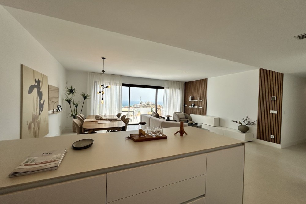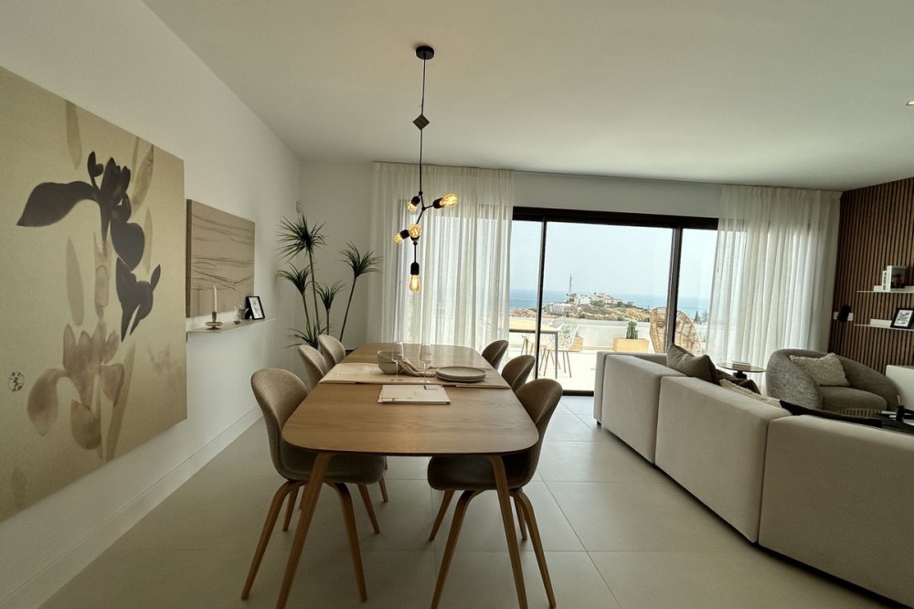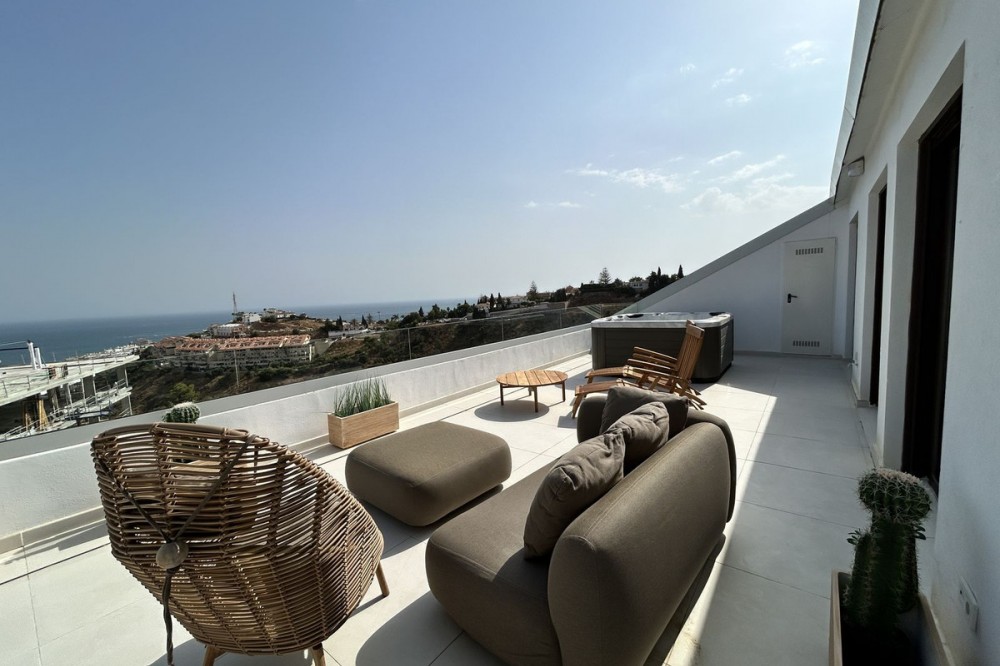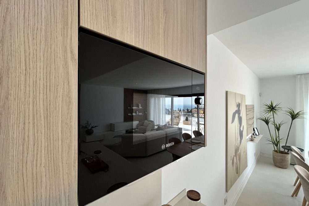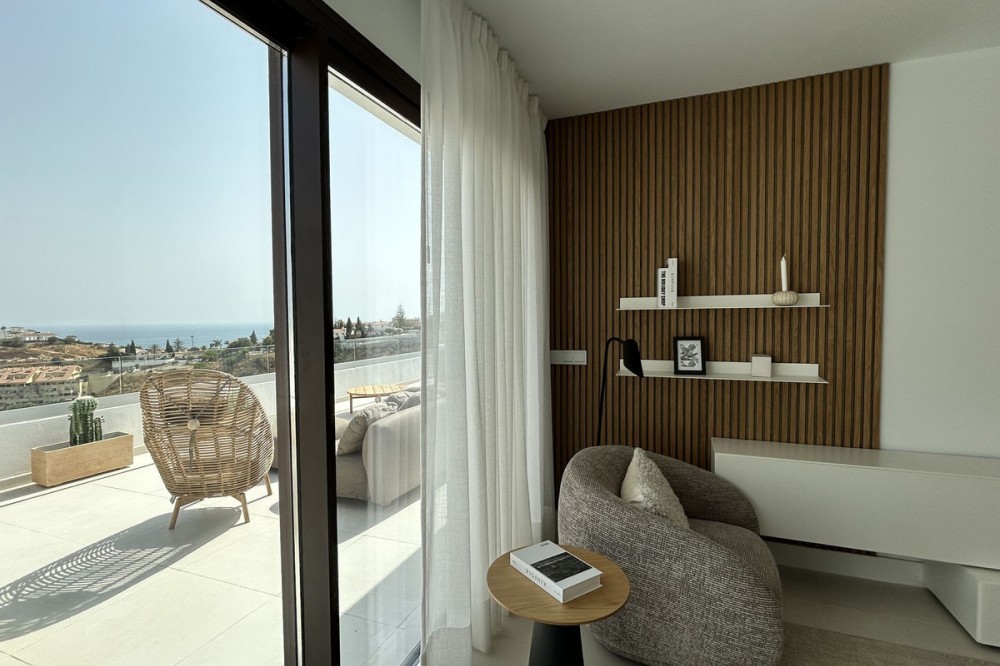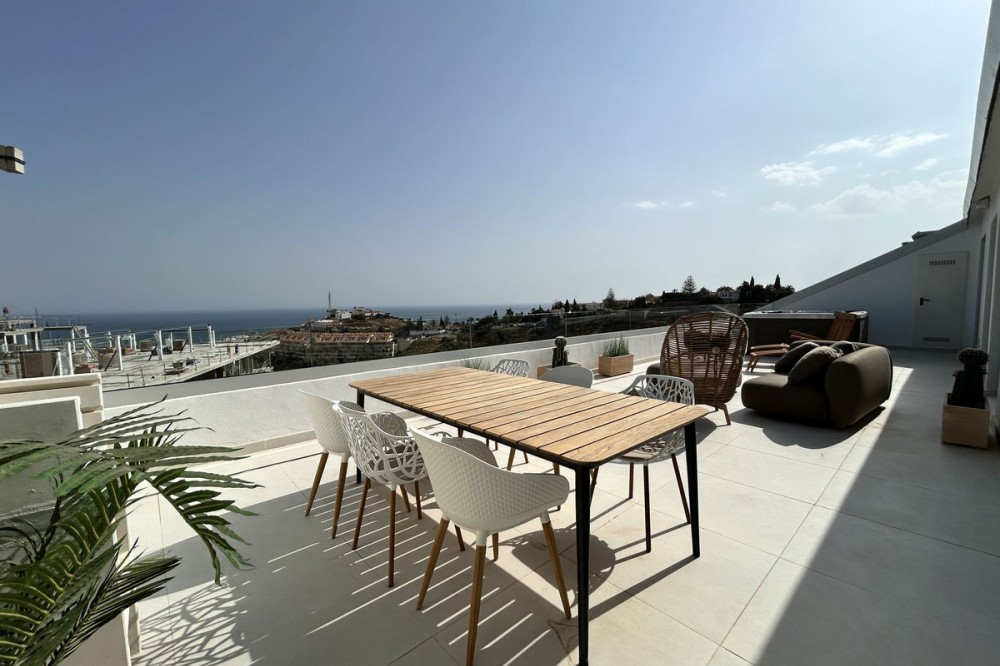 - This exclusive, brand-new penthouse with three bedrooms and a large south-facing terrace with sea and mountain views is fully furnished with high-end designer pieces by Ikonia Ilusion&Arte, which stands out for its thoughtful lighting and maximum sense of spaciousness. It features home automation and smoke detection sensors, as well as Jung mechanisms. The kitchen, equipped with wall and base cabinets, Silestone countertops, and paneled appliances with A-grade energy efficiency, includes a stove, oven, microwave, hood, refrigerator, dishwasher, and washer-dryer. The bathrooms feature wall-hung toilets, extra-flat shower trays with screens, and, in the master bathroom, a double sink with integrated cabinetry. With an open-plan concept, the living room and kitchen are integrated and extend onto a spacious terrace through large, high-performance sliding windows, creating a seamless connection between the interior and exterior. Its features include an air-source heat pump system for heating and cooling, underfloor heating in bathrooms, aluminum/PVC exterior carpentry with double-glazed thermoacoustic and security windows, and pre-installed motorized blinds in the bedrooms and living room. Large-format porcelain tile flooring extends throughout the home. Lined built-in wardrobes and glass railings on the terraces provide elegance and security. The complex emphasizes sustainability with thermal insulation and pre-installation for an electric vehicle charger. Two parking spaces and a storage room are included. Located in an exclusive residential area of Higuerón, Fuengirola, offering extensive gardens, an outdoor pool, a solarium, and a jacuzzi: a true Mediterranean paradise in full expansion, surrounded by nature and perfectly connected. Don't miss this turnkey opportunity to experience the Mediterranean from day one and make a high-value investment in a premium location. The buyer is exempt from agency fees. The price does not include any expenses arising from the purchase and sale process, such as notary fees, registration fees, or transfer taxes.