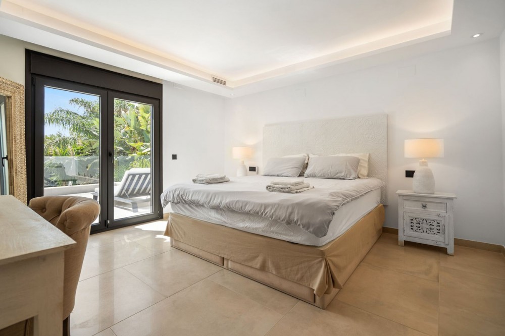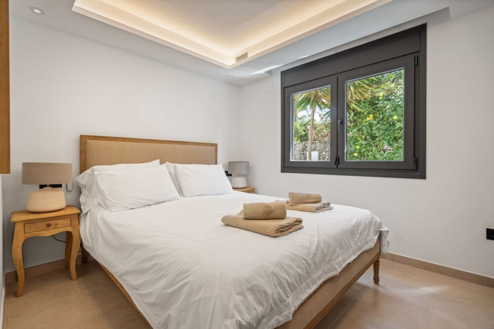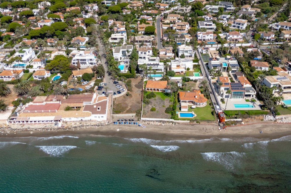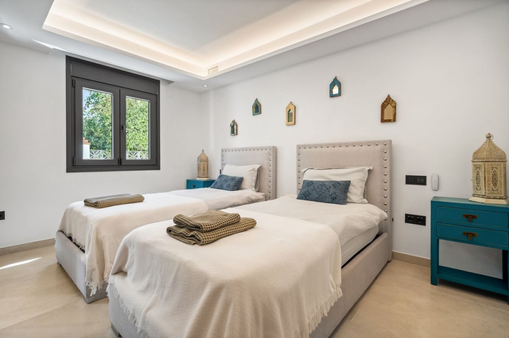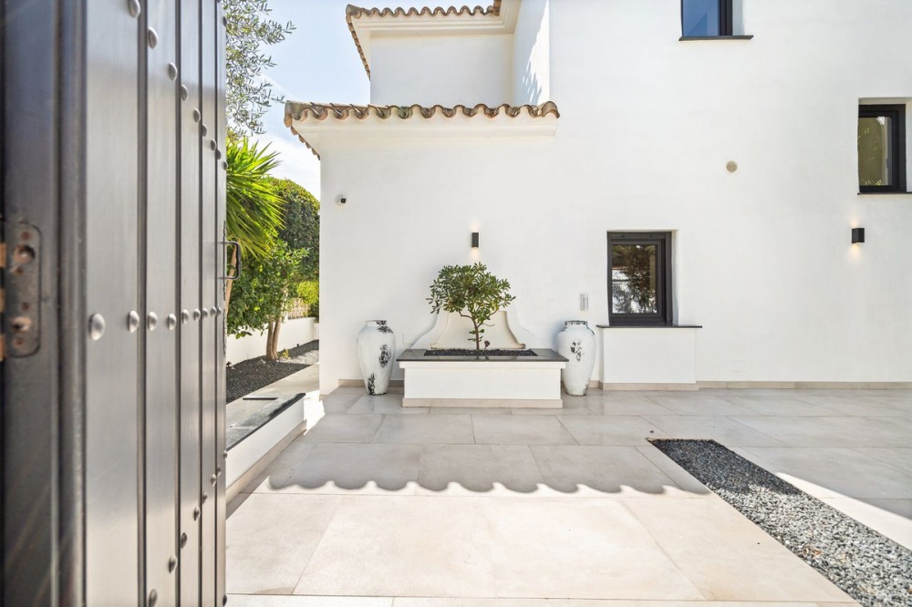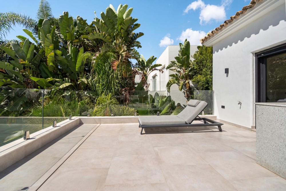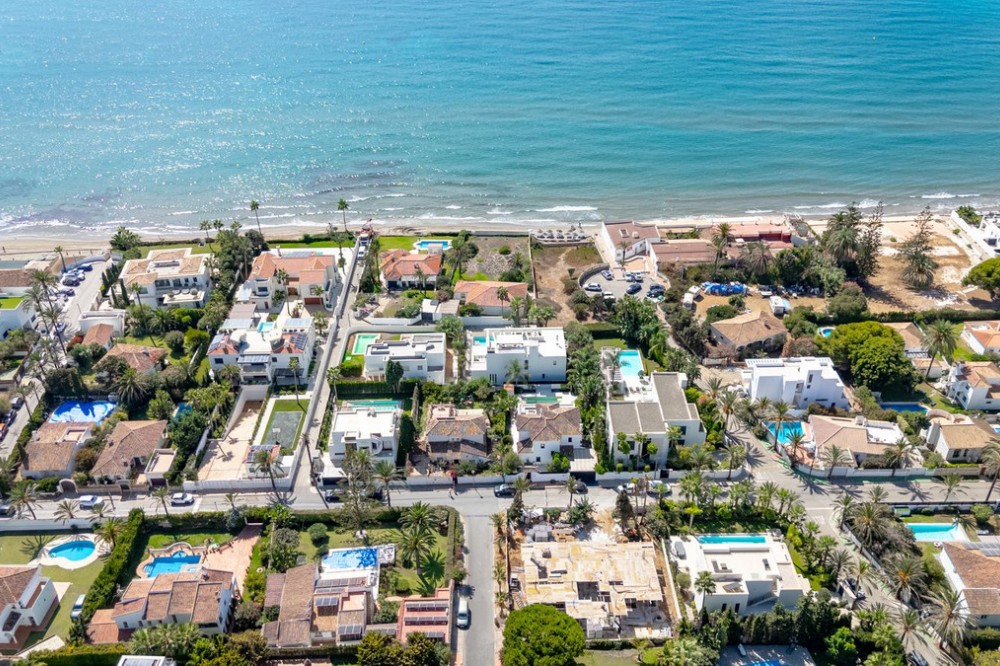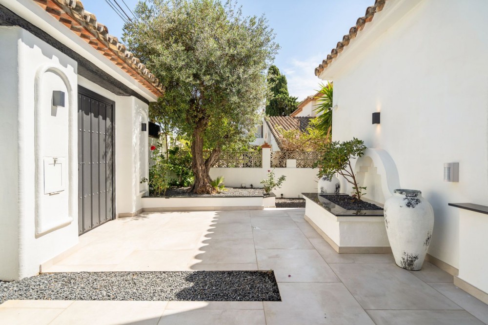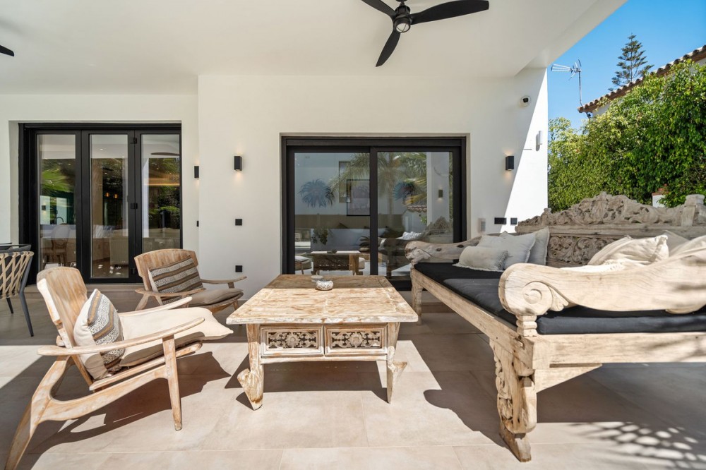 - This outstanding luxury villa, fully renovated to the highest standards in 2022, is located just 200 metres from the beach in Marbesa—one of Marbella’s most prestigious and sought-after residential areas, ideally positioned near Elviria and the charming port of Cabopino. Occupying a south-facing plot of 527 m², the property offers 344 m² of elegant living space across two floors, perfectly complemented by expansive outdoor areas designed for refined year-round living. The main level welcomes you with an inviting entrance hall leading into a luminous open-plan kitchen, dining and living area with fireplace and a cosy snug alongside a guest toilet. This floor also includes two spacious bedrooms with fitted wardrobes, a stylish bathroom, laundry room and storage. The upper level features a sophisticated chill-out lounge with sofa and TV, two large and luxurious en-suite bedrooms, one with a walk-in wardrobes and the other with fitted wardrobes. Both bedrooms and the chill out area have access to a generous sun-drenched terrace overlooking the garden. Outdoors, the villa embraces an authentic Mediterranean lifestyle with mature greenery and fruit trees including lemon, orange and pomegranate, enhanced by an 8 × 4 m private swimming pool, multiple elegant chill-out areas, and a covered patio. There is a covered area with parking for two cars. Modern comforts include underfloor heating, air conditioning, electric shutters, a professional security system, alarm and video intercom—ensuring the highest level of comfort and peace of mind. Ideally situated in Marbella East, this exceptional property offers the perfect balance of serenity and convenience, with prestigious golf clubs, international schools, and some of the Costa del Sol’s finest beaches, beach clubs and restaurants just moments away. A truly remarkable residence for those seeking luxury, exclusivity, and the ultimate Marbella lifestyle.