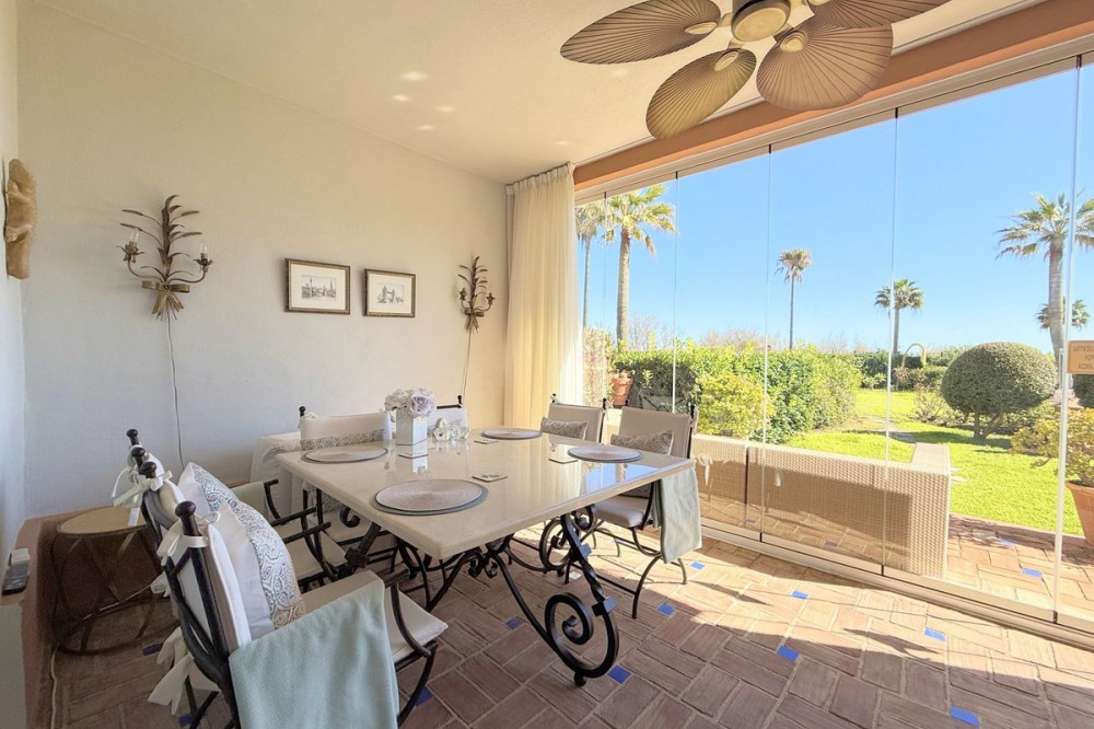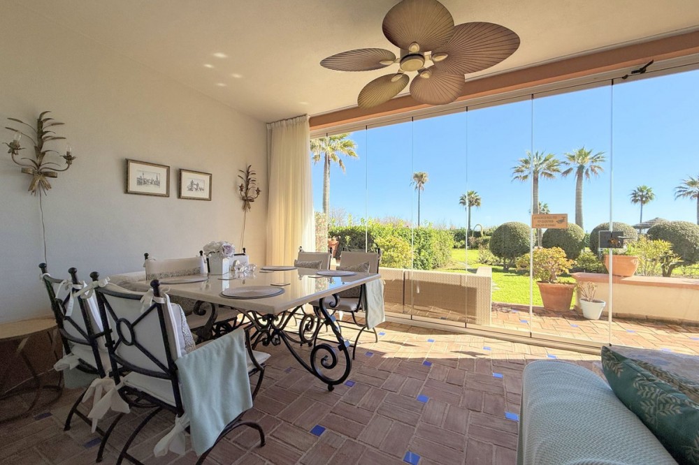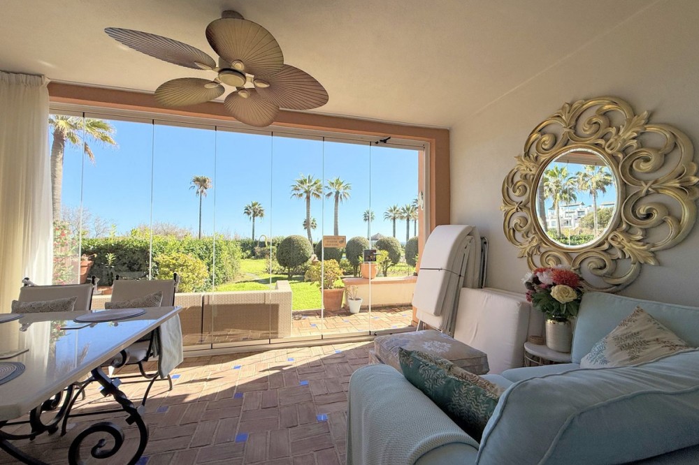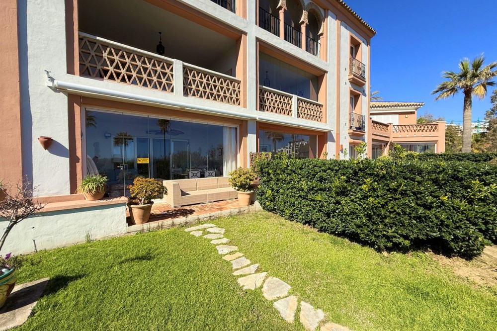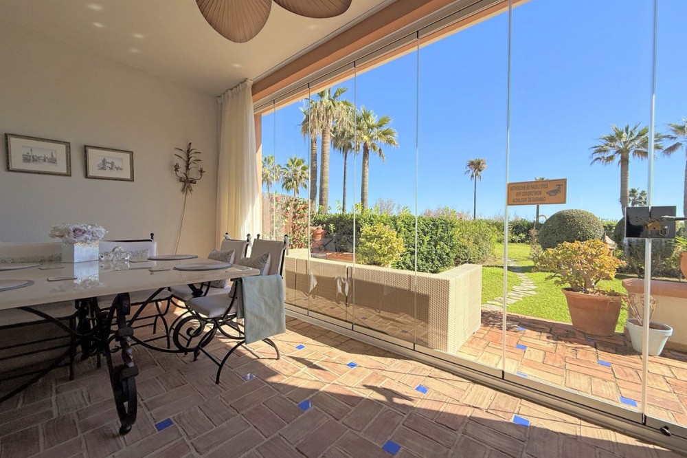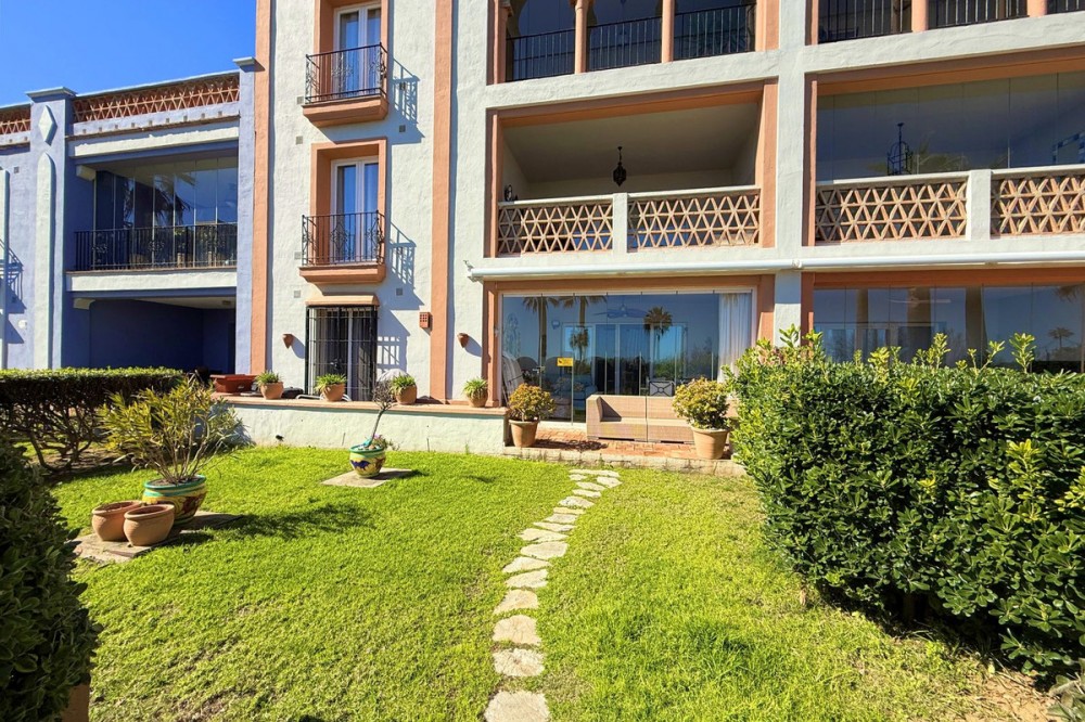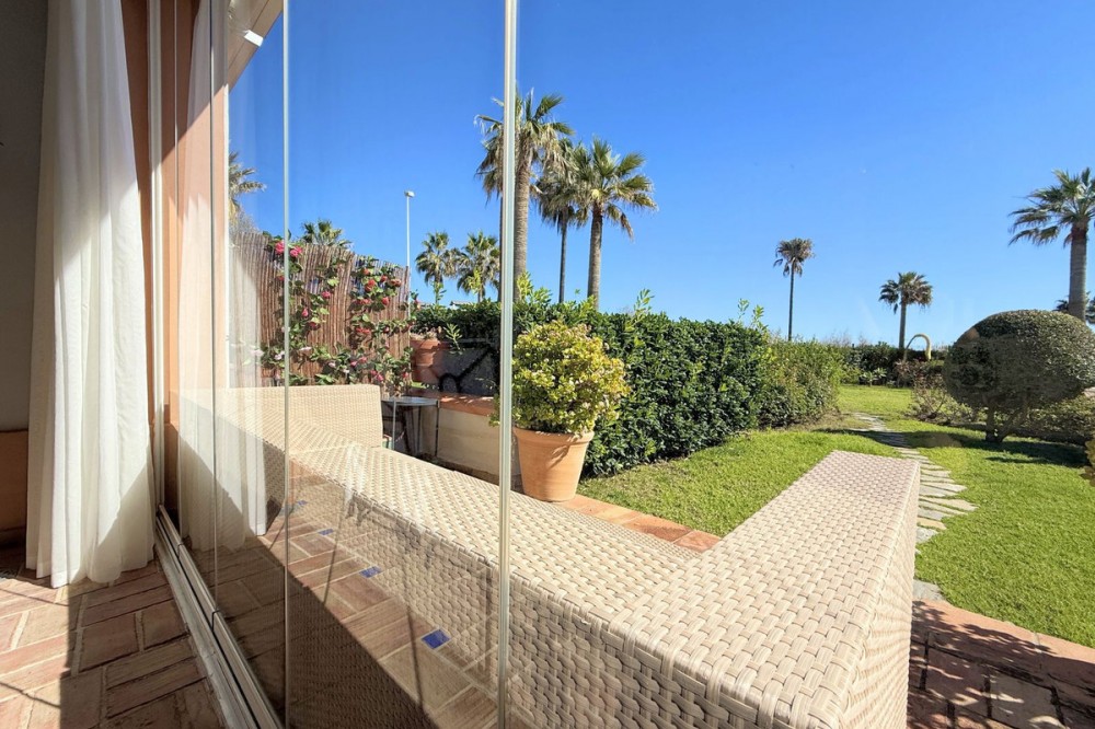 - Magnificent apartment in a luxury complex on the beachfront, with a terrace and private garden, located in Casares Playa, within a prestigious development featuring a charming Moorish design inspired by the essence of Al-Andalus. Enjoy direct access to the promenade and the stunning local beaches, with a wide selection of restaurants, beach bars, and leisure areas. Situated in a privileged location between Estepona and Puerto de la Duquesa, just a five-minute drive from both, it offers the perfect combination of exclusivity, comfort, and Mediterranean lifestyle. Its south-facing orientation ensures abundant natural light throughout the day, creating a warm and welcoming atmosphere in every room. Recently renovated, the property stands out for its careful decoration and excellent condition, ready to move in. The kitchen, updated in 2023, features Siemens appliances, ivory-colored marble floors, and all windows fitted with mosquito screens. The apartment is all on one level, with two spacious and bright bedrooms designed for maximum comfort and rest. A cozy living-dining area with a fireplace opens onto the enclosed glass terrace overlooking the garden, the communal pool, and the beach. The development offers 24-hour security, ensuring peace of mind and privacy, as well as exclusive amenities such as two magnificent pools, one of them heated, allowing year-round enjoyment. The property also includes 2 underground parking spaces and 2 storage rooms, providing convenience and extra storage. Its strategic location makes it ideal as a permanent residence or an investment, with high potential for both holiday and long-term rentals. Close to prestigious golf courses, such as Finca Cortesín, as well as marinas, restaurants, and all necessary services, this property represents a unique opportunity. If you are looking for an exclusive apartment on the beachfront, with all the comforts in one of the most sought-after areas of the coast, don’t miss this opportunity.